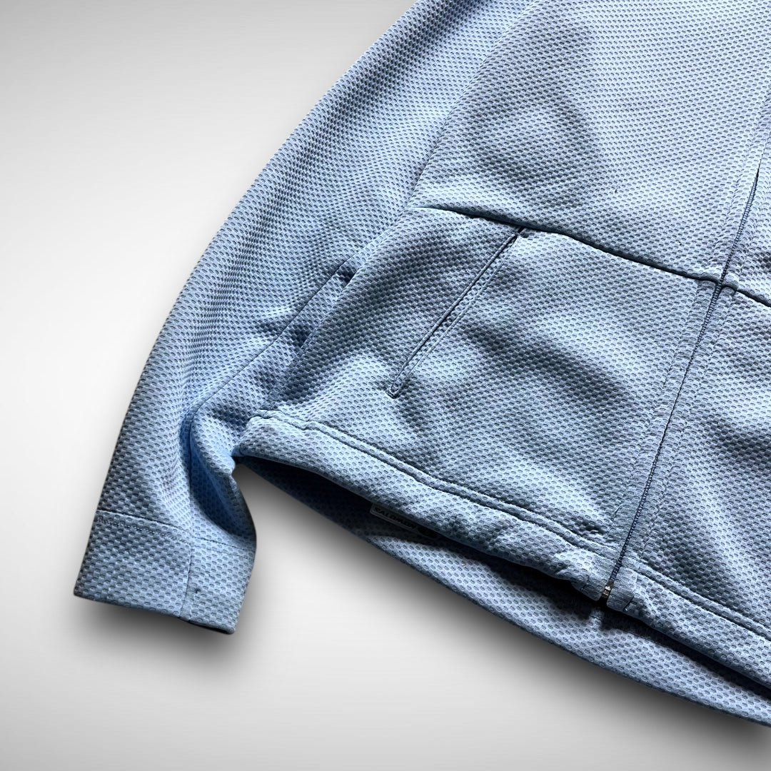 Sky blue mesh outer in ergonomic fit, accentuated pockets, mid-body and arms, Salomon script on upper arm and branding at lower-back, fleeced lining.