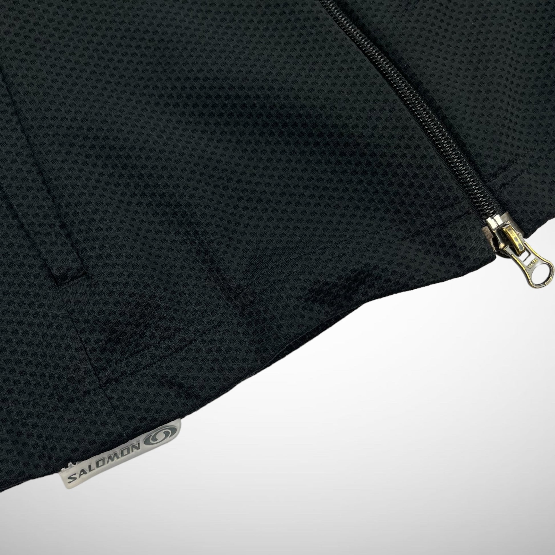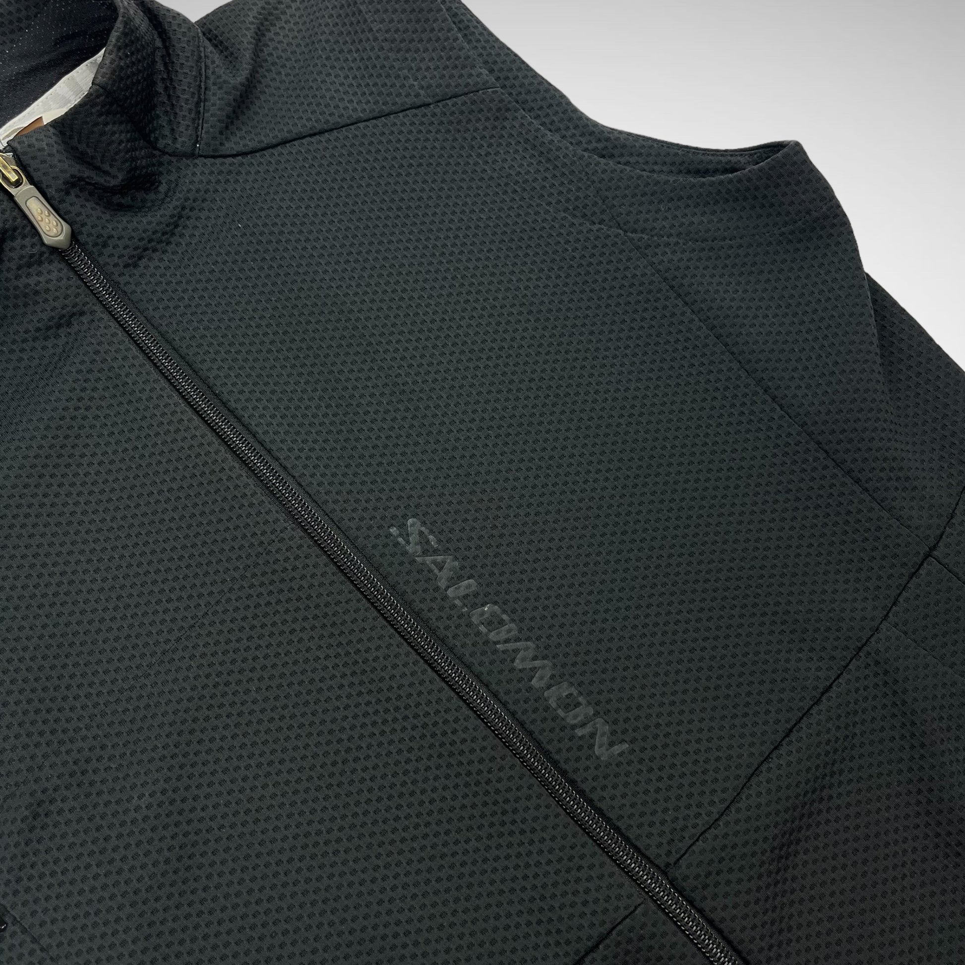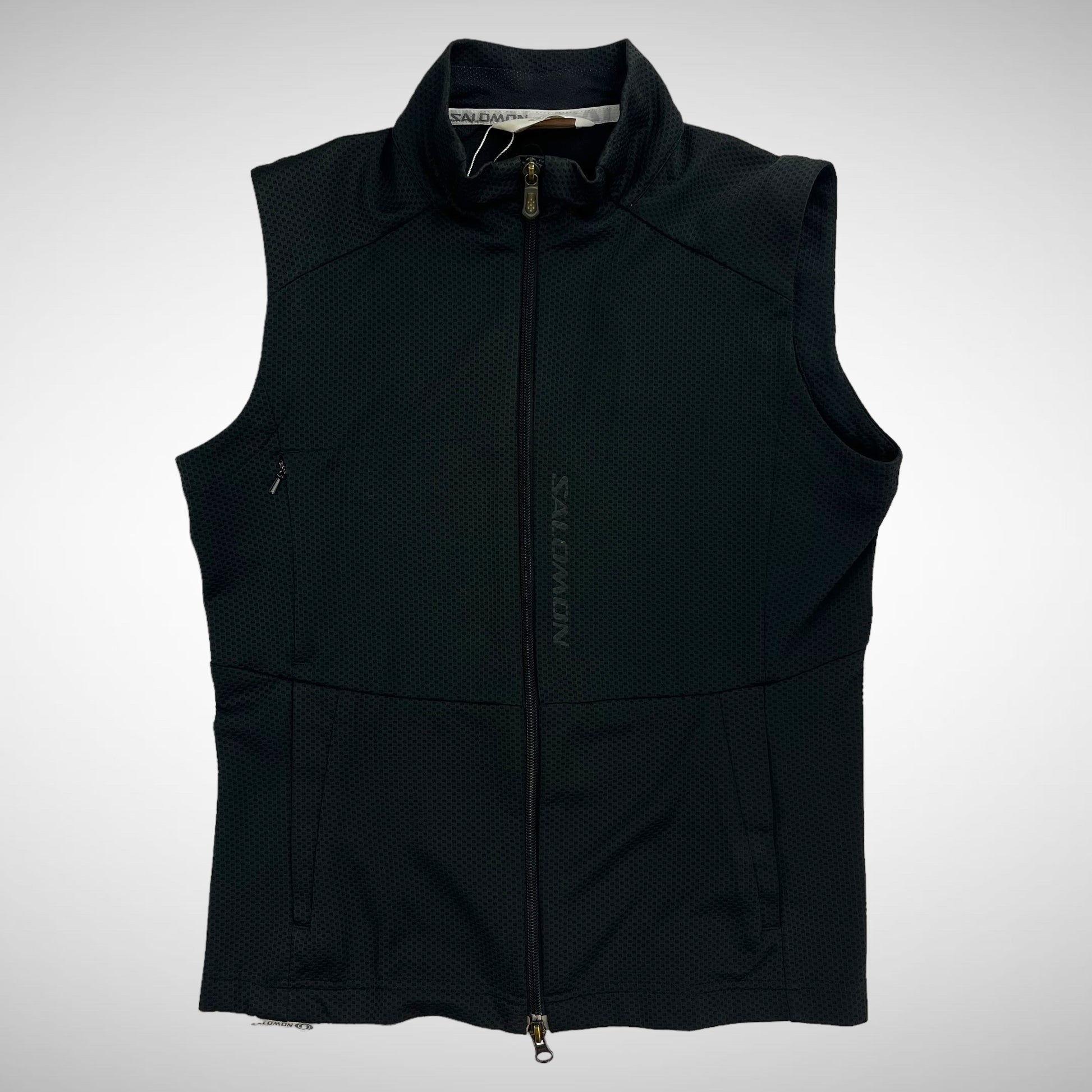 Mesh vented vest with three two lower compartments and hidden zip-pocket at chest level, Salomon print at front and back, upper neck tag, and lower front rubber tag, and two-way zip.