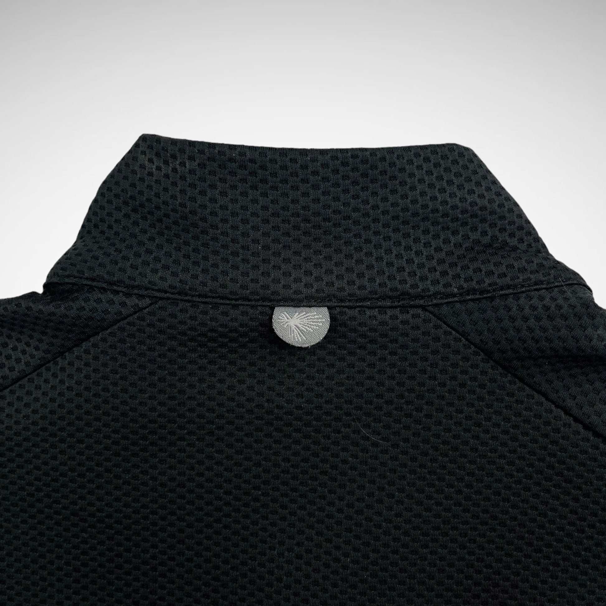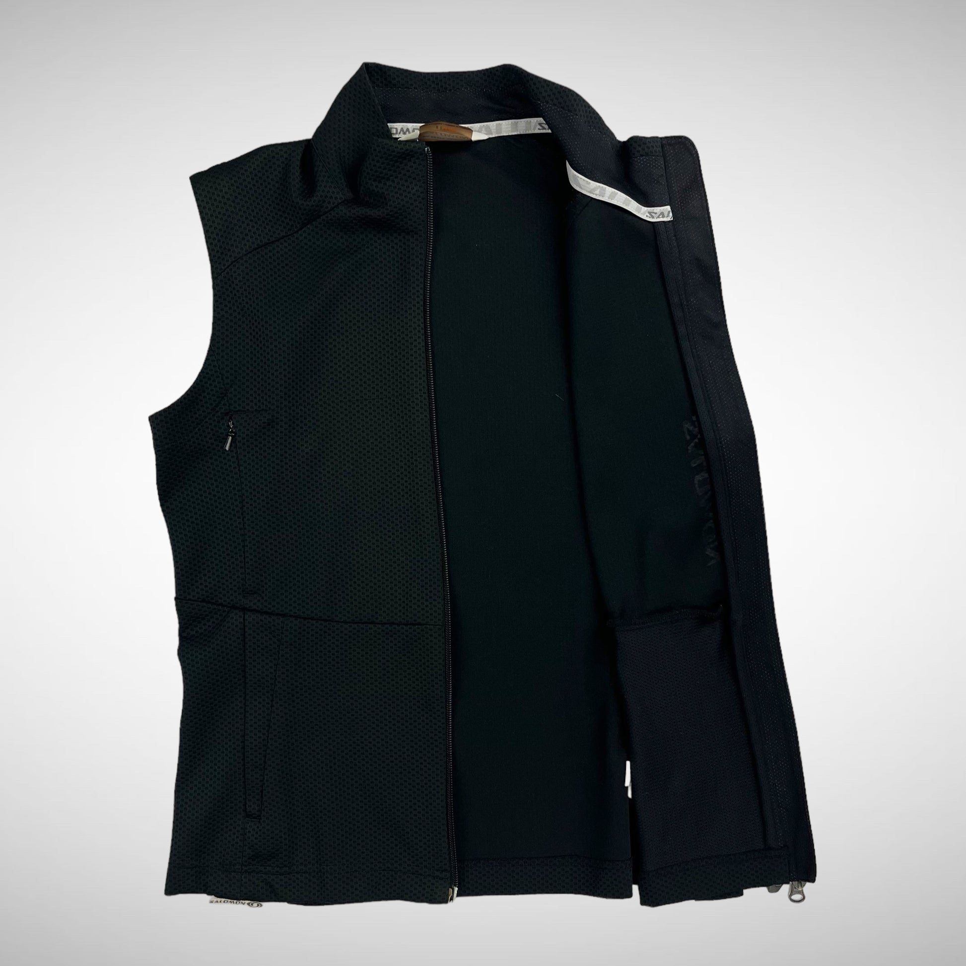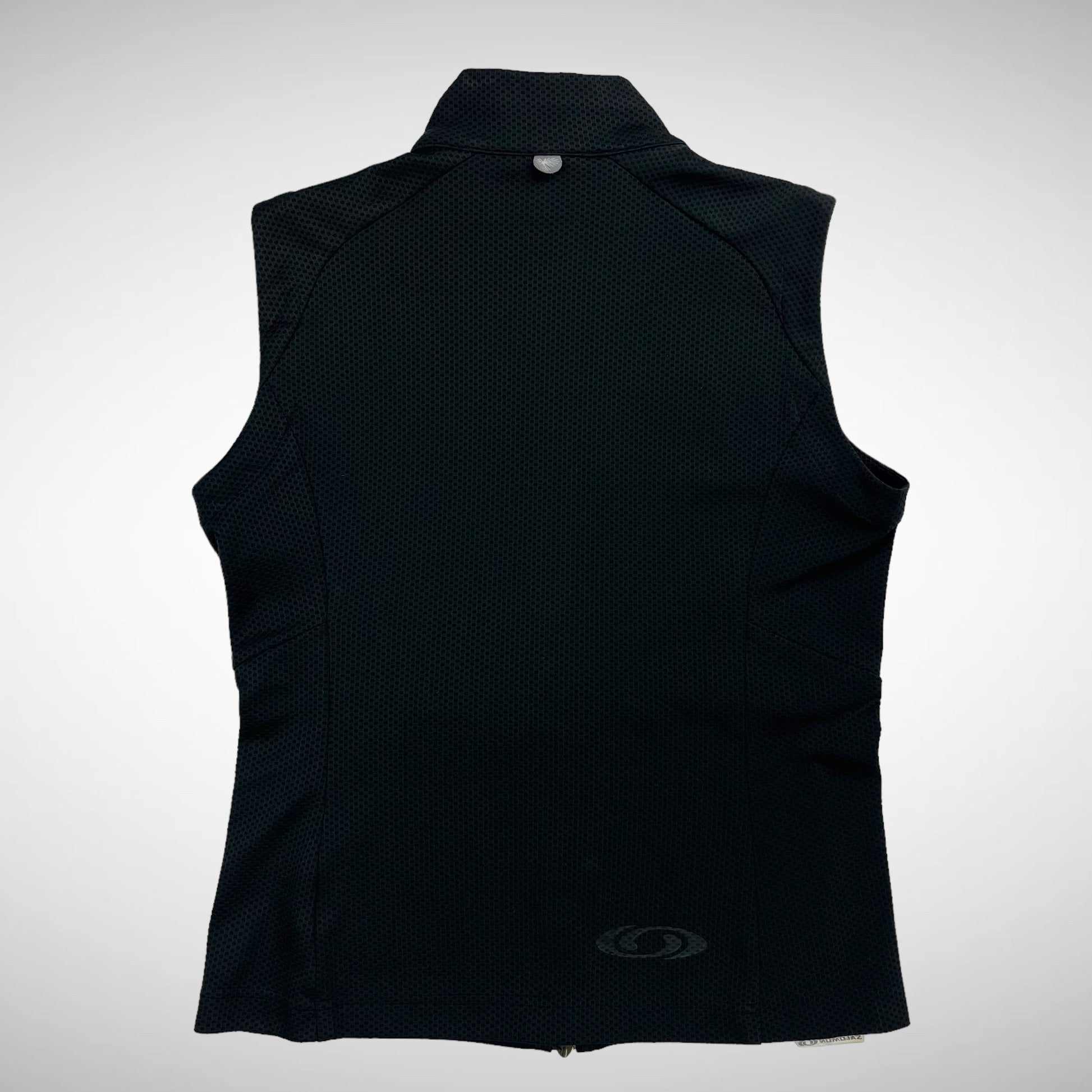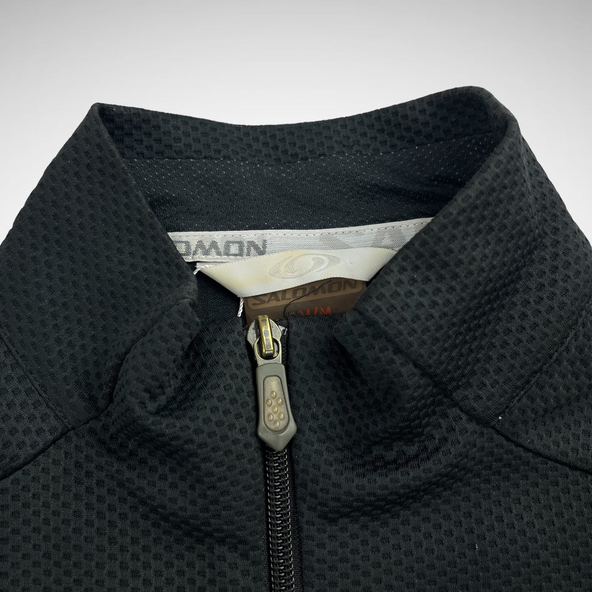 Mesh vented vest with three two lower compartments and hidden zip-pocket at chest level, Salomon print at front and back, upper neck tag, and lower front rubber tag, and two-way zip.