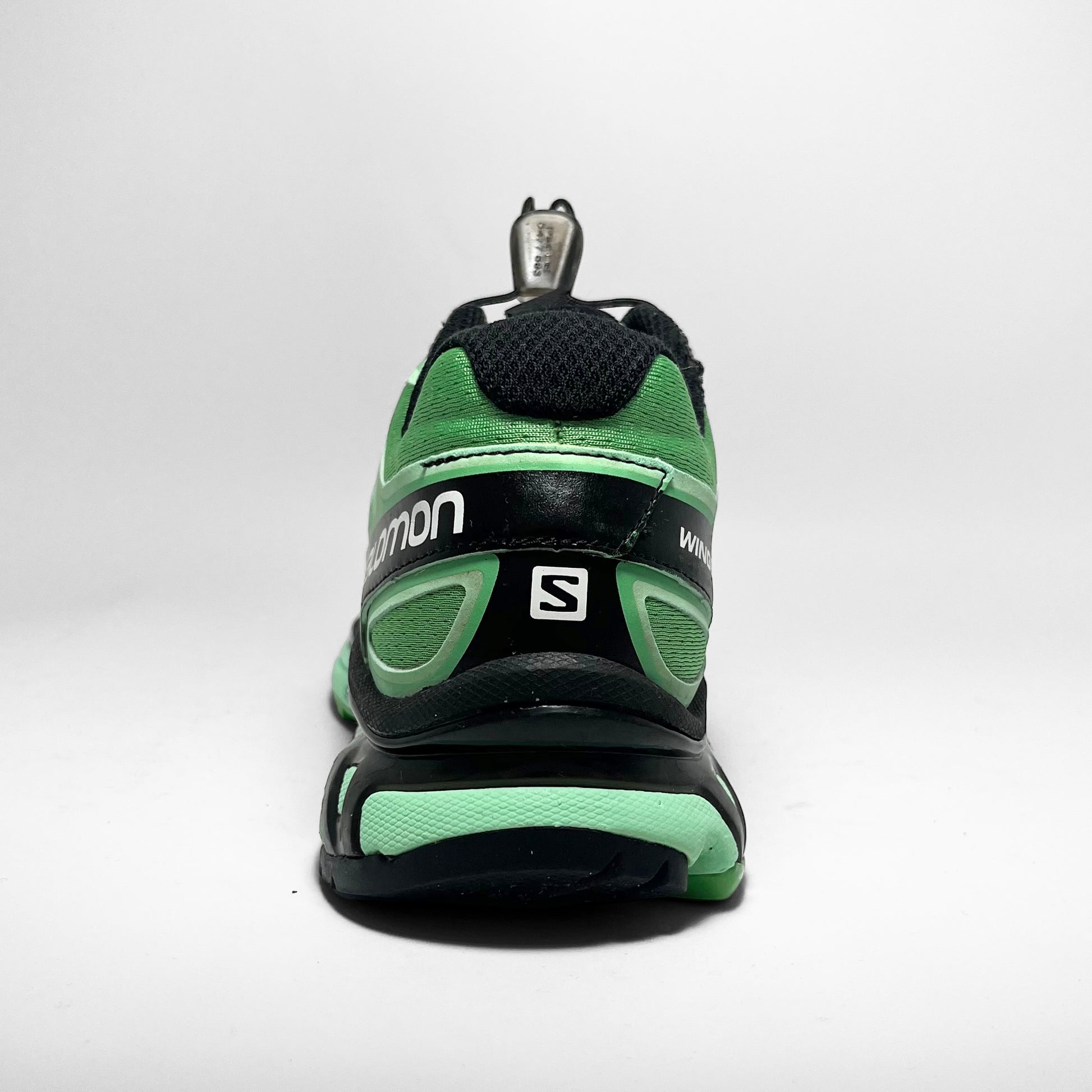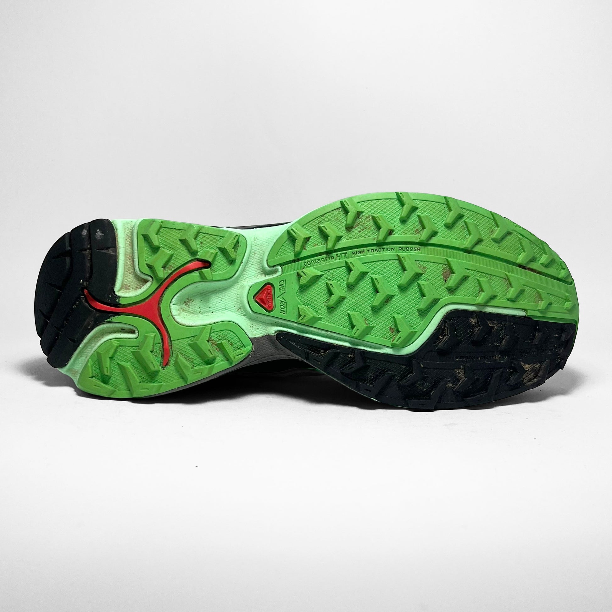 Green mesh with green overlay leather panels, darker hue printed details, white script print branding, black rubber mudguard flowing into leather panel on heel and midsole, one pull string closure with hidden-mesh pocket on tongue and trail outsole.