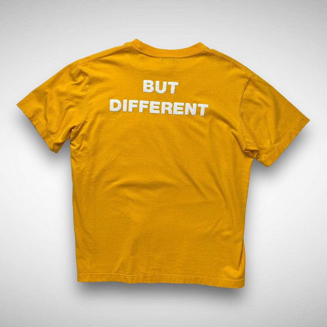 Thick 90s yellow cotton tee with contrast white print on chest and back reading: “Same Same But Different”.