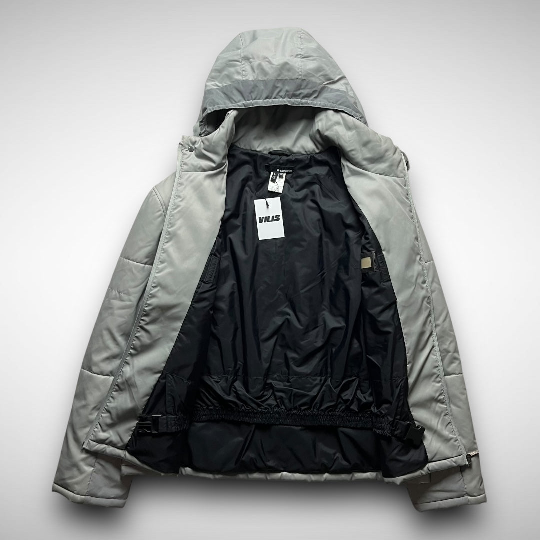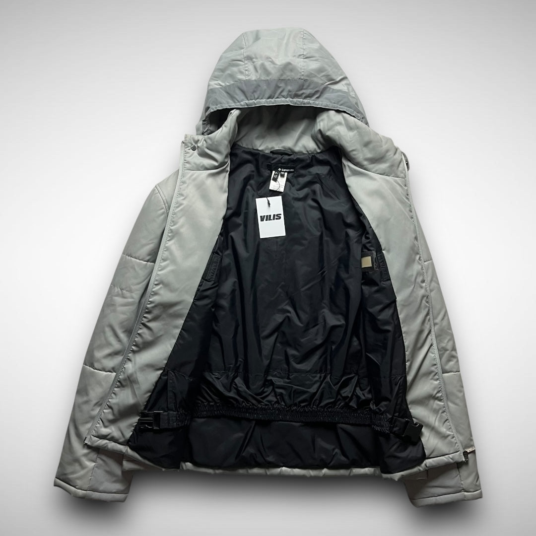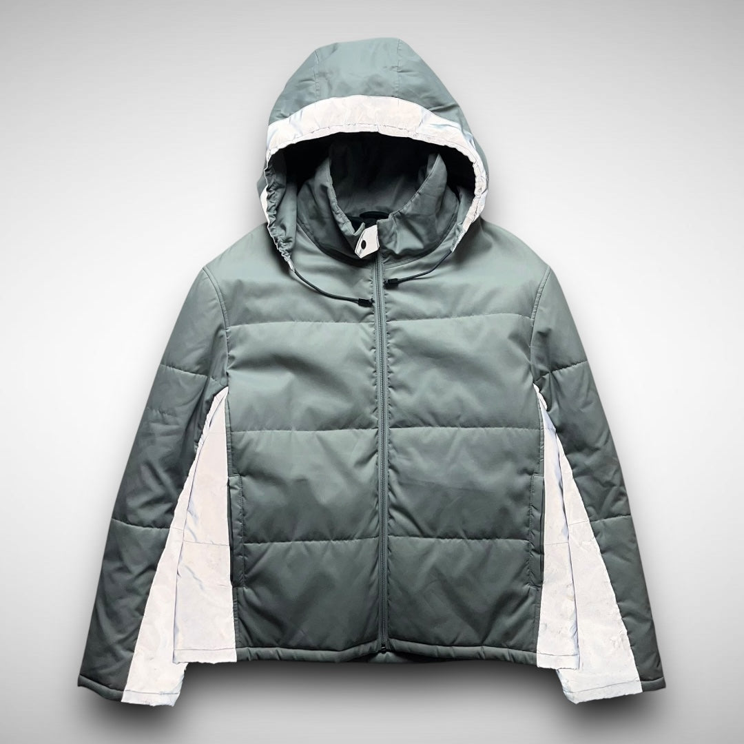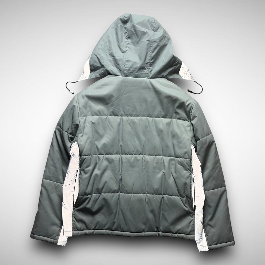 Light and dark grey colour combo with the darker toned ones being reflective, from the side panels, to the hood, inner-arms and front collar closure, elastic toggles with metal hardware to adjust hood which is foldable, double front pockets and branded zip back-side pockets, one stow-pocket and snow-catcher on the inside.