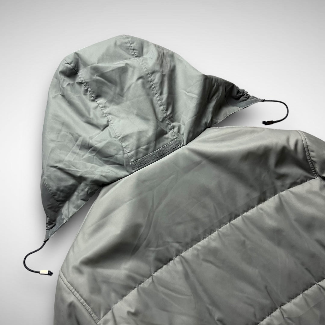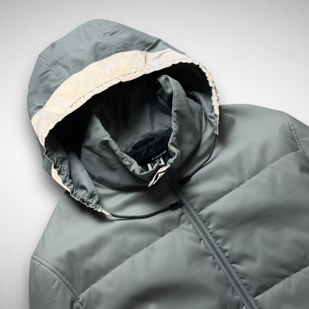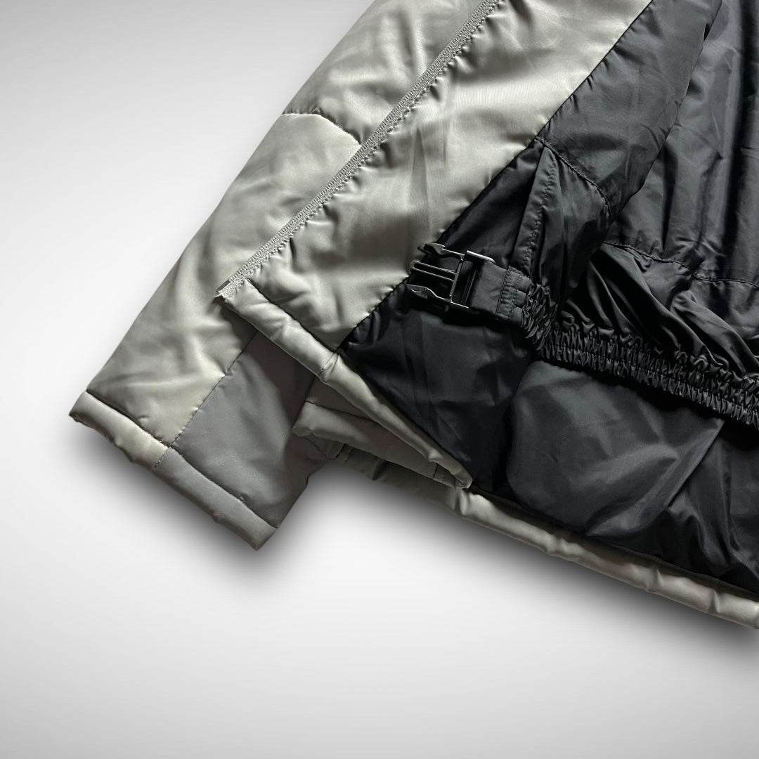 Light and dark grey colour combo with the darker toned ones being reflective, from the side panels, to the hood, inner-arms and front collar closure, elastic toggles with metal hardware to adjust hood which is foldable, double front pockets and branded zip back-side pockets, one stow-pocket and snow-catcher on the inside.