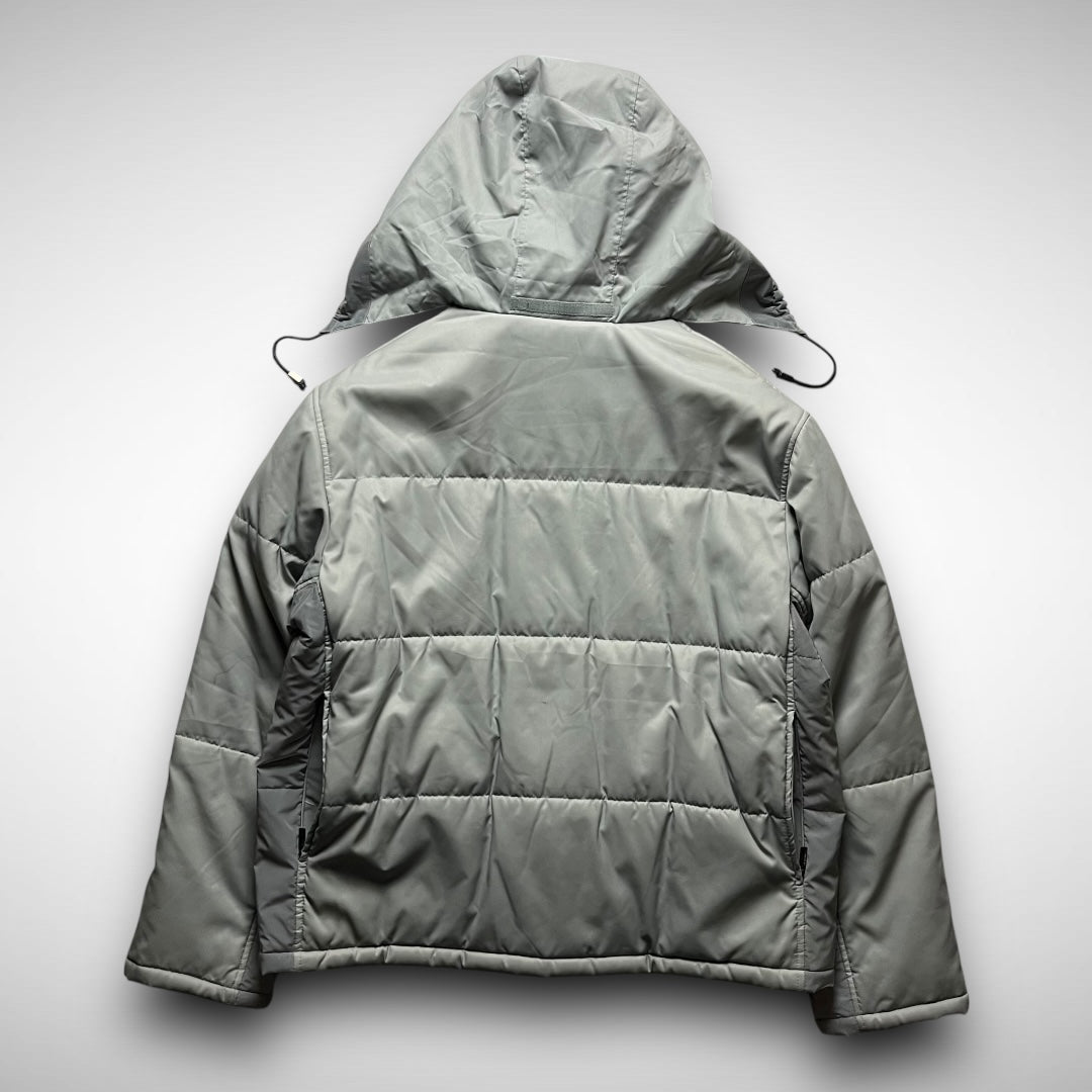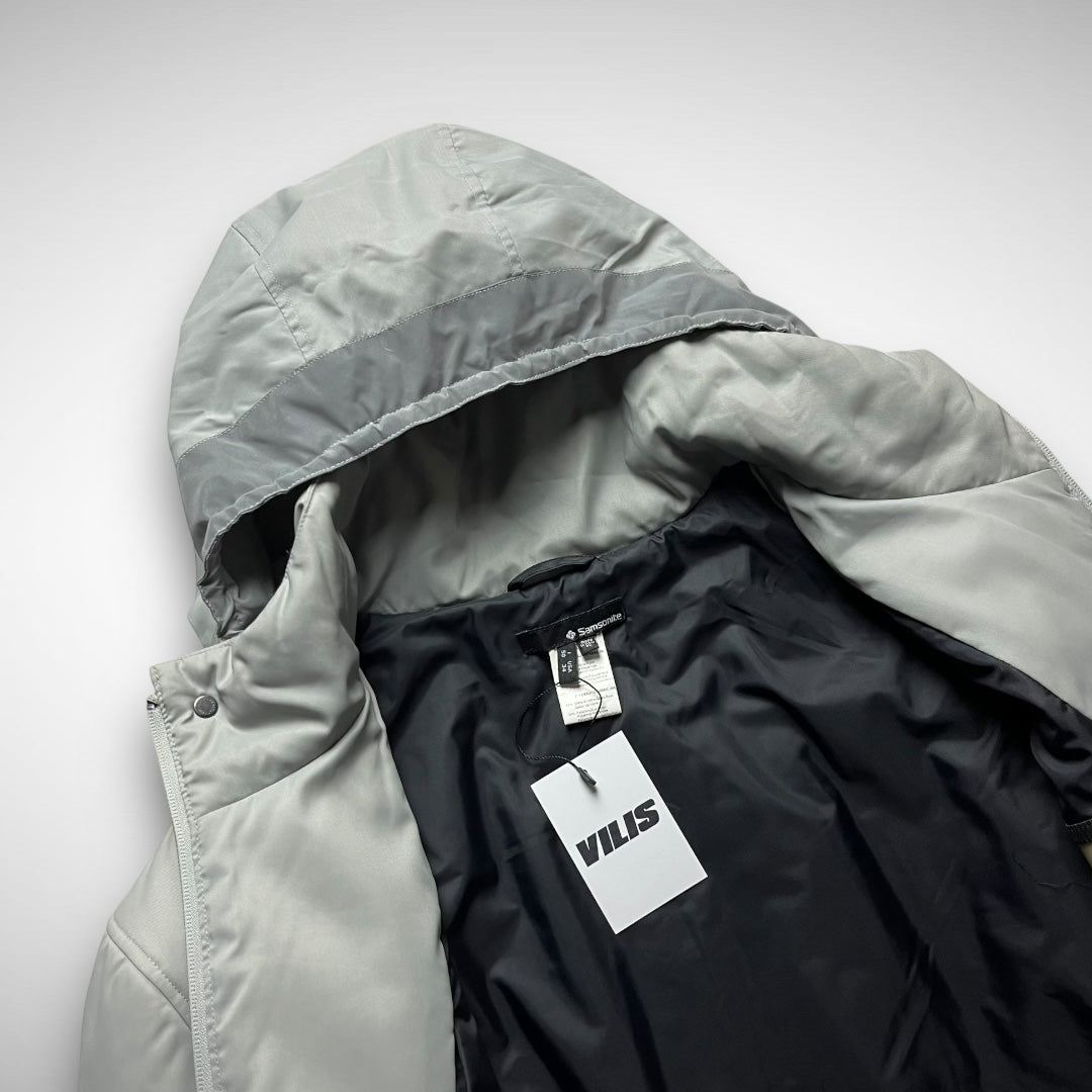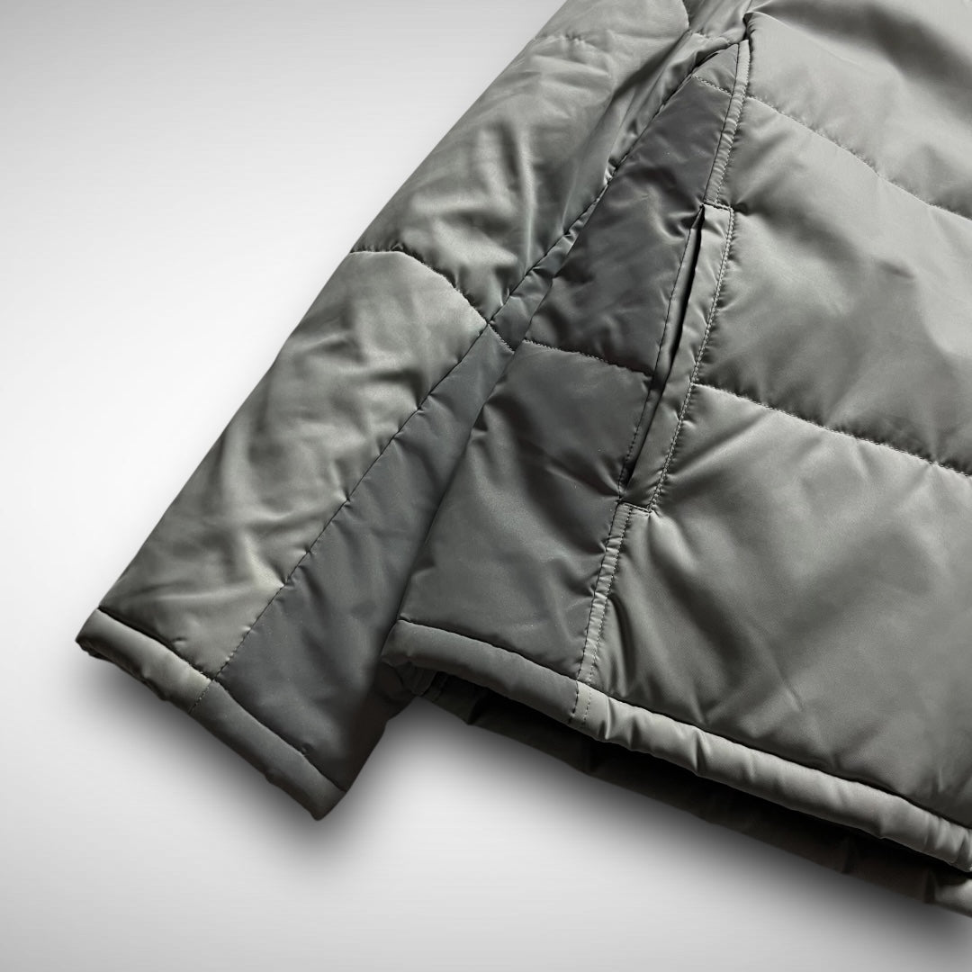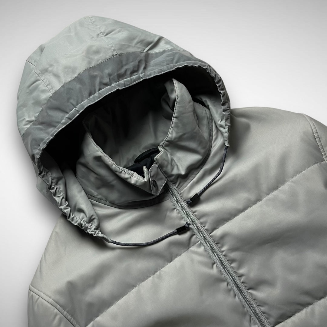 Light and dark grey colour combo with the darker toned ones being reflective, from the side panels, to the hood, inner-arms and front collar closure, elastic toggles with metal hardware to adjust hood which is foldable, double front pockets and branded zip back-side pockets, one stow-pocket and snow-catcher on the inside.
