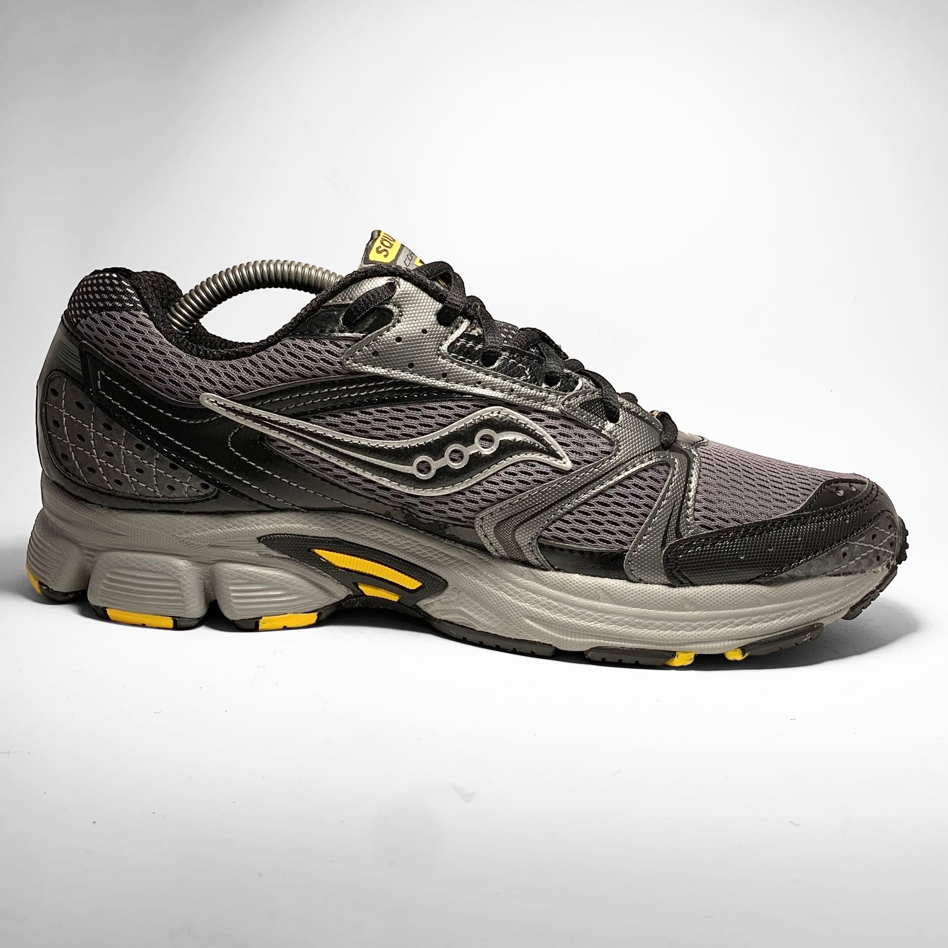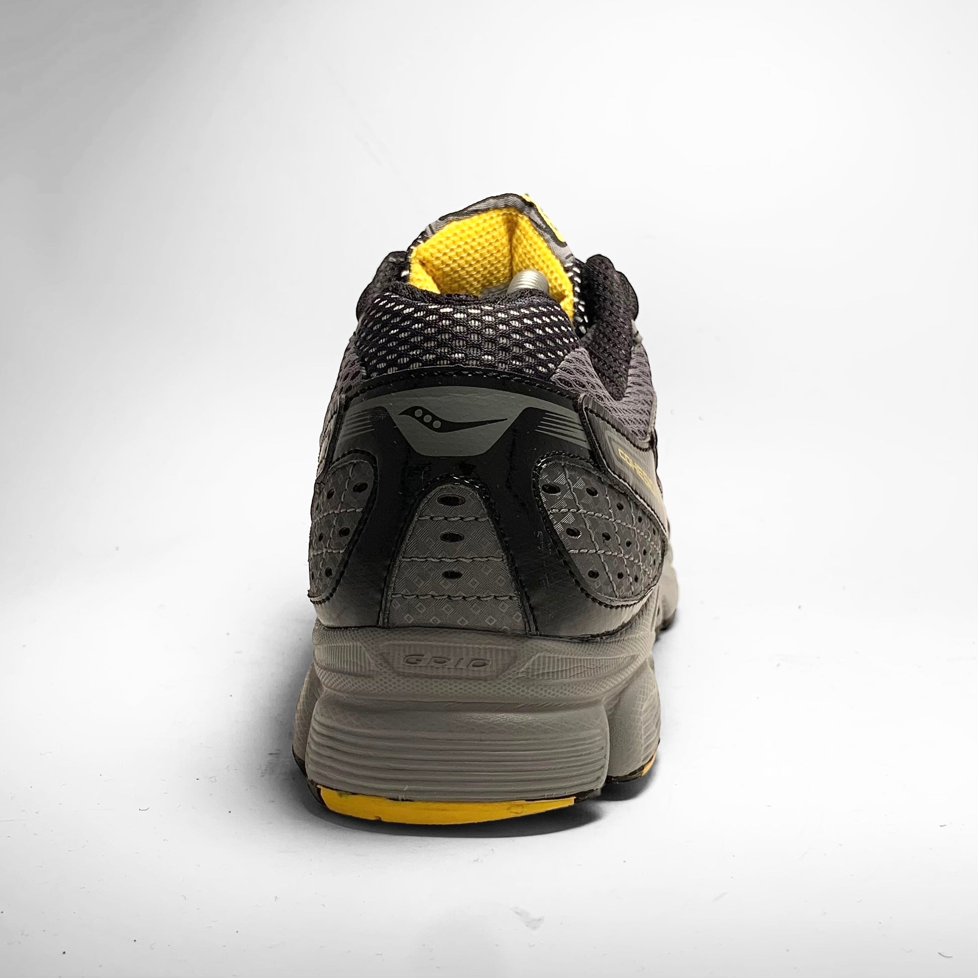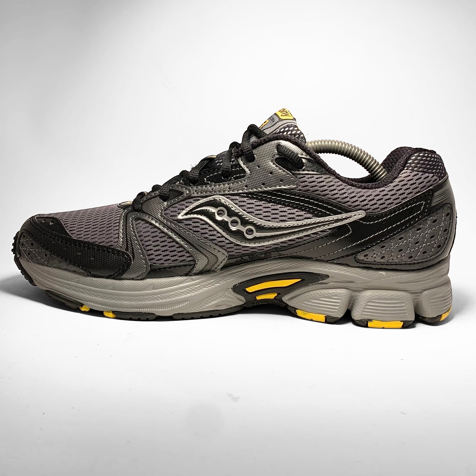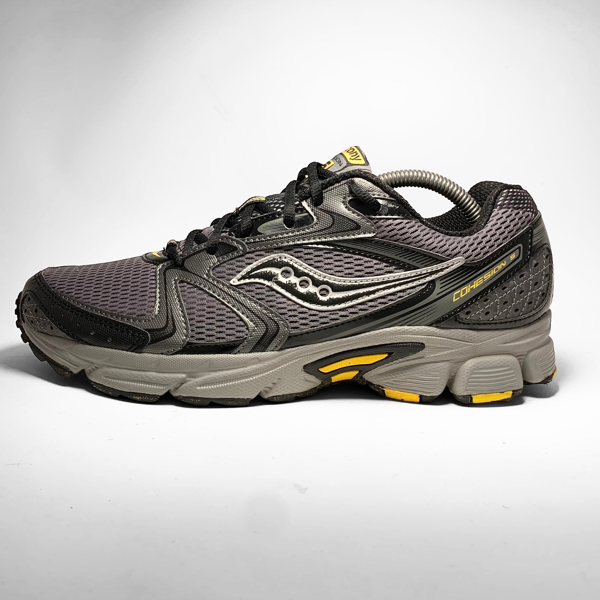 dark grey mesh base with detailed rubber and leather panels throughout in various patterns, colours, shapes, stitching details and perforated vent parts.