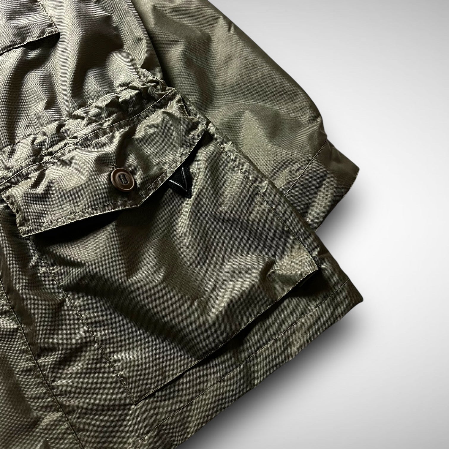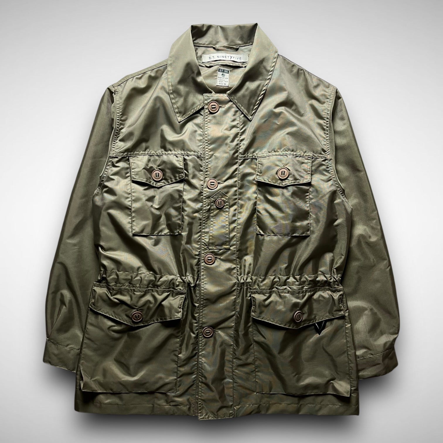Rooted in military aesthetics and elevated by the innovative vision of Massimo Osti. Crafted from a lustrous olive/copper nylon, it features a boxy field-style silhouette with articulated panels and reinforced elbow patches. Four front flap pockets, a hidden zip closure beneath a buttoned placket, and an internal drawstring waist deliver both utility and structure. The subtle black ST95 triangle logo is tucked beneath the right lower pocket, adding understated branding for those familiar with the brand’s legacy.