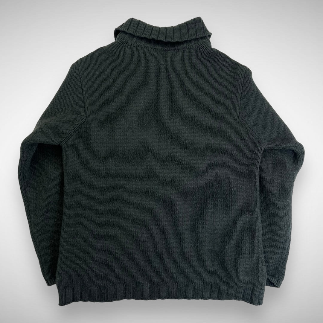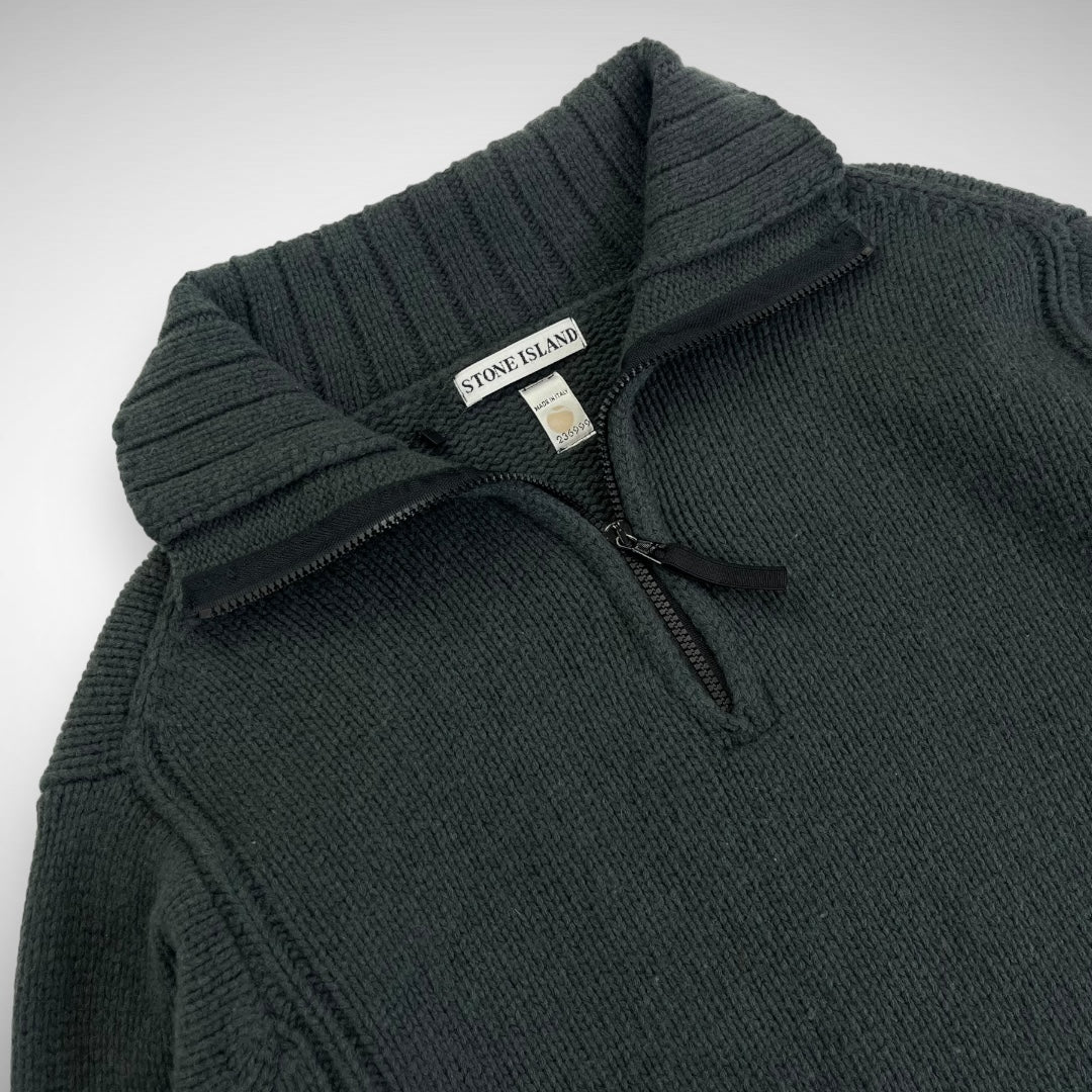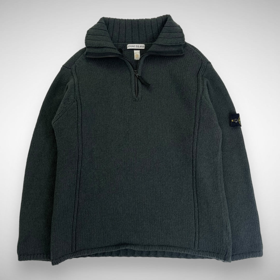 Heavy quality knit with highlighted shoulders, 1/4 zip high collar and removable badge.