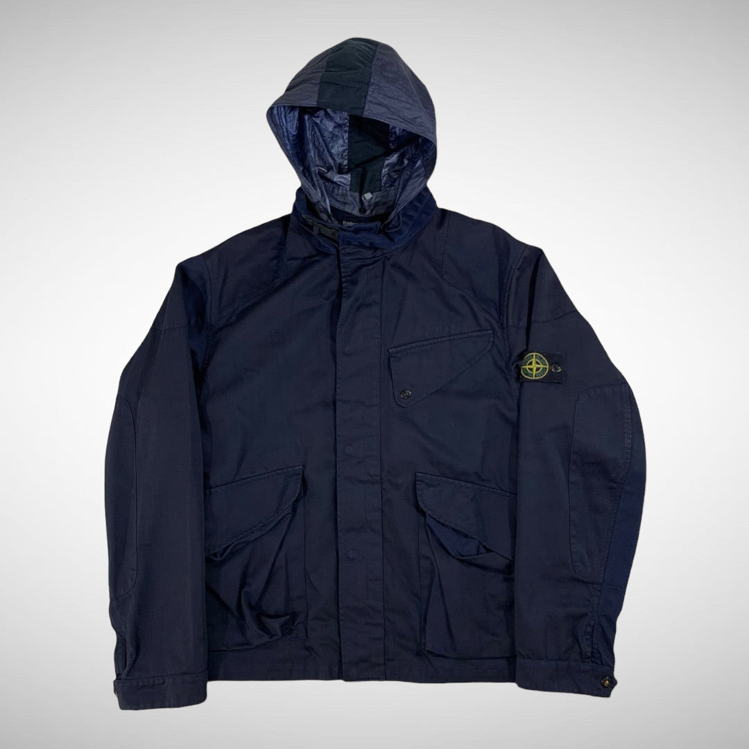 Navy outer with triple-pocketing on the front and press-button closure, adjustable cuffs and waist and stowable hood in nylon metal shimmer.