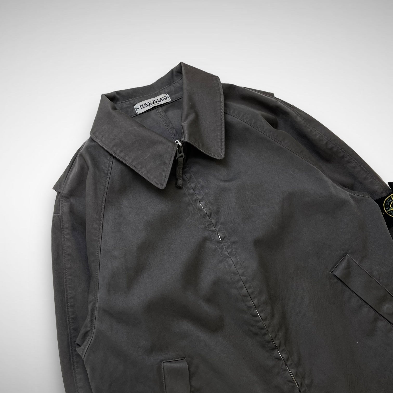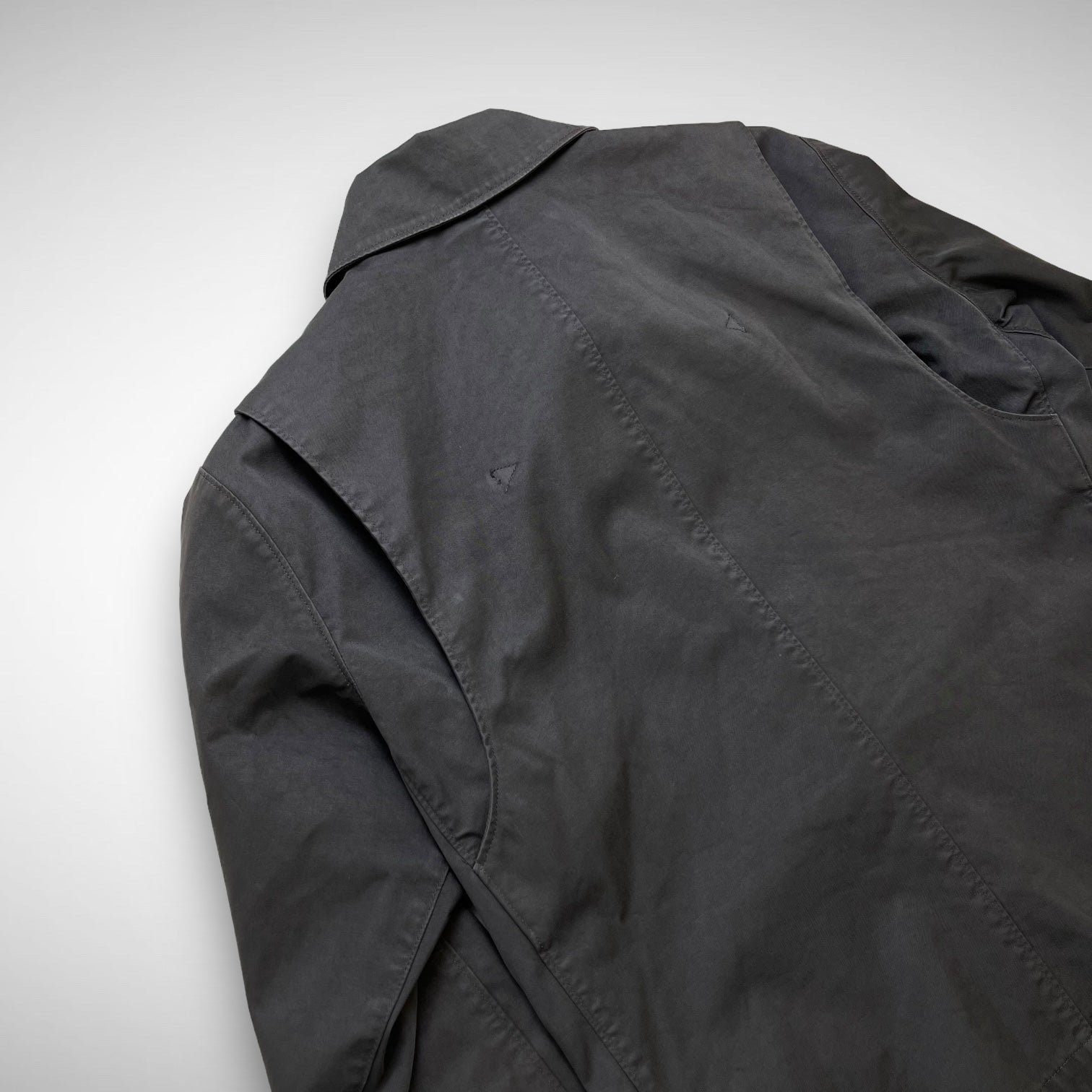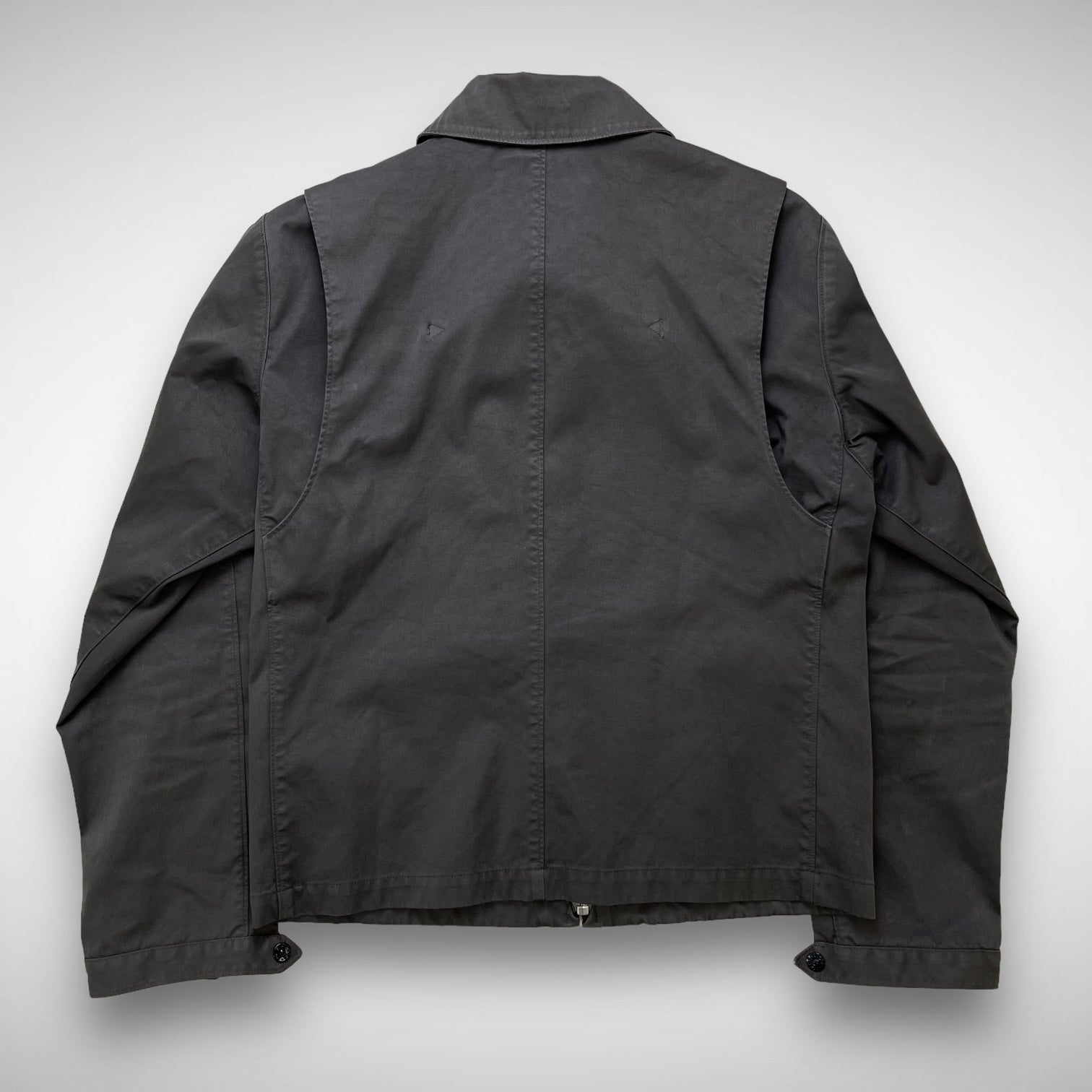 Grey toned cotton work jacket with down collar, press-stud pockets, button fastening cuffs, expandable upper-back panel to improve movability and triangle shaped stitching symbols.