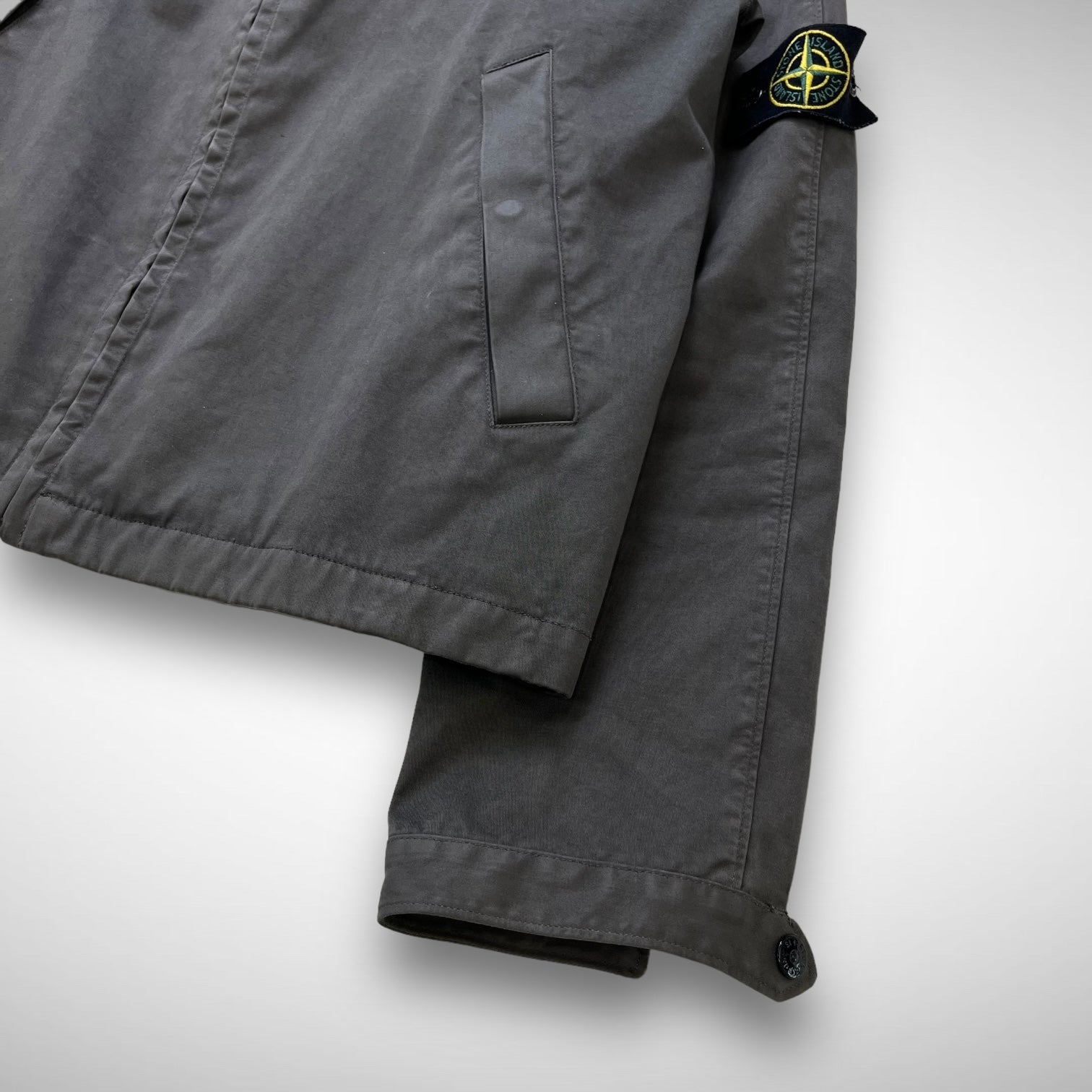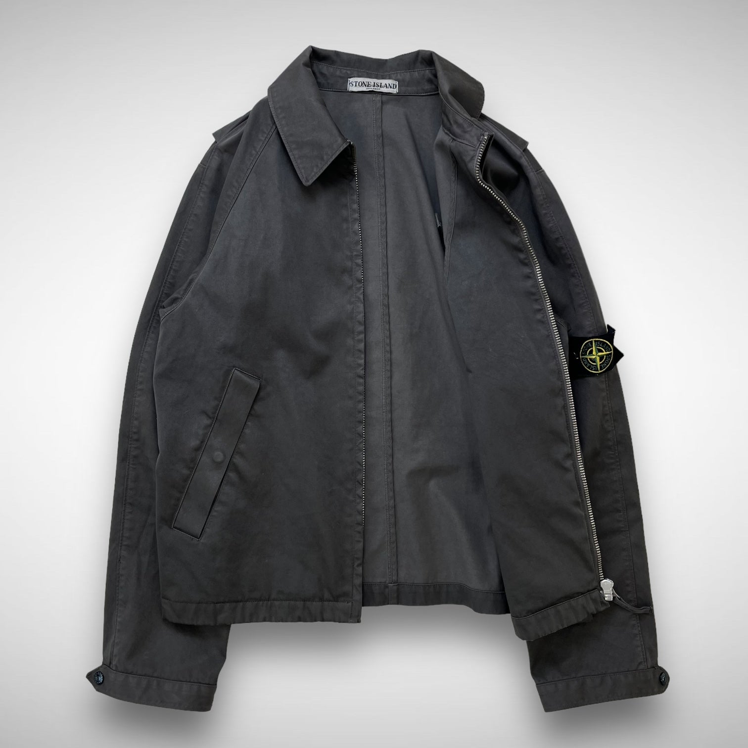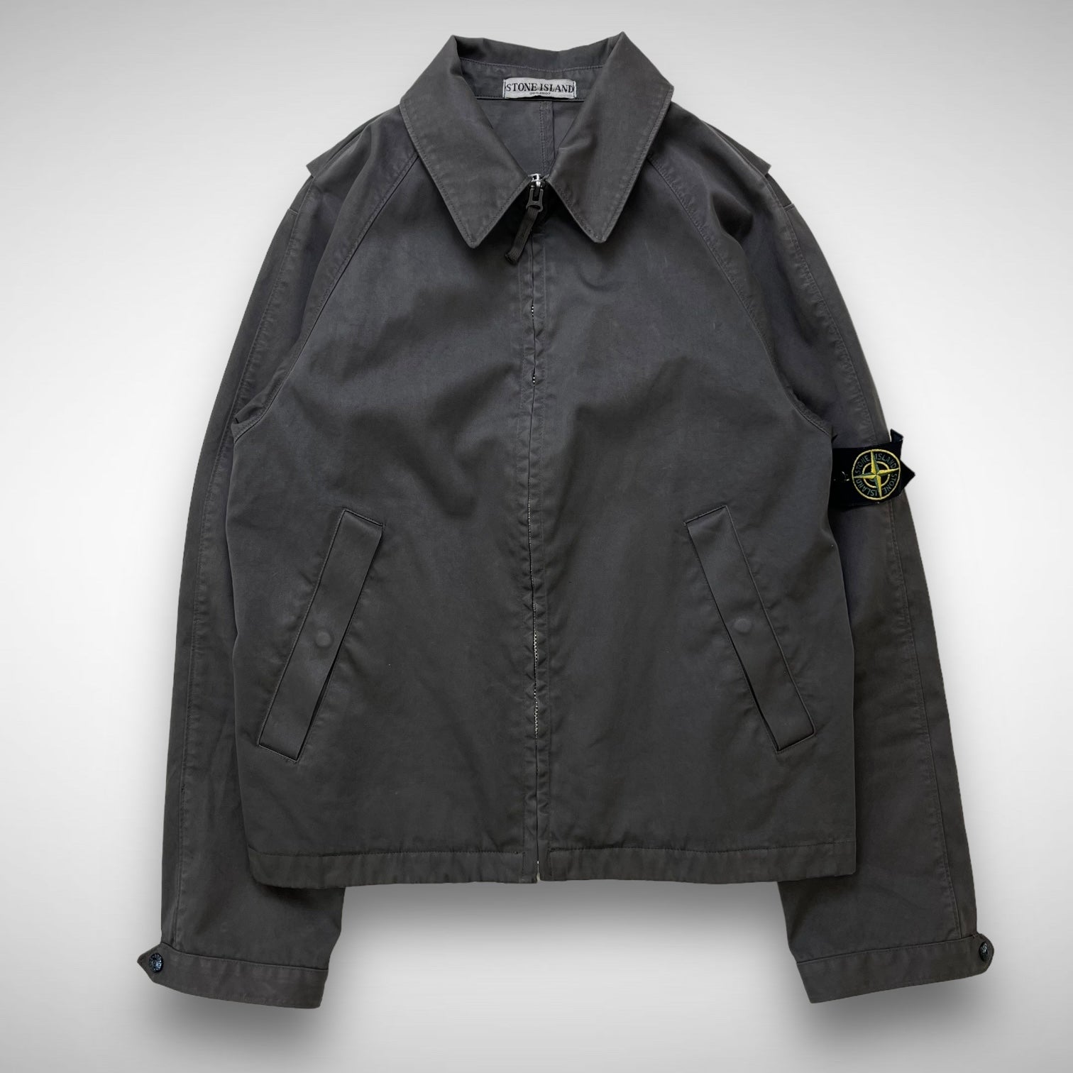 Grey toned cotton work jacket with down collar, press-stud pockets, button fastening cuffs, expandable upper-back panel to improve movability and triangle shaped stitching symbols.