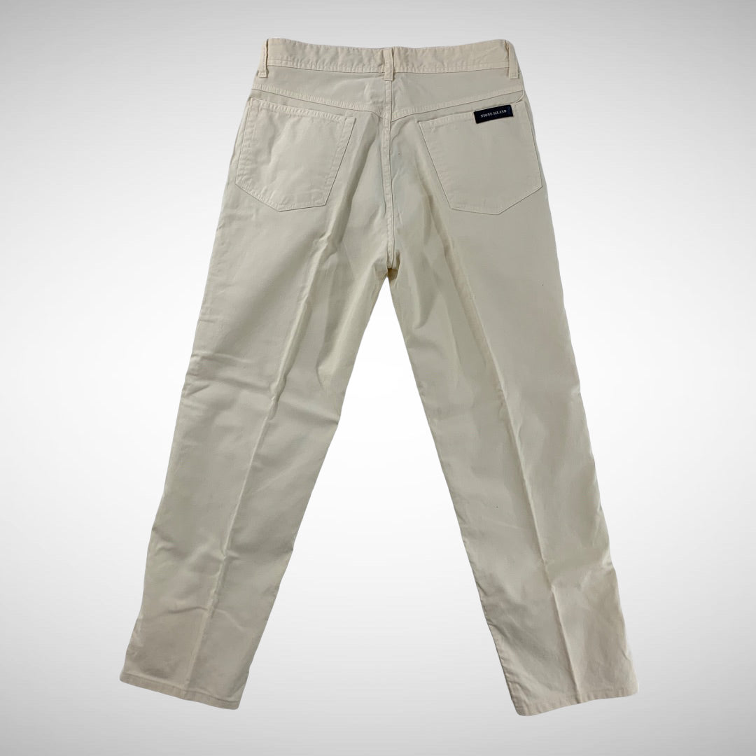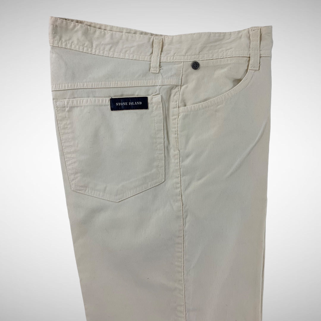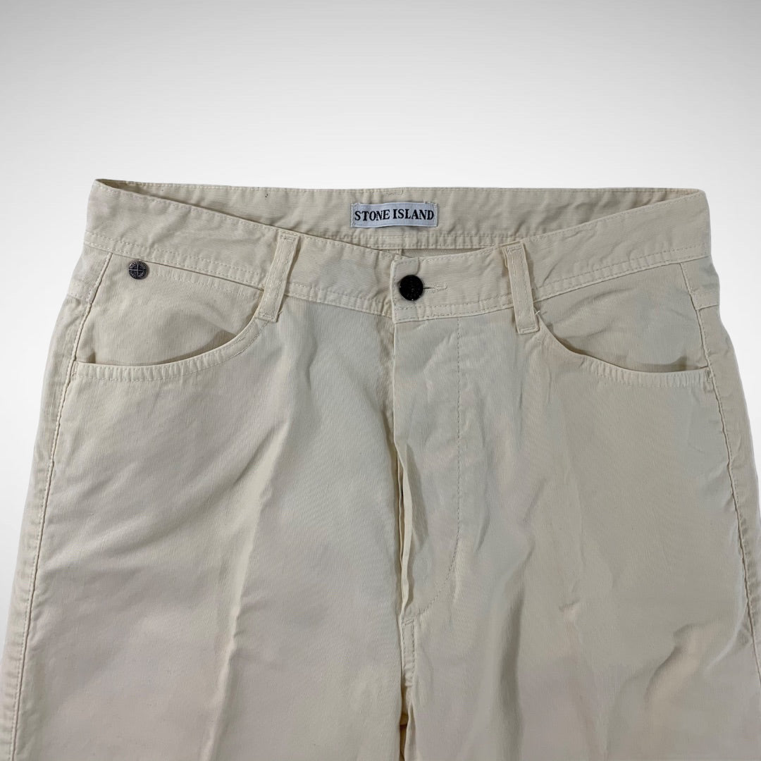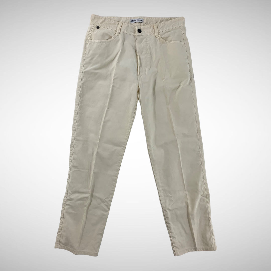 100% cotton cream 5-pocket jeans with metal buttons and leather Stone Island patch on the back pocket.