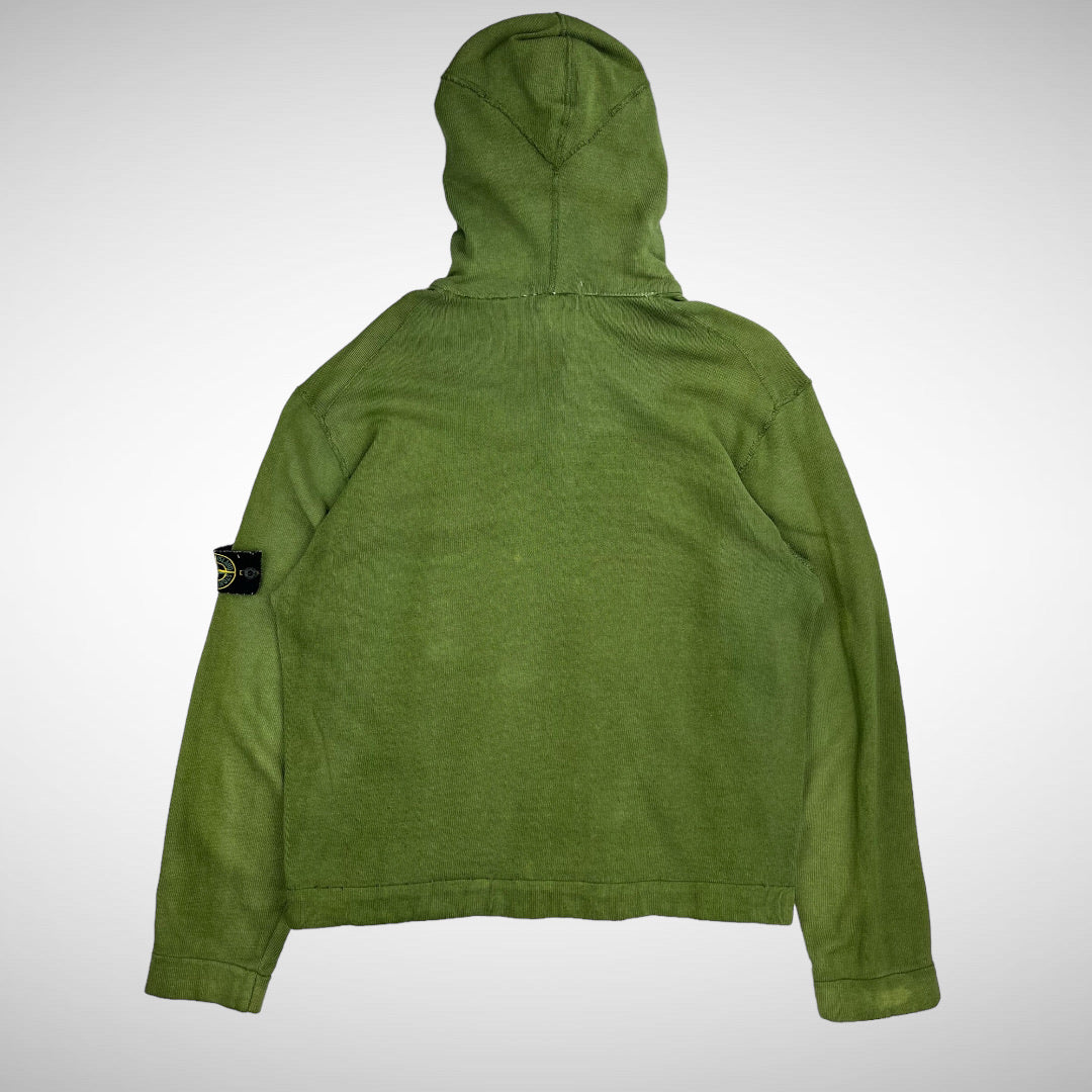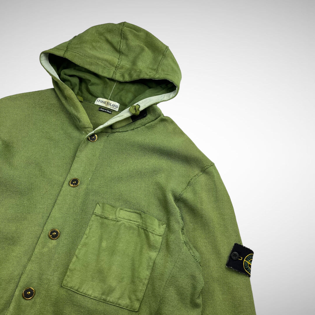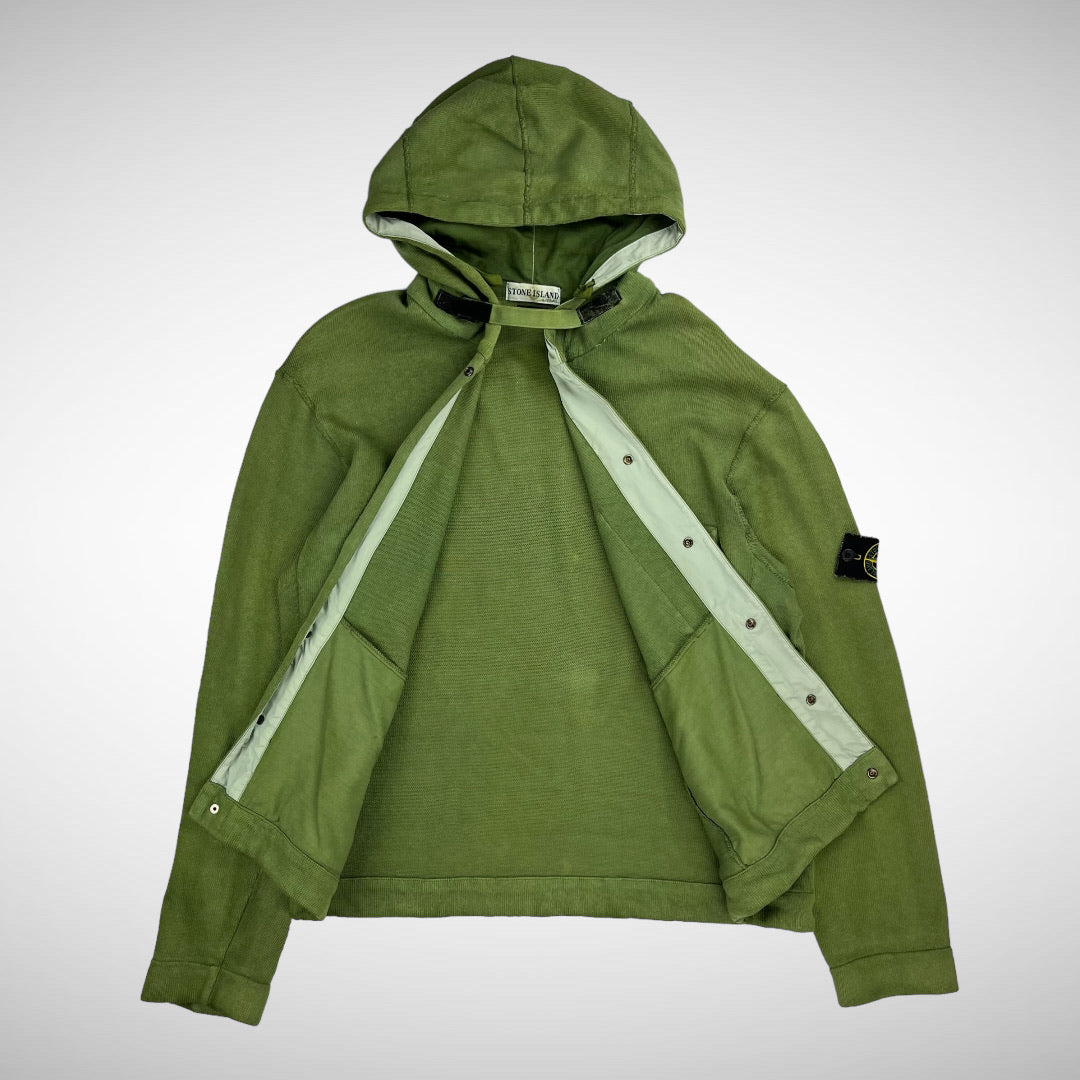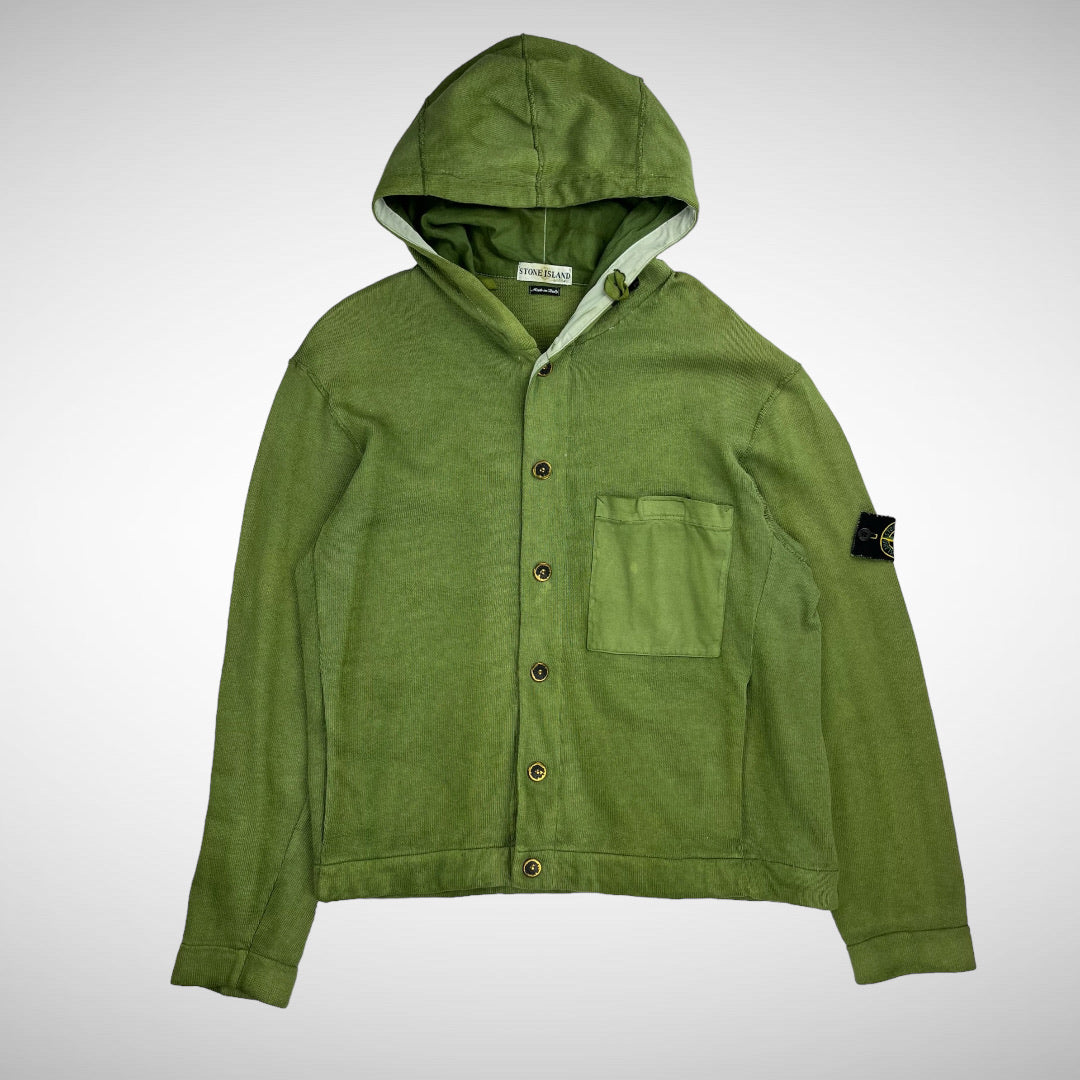Dyed hoodie with metal button-up closure, upper left-chest velcro compartment, rope adjustable hood and removable compass patch.
