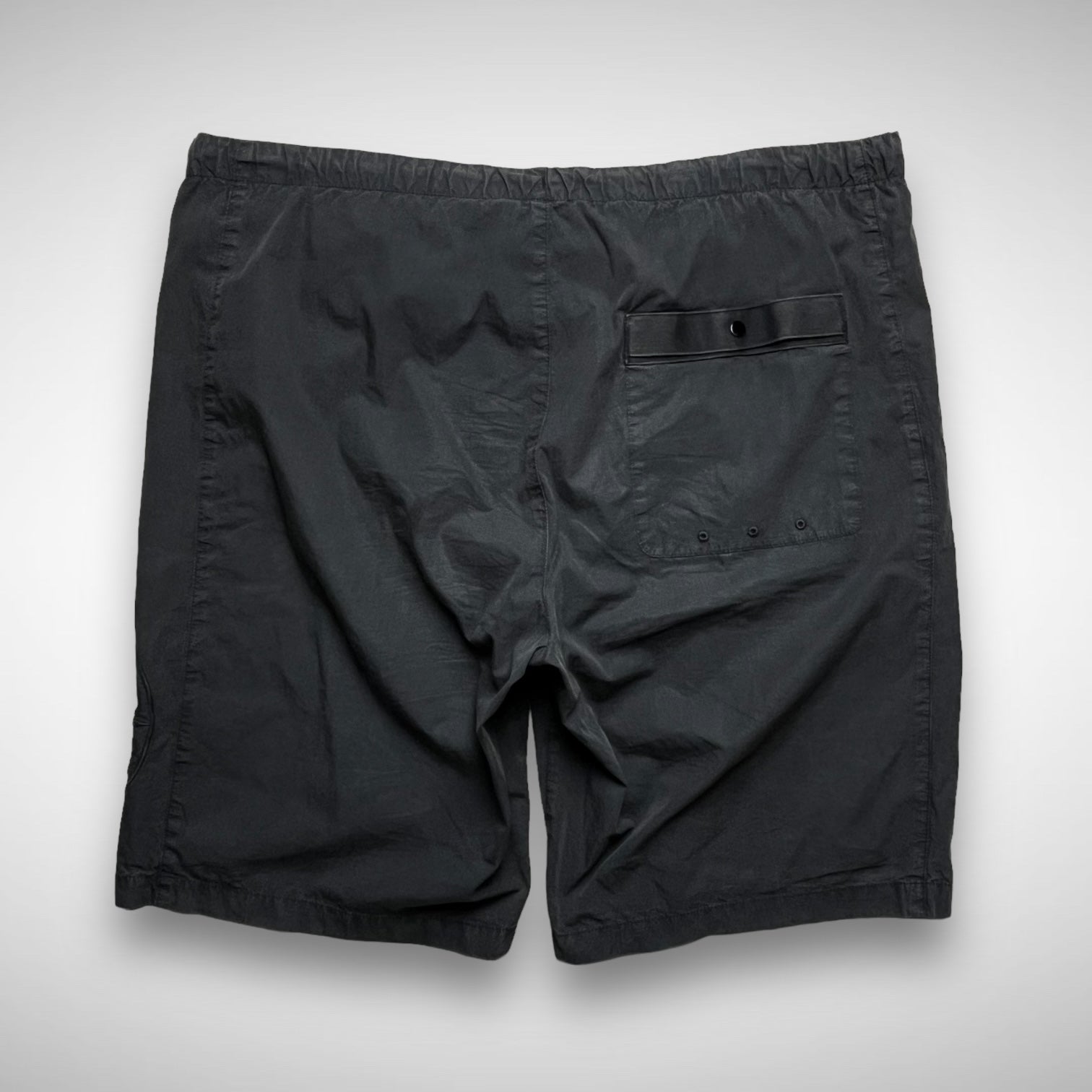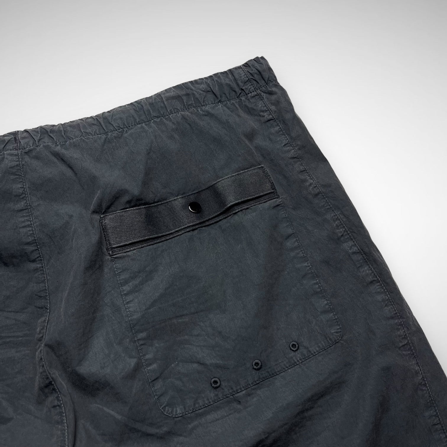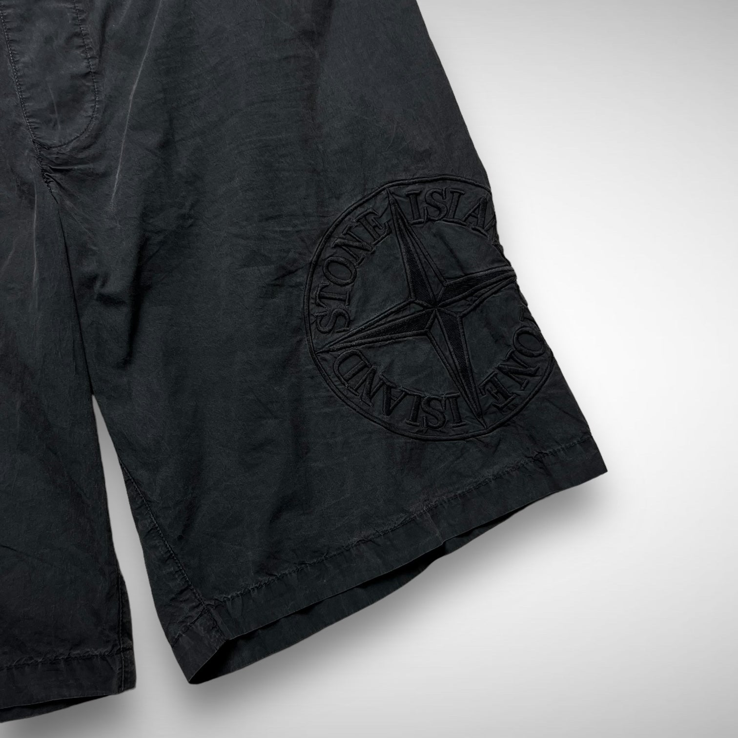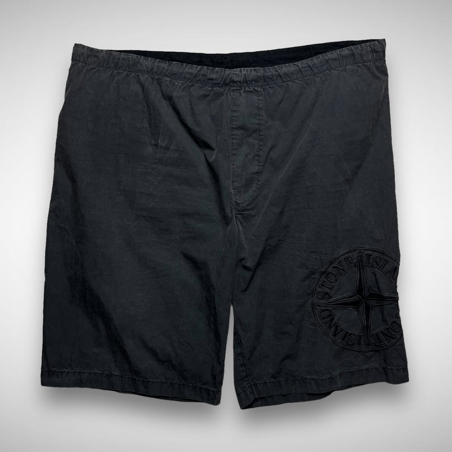 These Stone Island swim shorts from Spring/Summer 2004 are made from a lightweight, slightly crinkled black nylon fabric. They feature an oversized tonal compass logo embroidered on the leg, a minimal elastic waistband, and a buttoned back pocket with drainage eyelets.