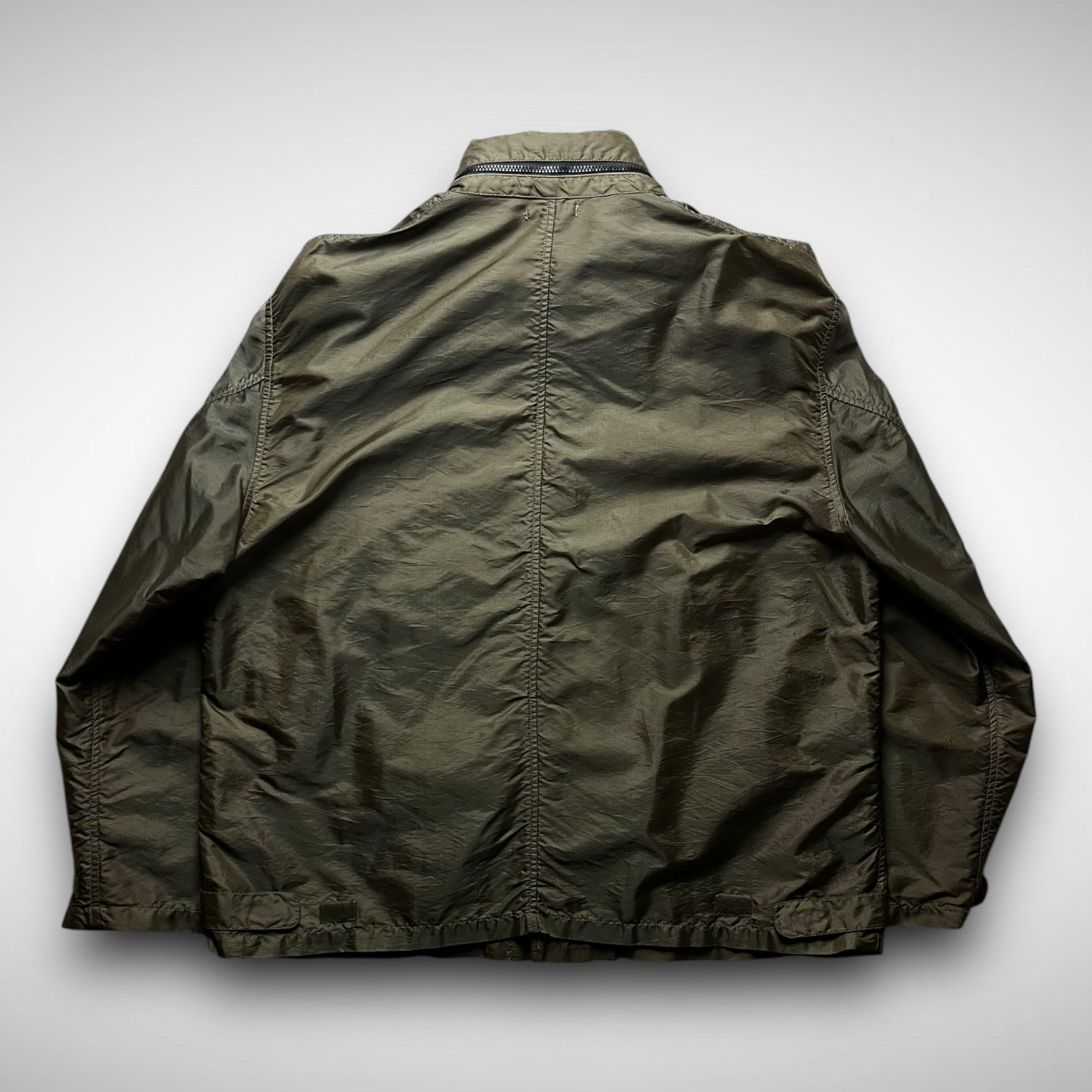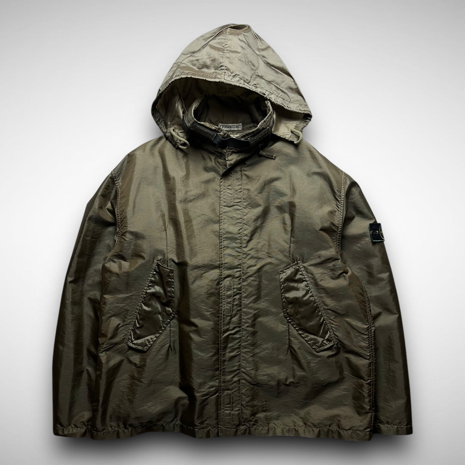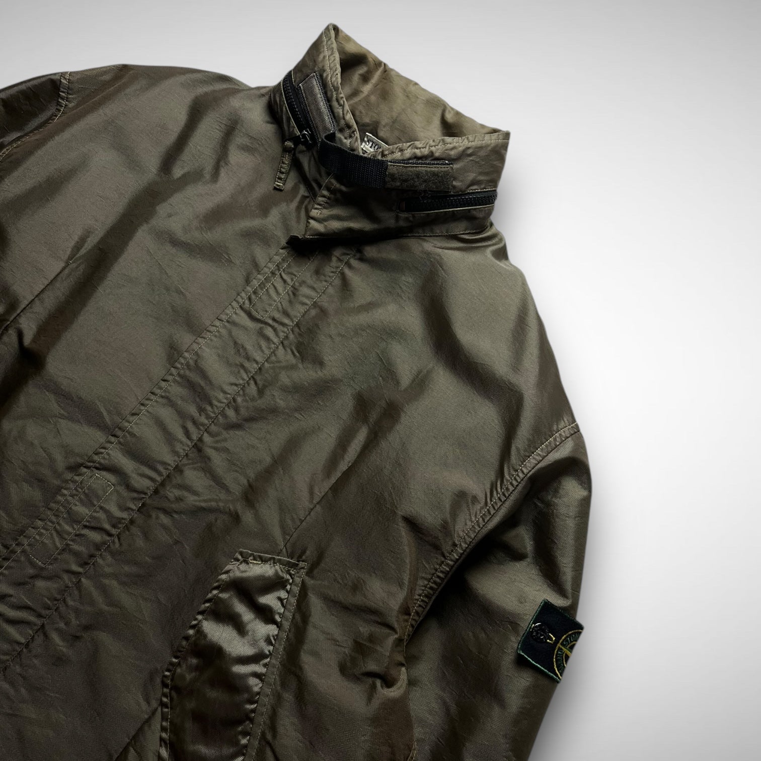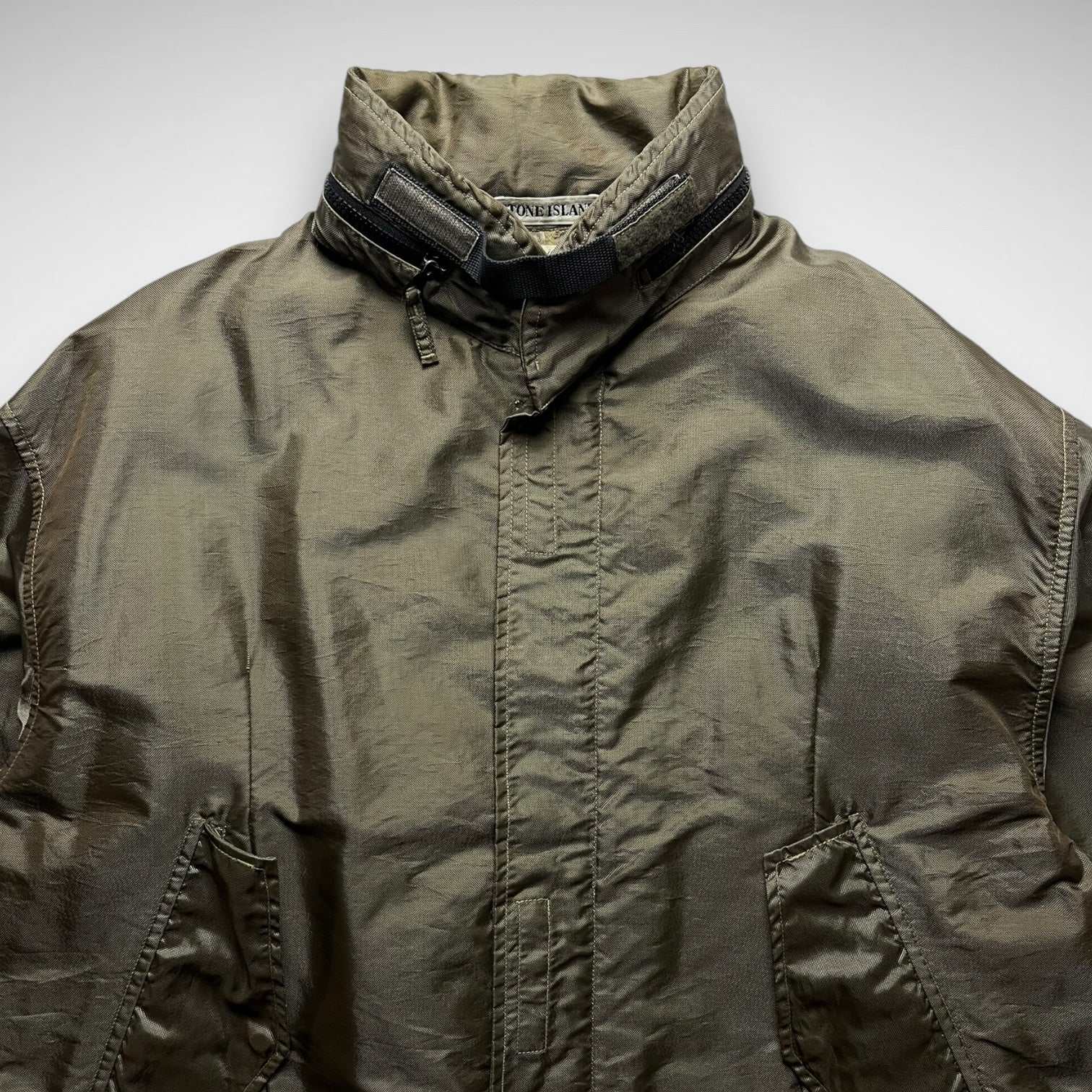 This is a Stone Island Formula Steel Jacket from the Spring/Summer 1995 collection. Made in Italy, it features a metallic finish achieved through a unique stainless steel fiber treatment. Details include a packable hood, high funnel neck with strap, and signature arm badge—an iconic example of Stone Island’s 90s material innovation.