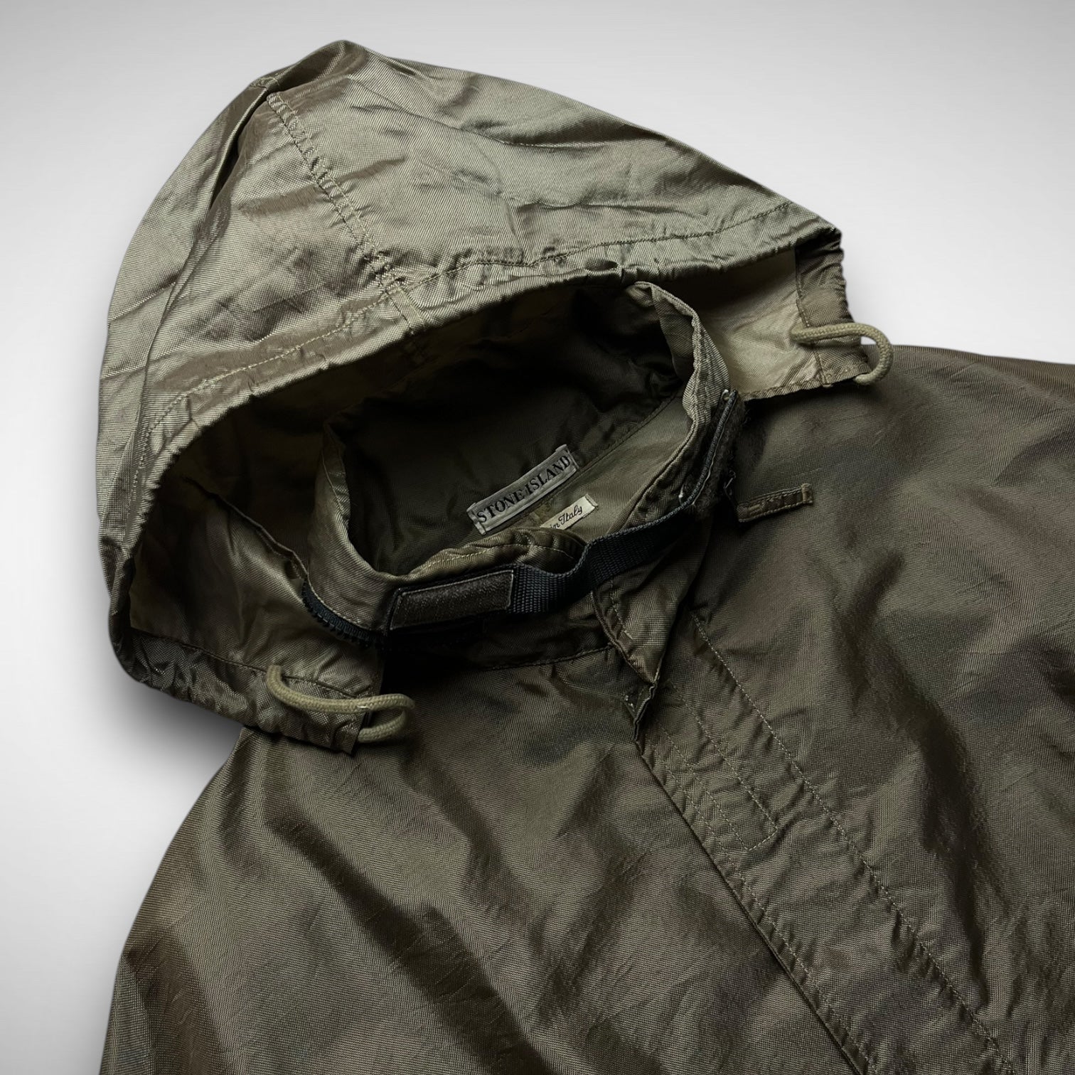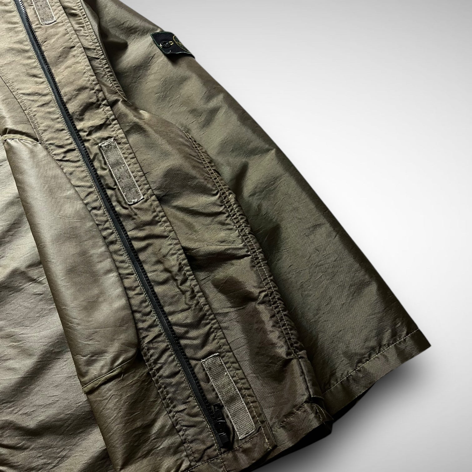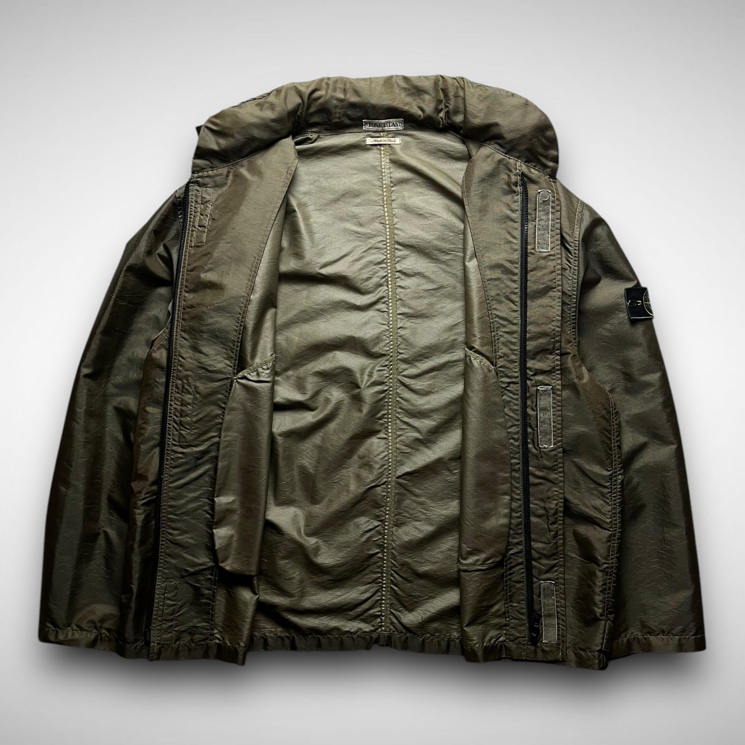 This is a Stone Island Formula Steel Jacket from the Spring/Summer 1995 collection. Made in Italy, it features a metallic finish achieved through a unique stainless steel fiber treatment. Details include a packable hood, high funnel neck with strap, and signature arm badge—an iconic example of Stone Island’s 90s material innovation.