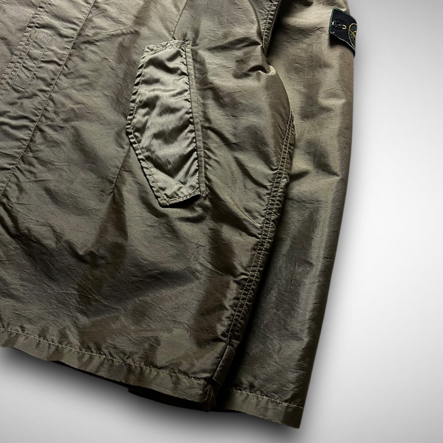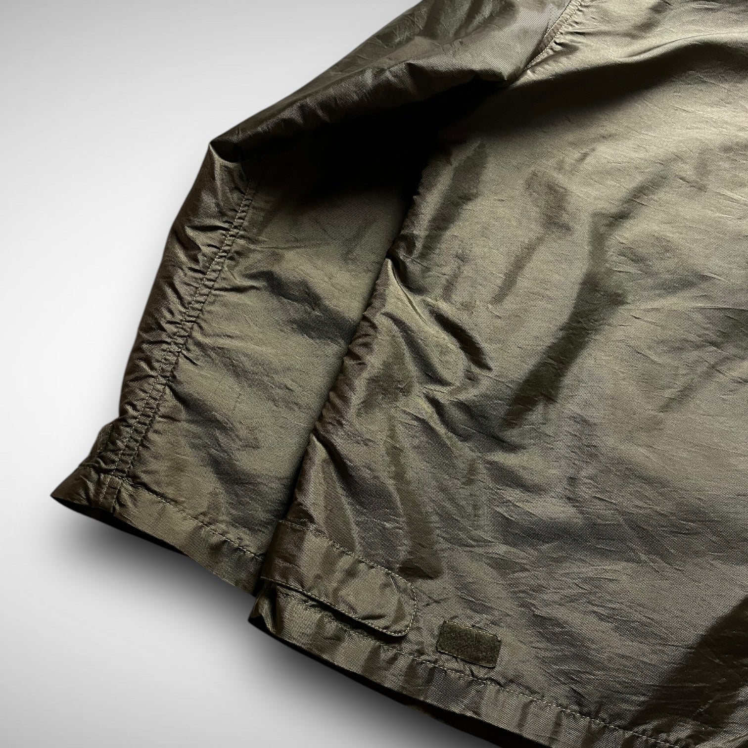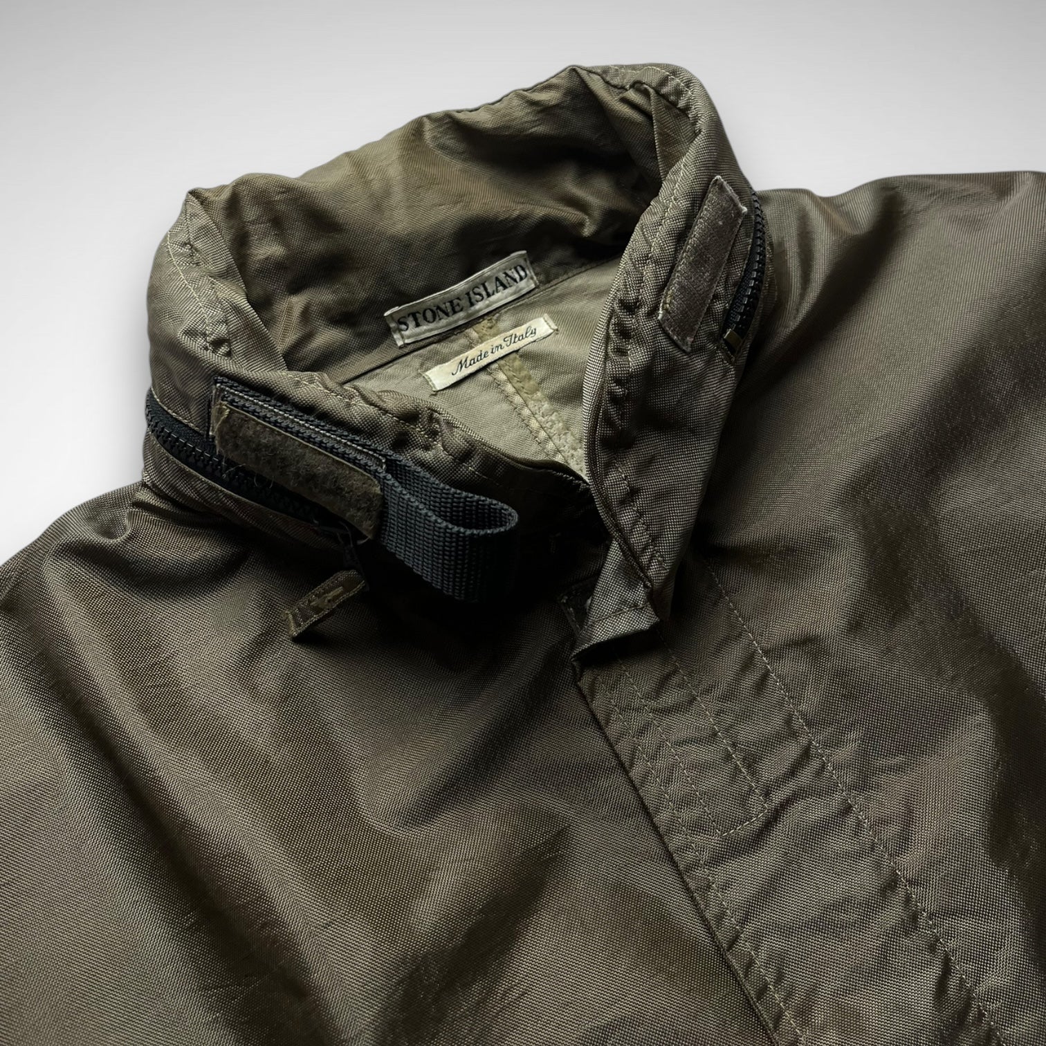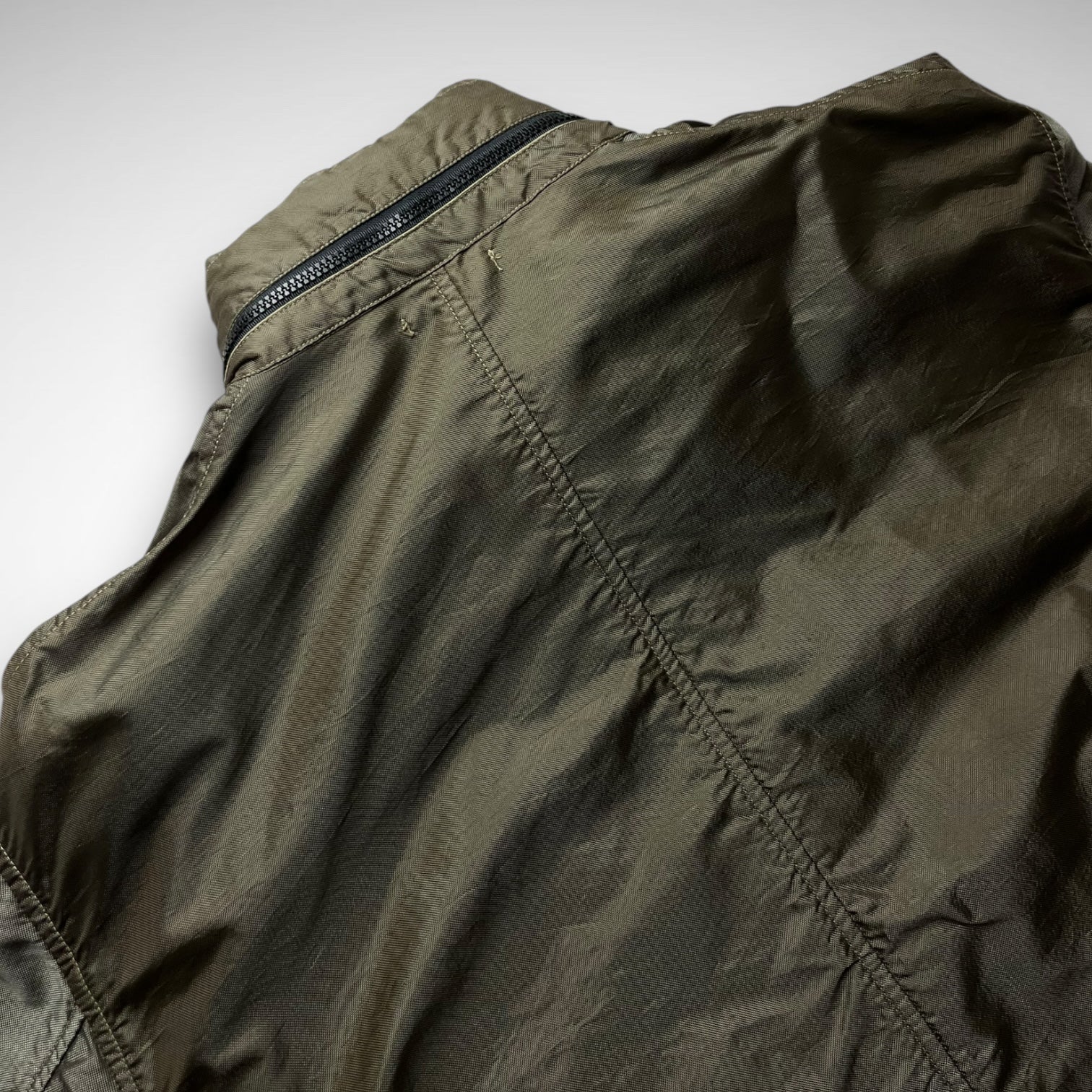 This is a Stone Island Formula Steel Jacket from the Spring/Summer 1995 collection. Made in Italy, it features a metallic finish achieved through a unique stainless steel fiber treatment. Details include a packable hood, high funnel neck with strap, and signature arm badge—an iconic example of Stone Island’s 90s material innovation.