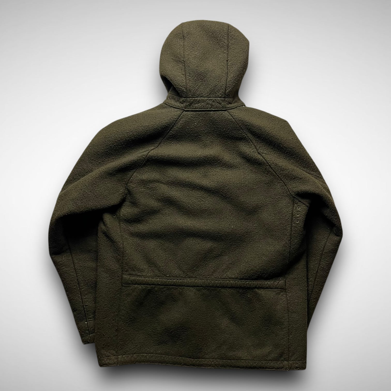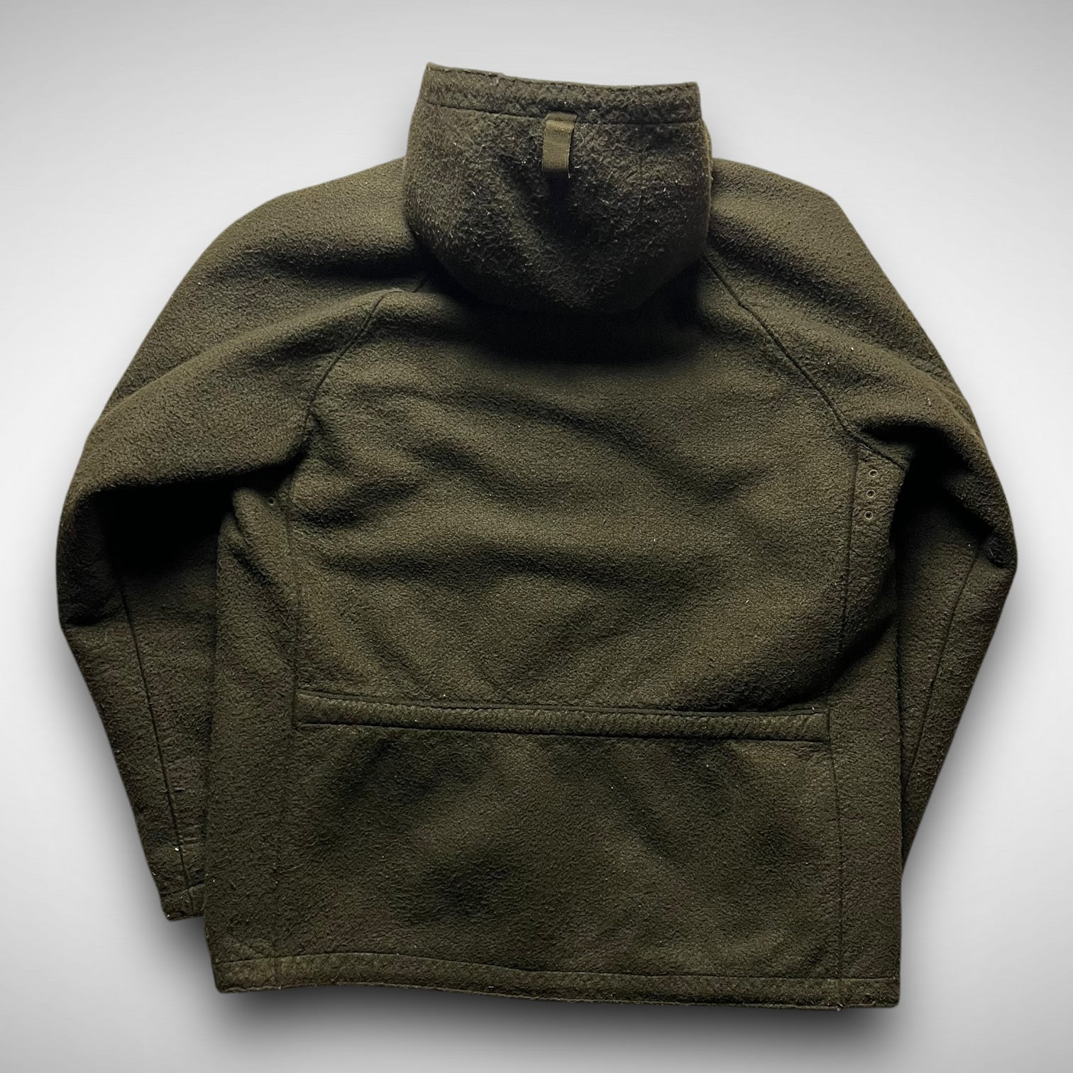 Hooded jacket in deep olive featuring a textured bouclé surface, button and zip closure, four front flap pockets, and adjustable hood with chin strap. Signature compass badge on the left arm. Rugged military-inspired construction.