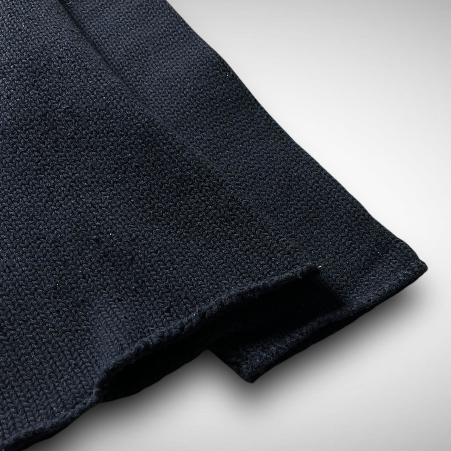 Navy knit pullover with removable green-edge badge, ribbed collar and exposed seams at hem and cuffs.