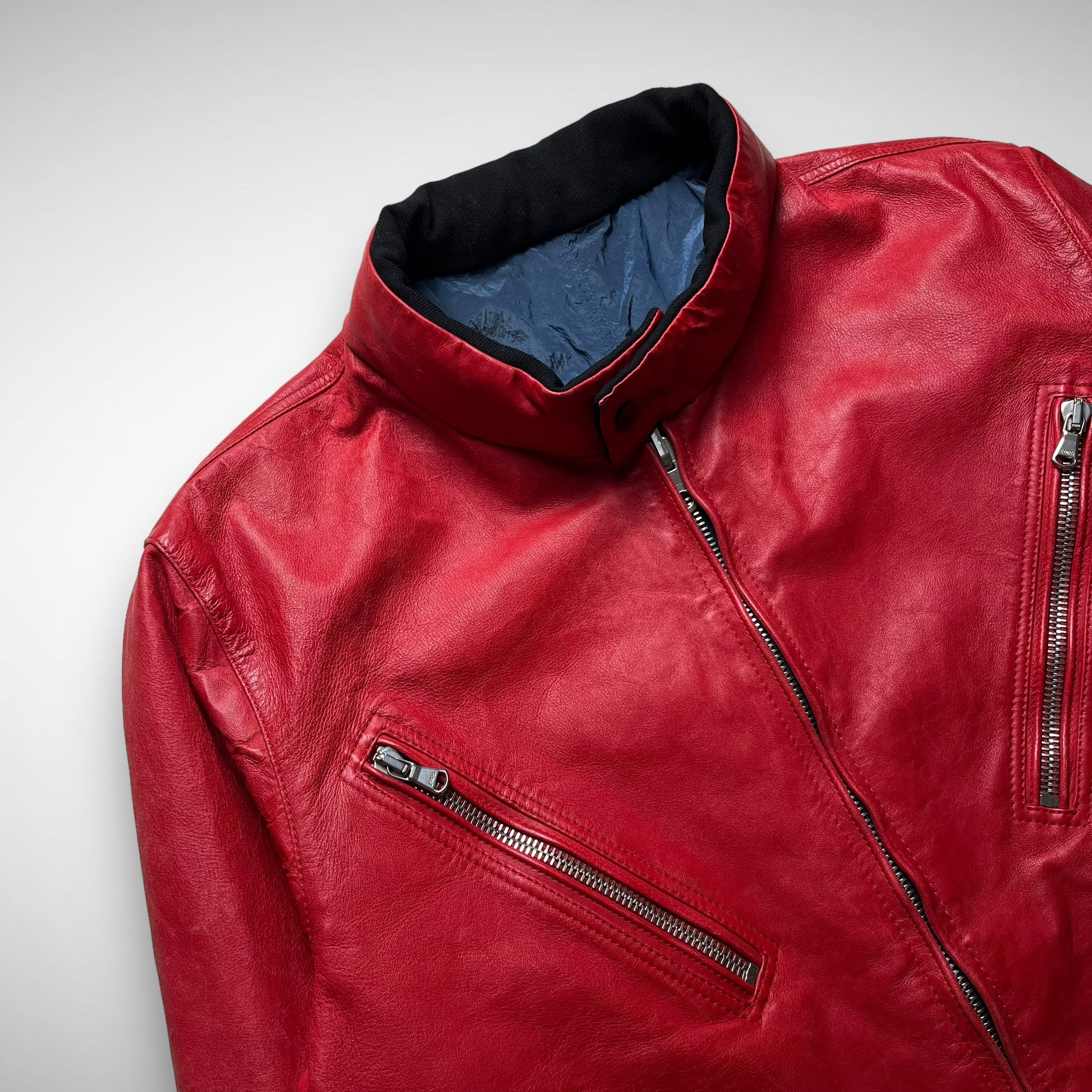 Amazing quality, crazy jacket. Soft red leather with double big-zip angled upper-chest pockets and two double press-button pockets, adjustable cuffs, double press-button collar, reversible to dark blue nylon shimmer with double compartments and removable badge on arm (both-sides).