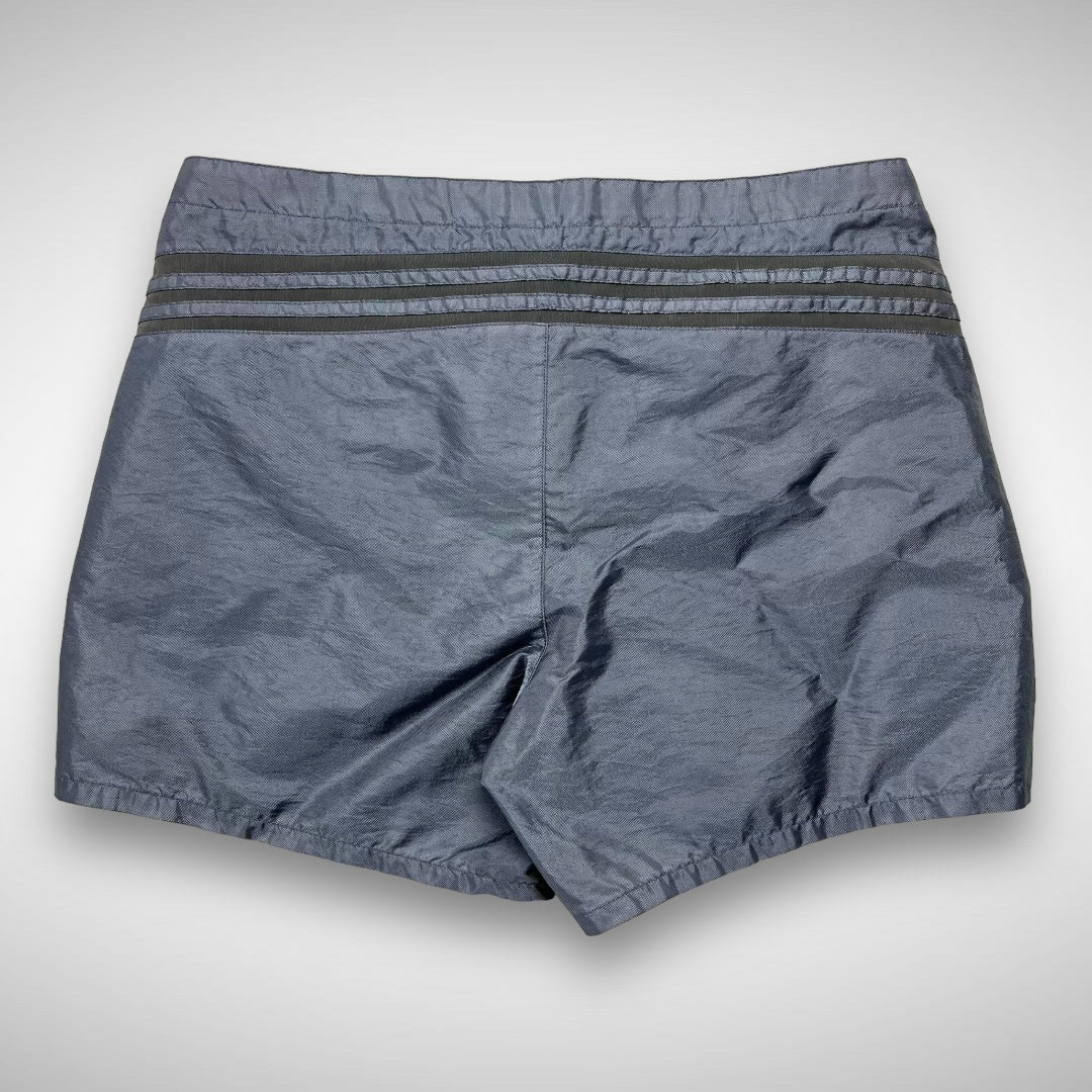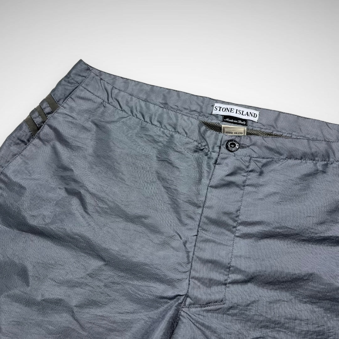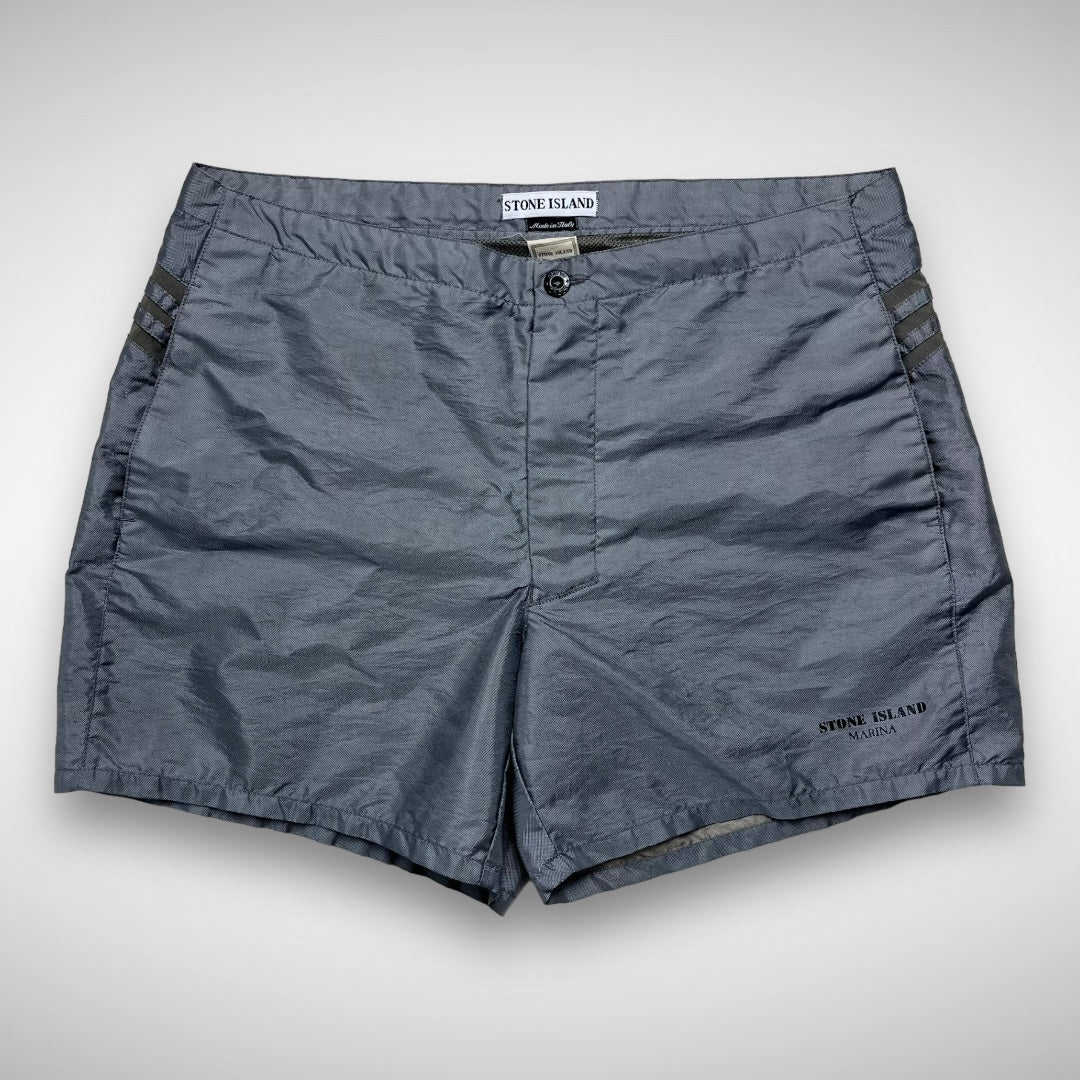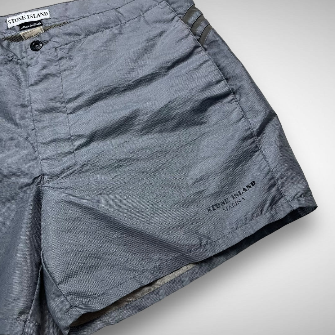 These Stone Island Marina swim shorts feature a lightweight, quick-drying grey fabric with a subtle iridescent texture. The design includes tonal side stripes, a mesh lining, and the “Stone Island Marina” logo printed on the front leg.