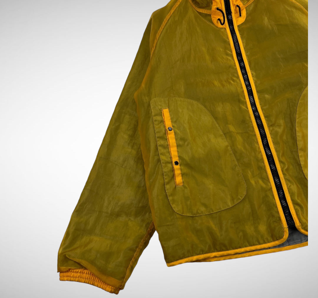 Condition is good used. Outer has zero to minor signs of wear and the inner shows some wear in the collar. Monofilament shimmer in yellow and green, rope toggles to adjust hood and two front double-button closure pockets.