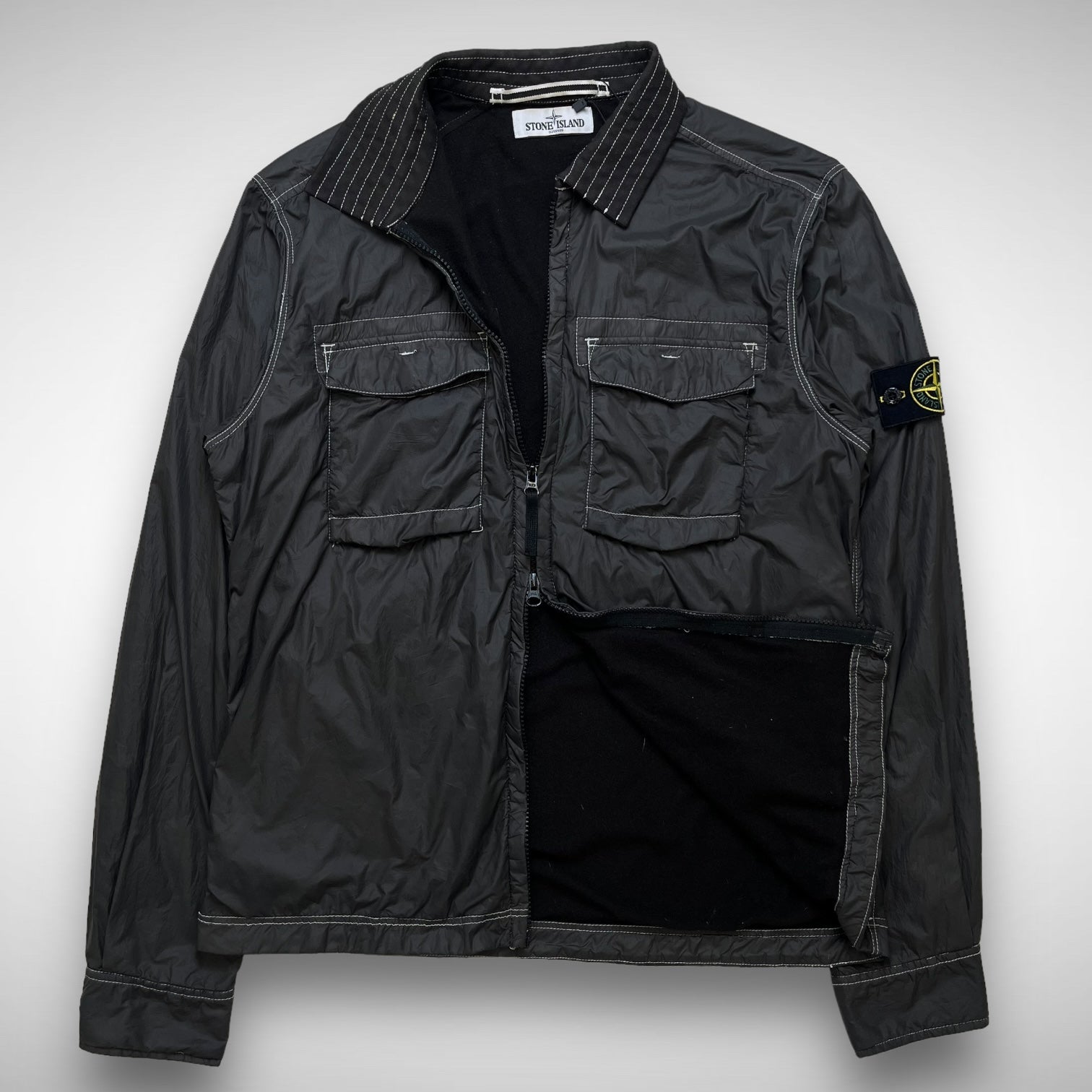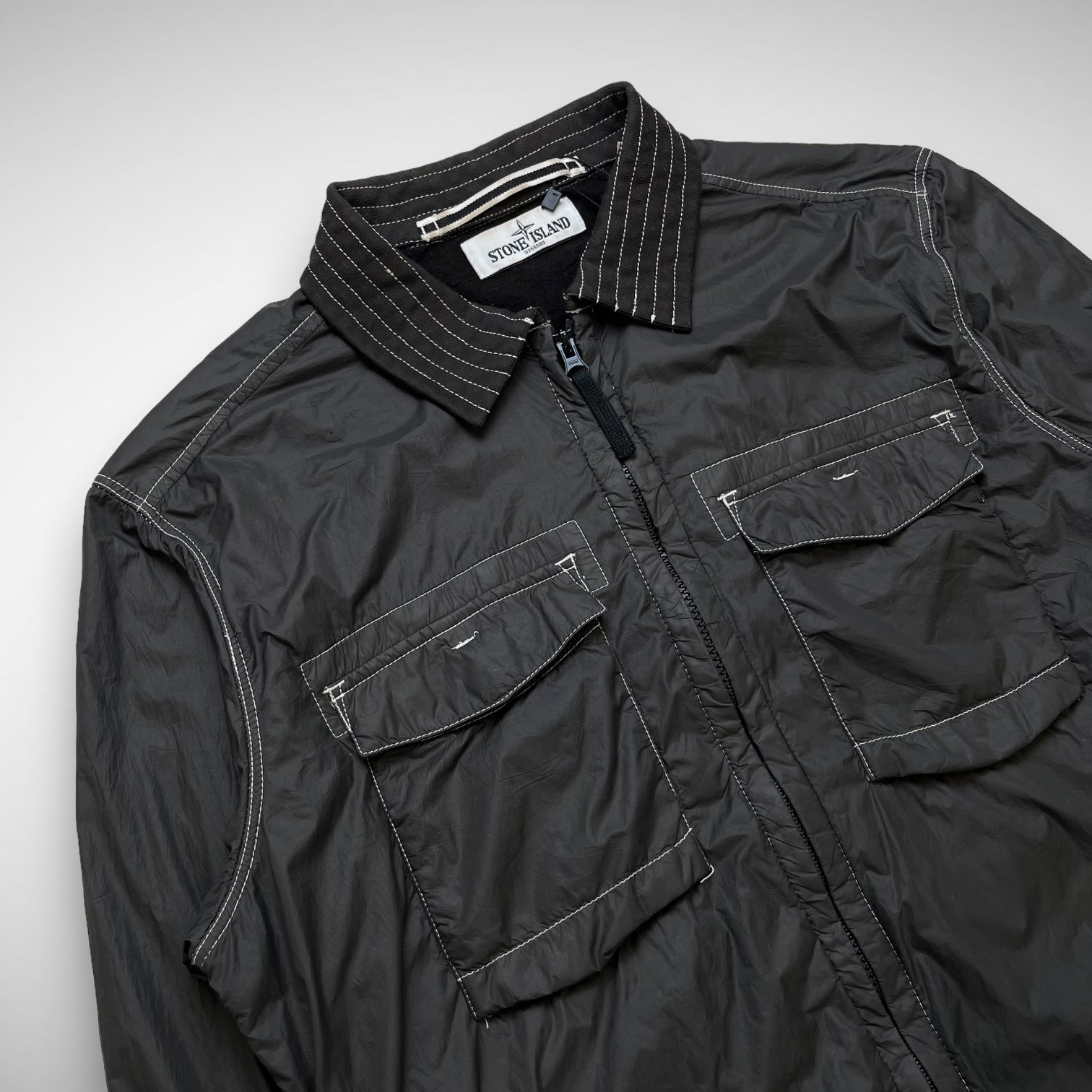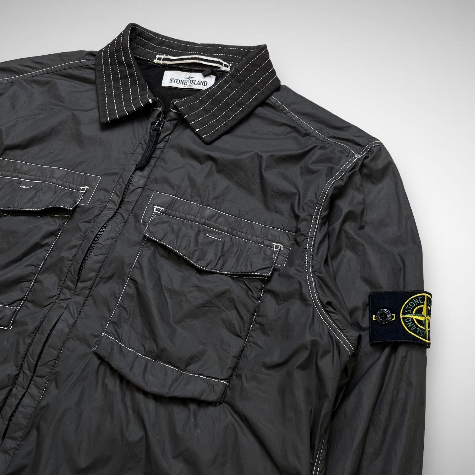 Dark grey nylon overshirt featuring contrast stitching details throughout including fold-down collar, double flap chest pockets, two-way zip closure, button adjustable cuffs and fleeced lining.
