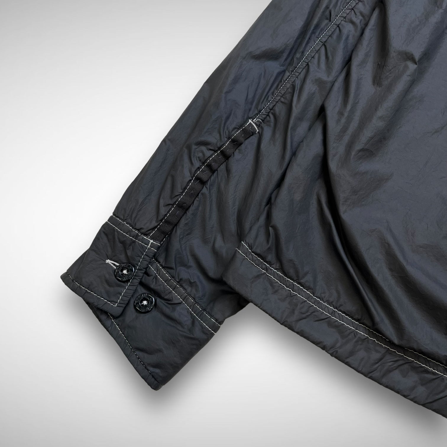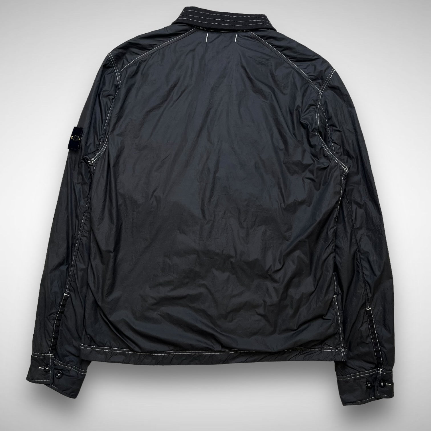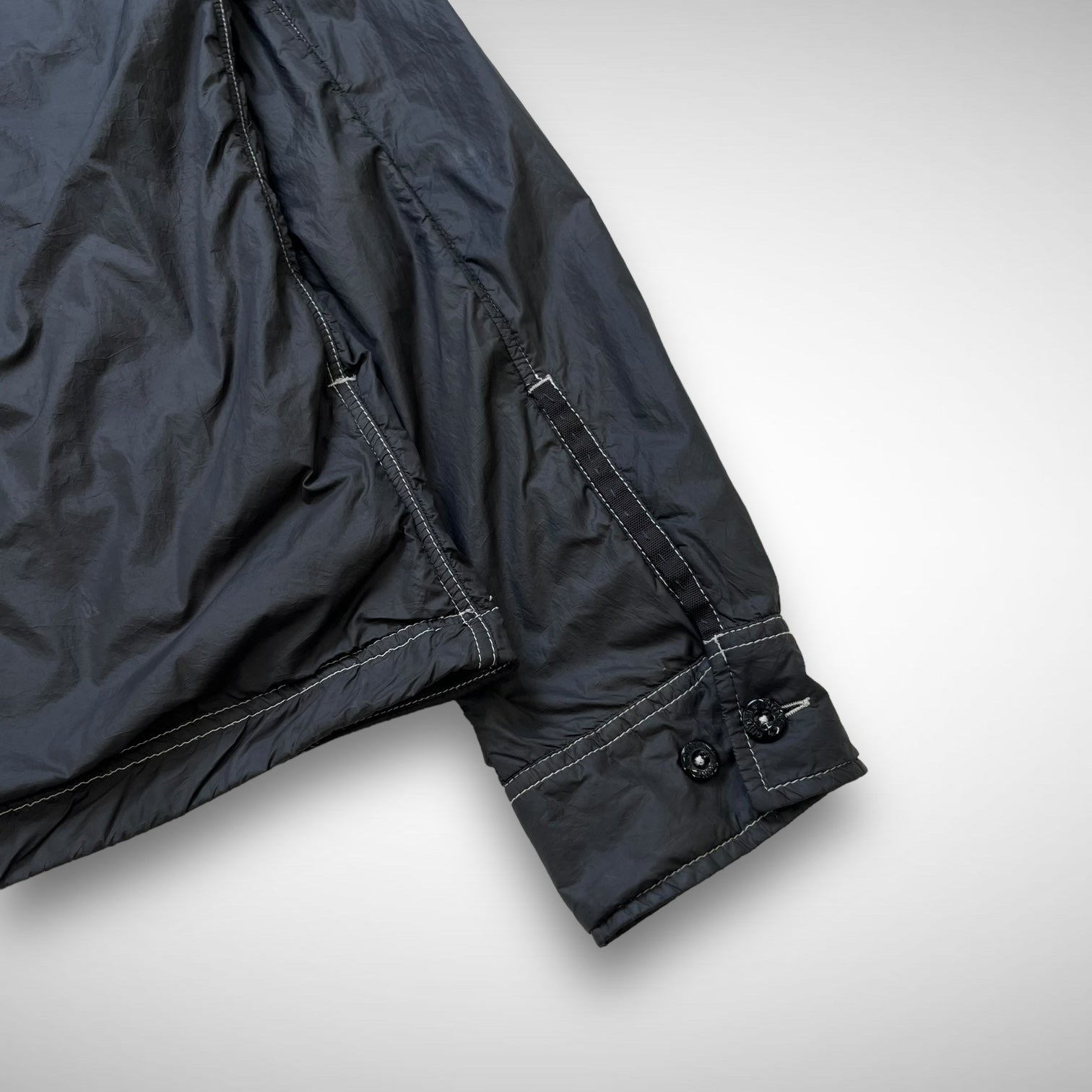 Dark grey nylon overshirt featuring contrast stitching details throughout including fold-down collar, double flap chest pockets, two-way zip closure, button adjustable cuffs and fleeced lining.