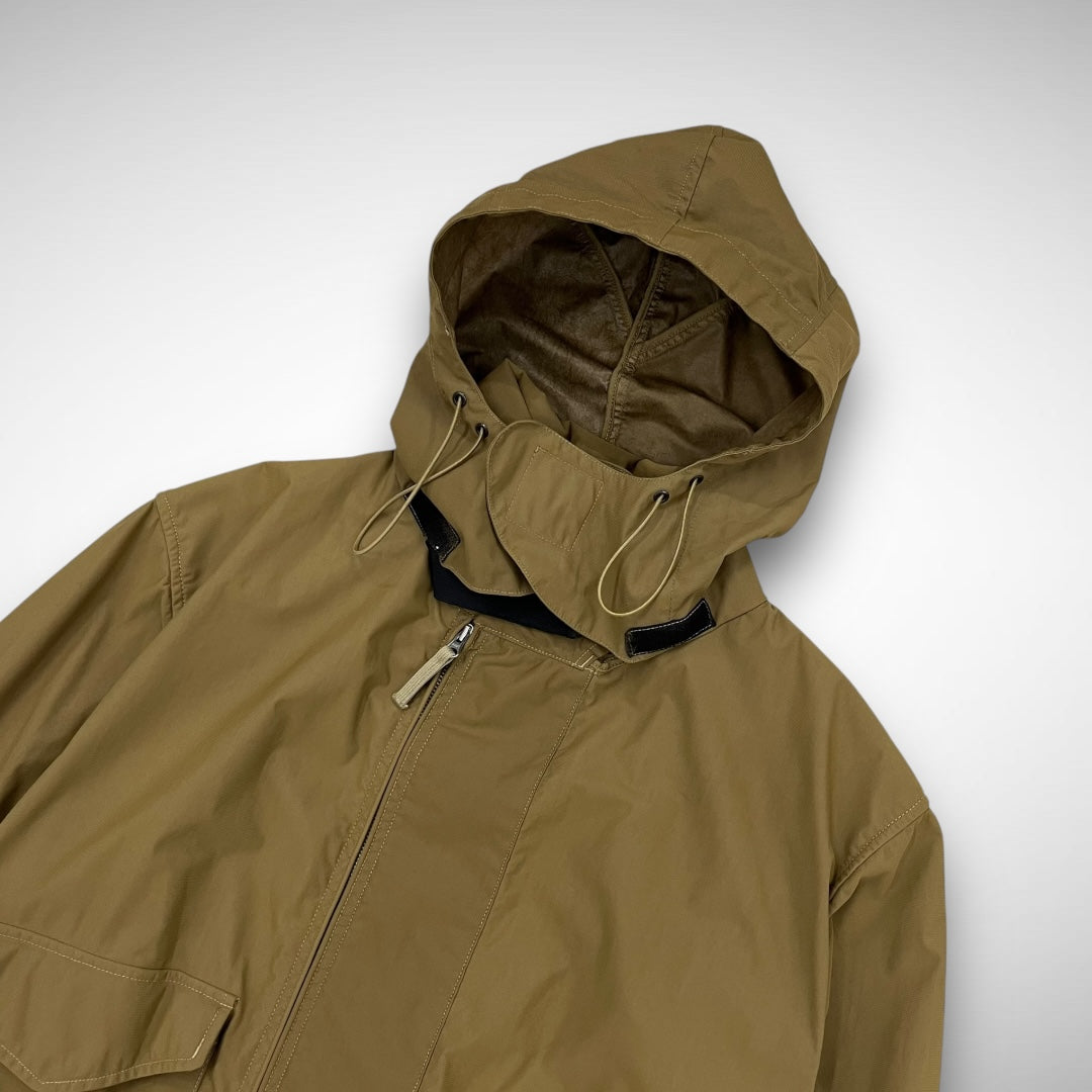 Designed by Paul Harvey in 2001, this parachute bomber jacket features elasticated hem and cuffs, storable and adjustable hood with velcro riot closure, collar can be closed with elastic velcro band as well, off-centre zip closure and double front flap compartments.