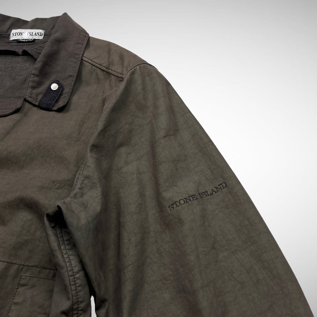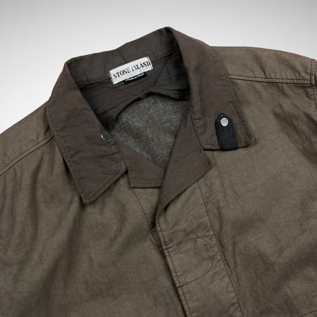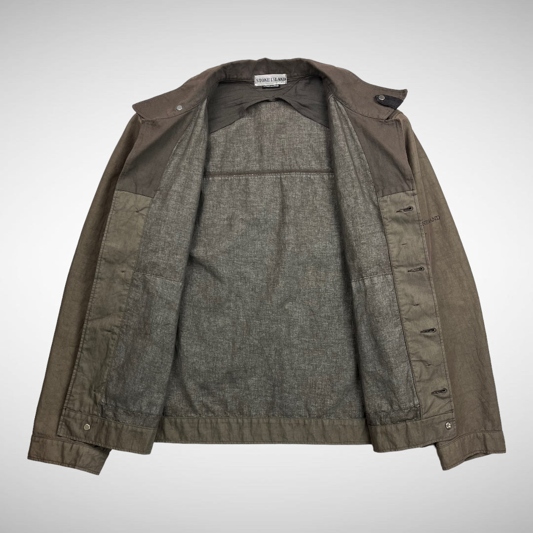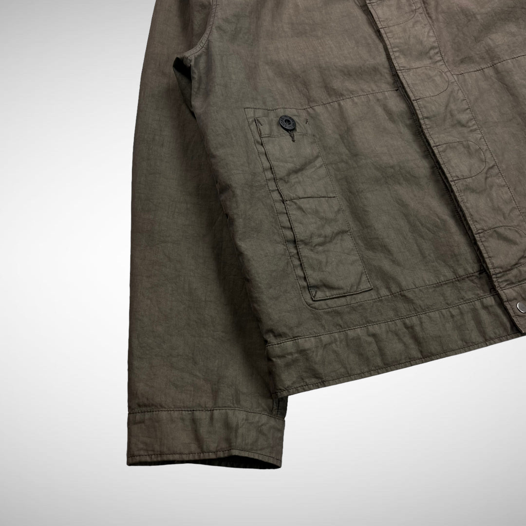 Resinated cotton jacket featuring slightly iridescent grey/brown colour, stitching highlighted button-up closure, pockets with additional button pocket, embroidered script on upper arm and untreated cotton collar with additional button to close collar.
