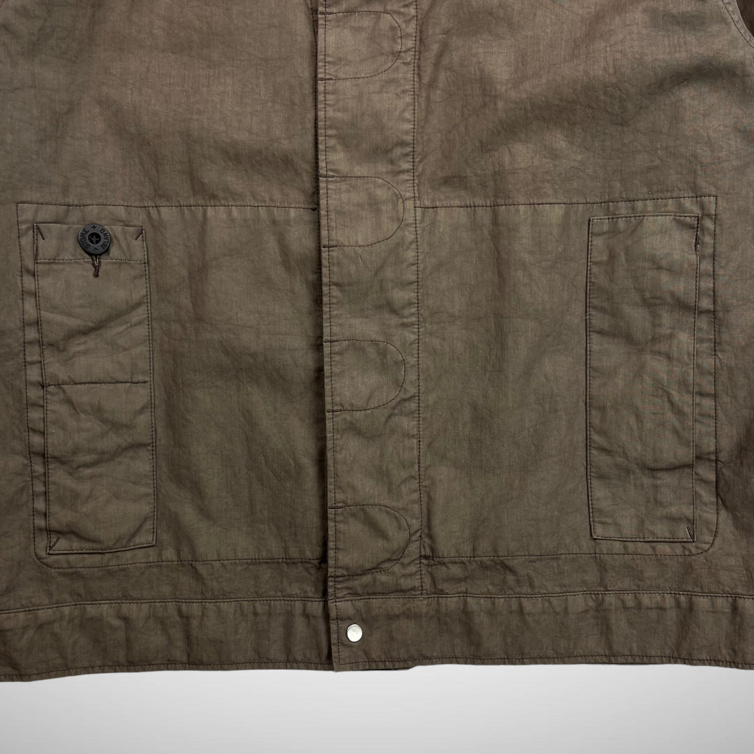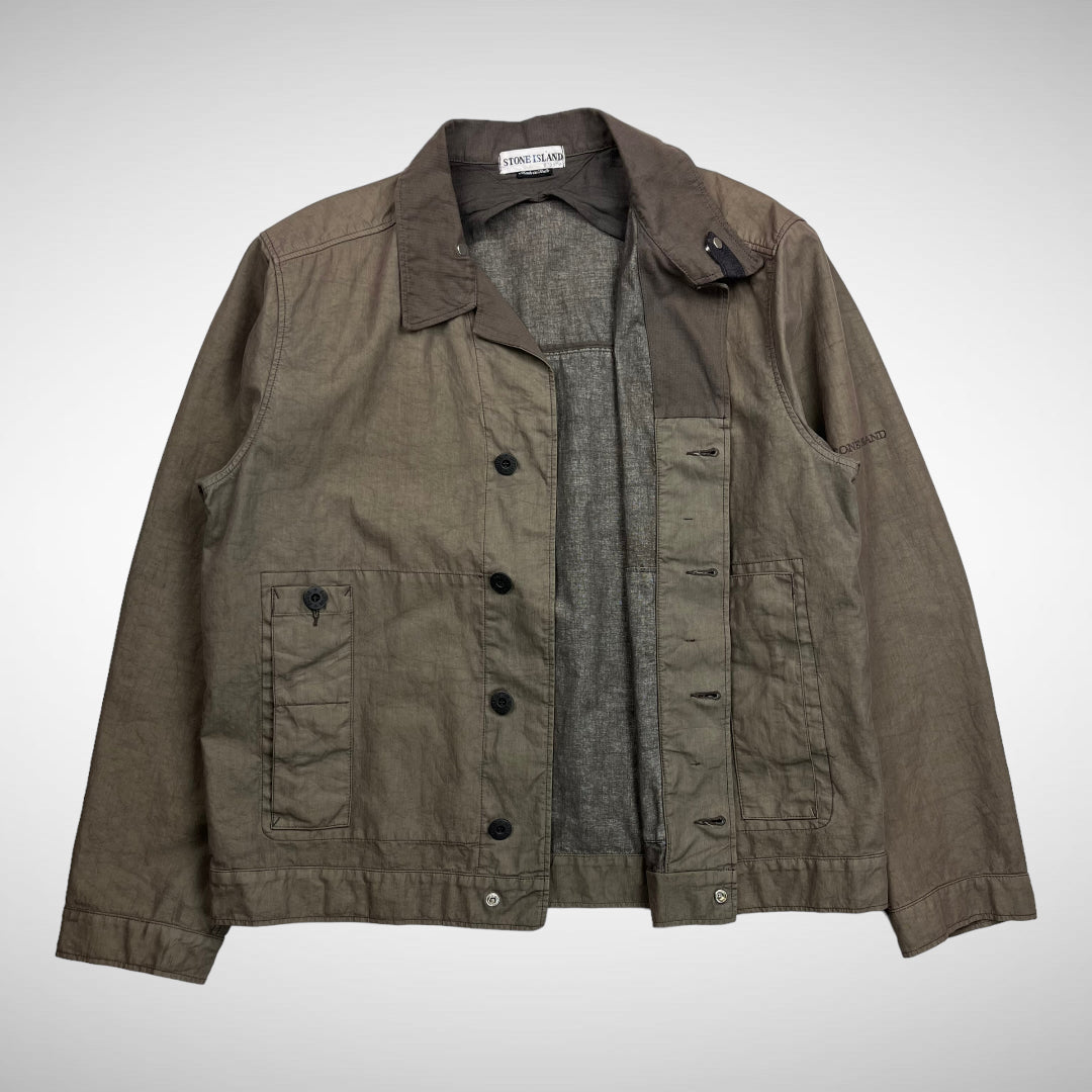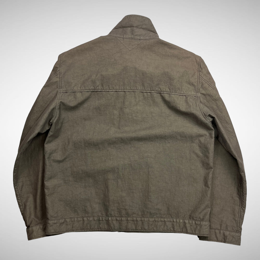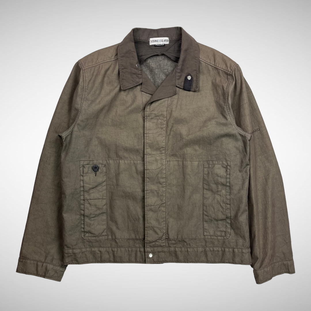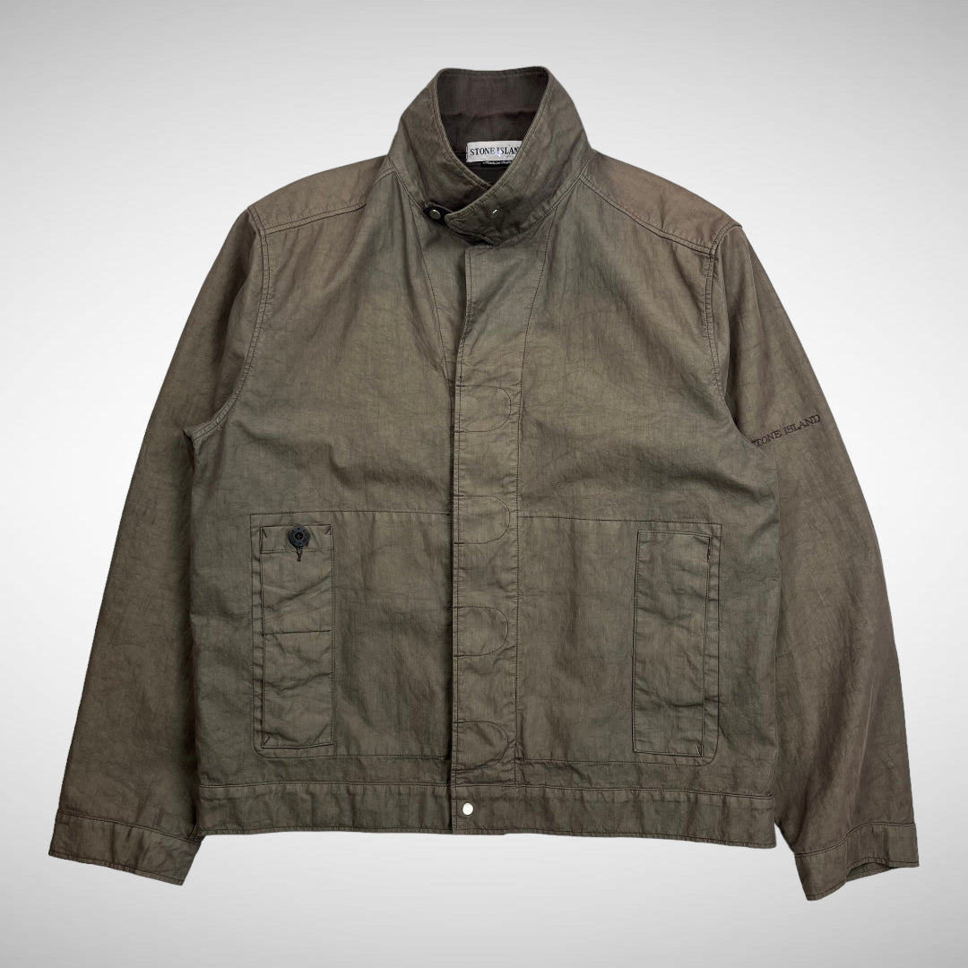 Resinated cotton jacket featuring slightly iridescent grey/brown colour, stitching highlighted button-up closure, pockets with additional button pocket, embroidered script on upper arm and untreated cotton collar with additional button to close collar.