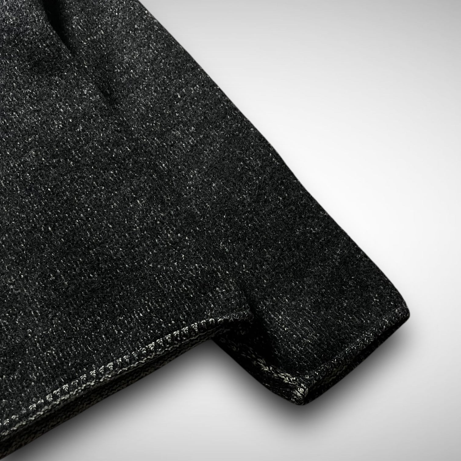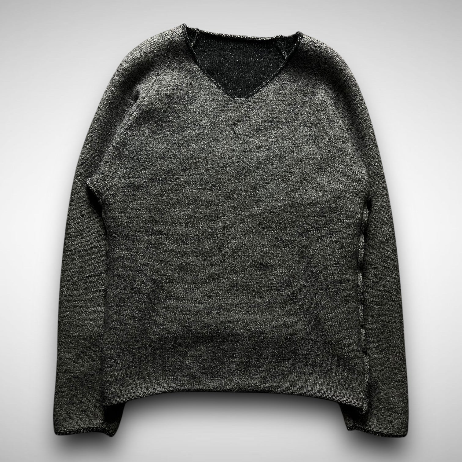 Reversible V-neck knit featuring contrasting dark charcoal and heather grey sides with a script in the collar, crafted from wool, showcasing flatlock seams and raw-edge hems.