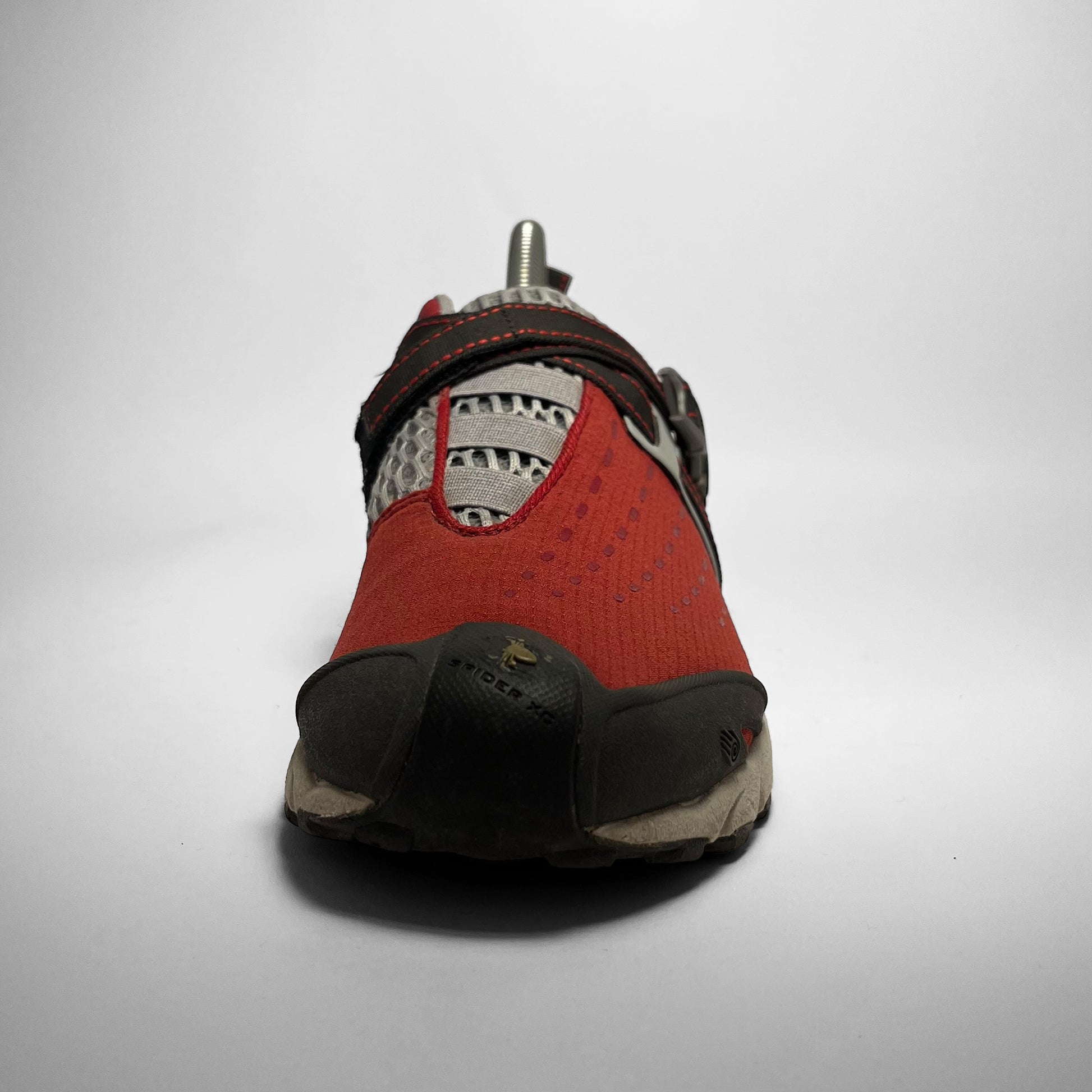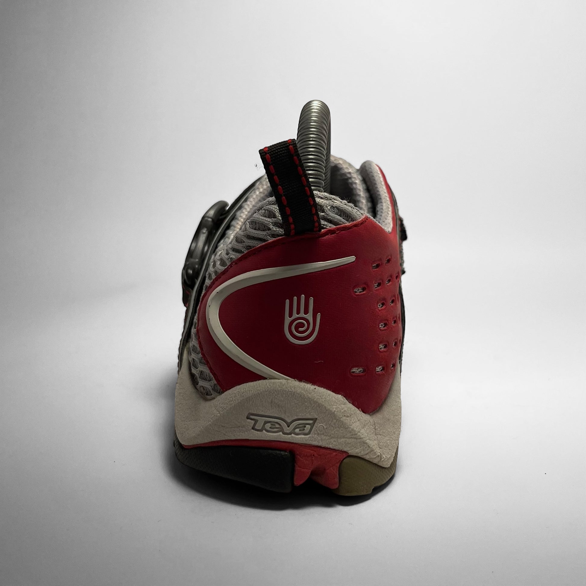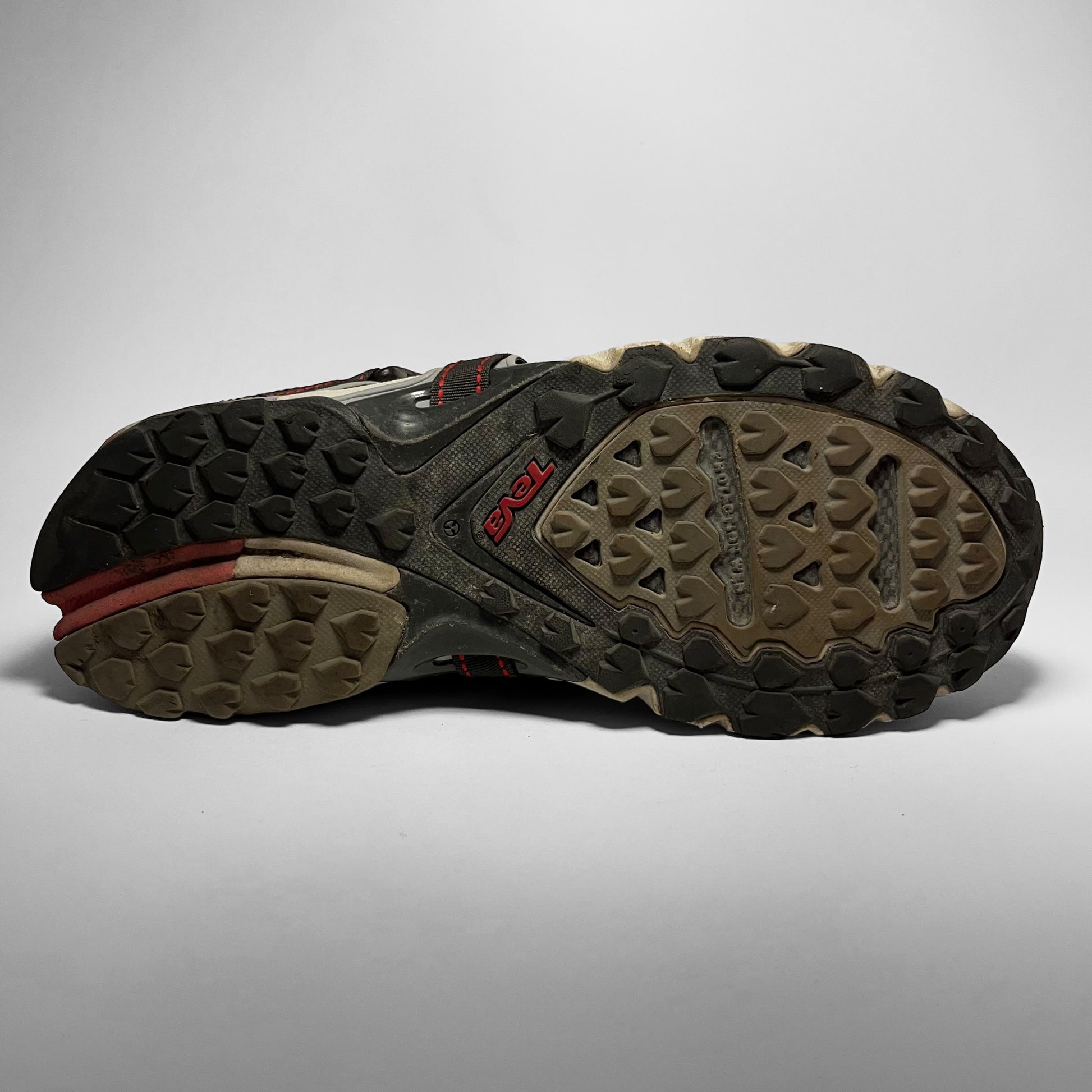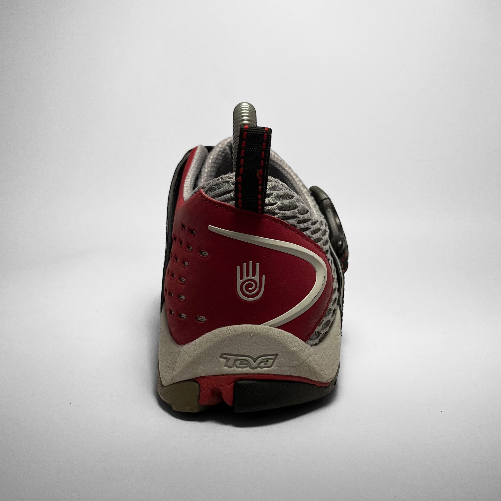 Slip-on model with mid-section wide pattern double layered grey mesh, soft checkered-pattern red upper including details, double wrapped black cotton woven strap with red stitching and press-closure, stretch material on the tongue, spider and script embossed branding on the front and Teva signature logo on the heel.