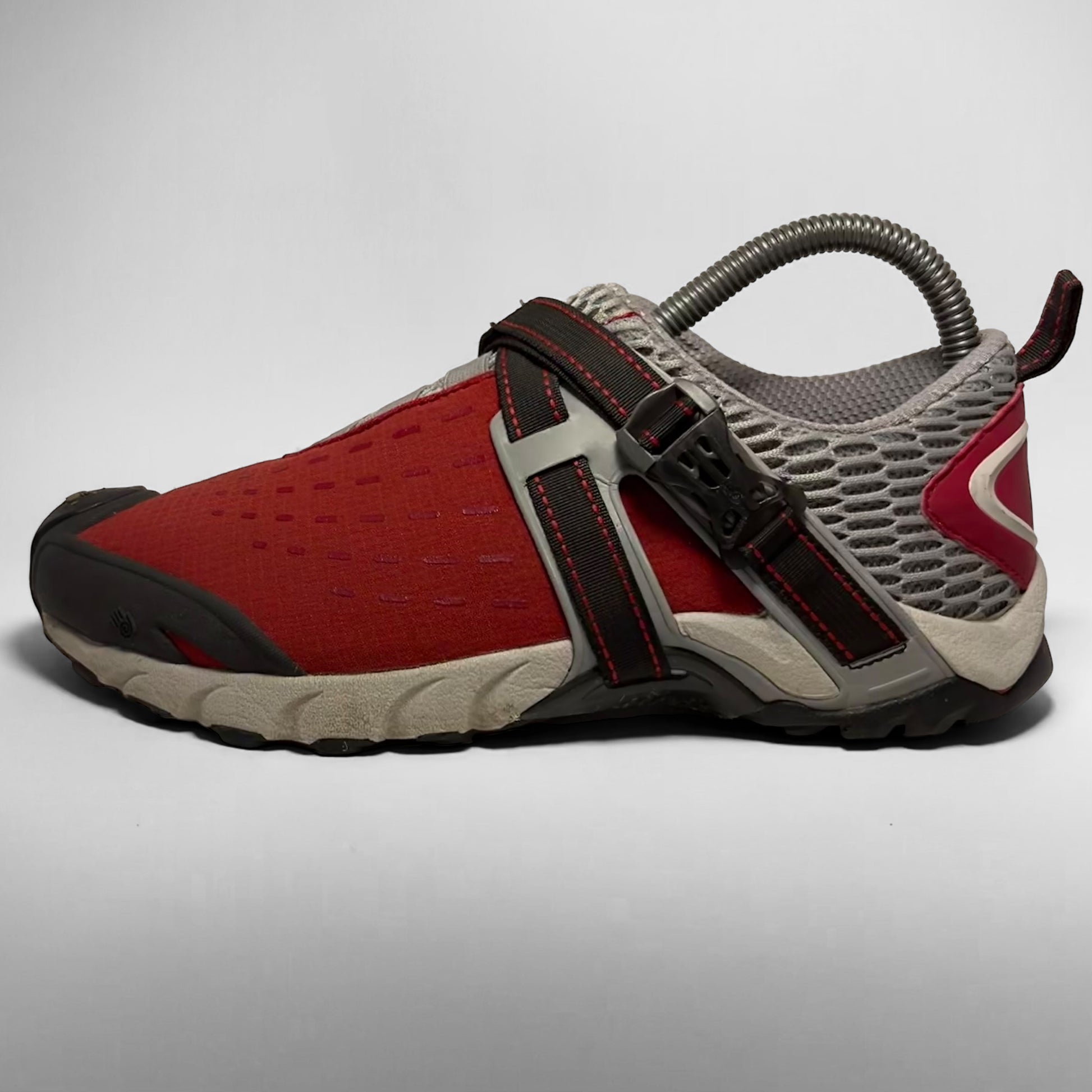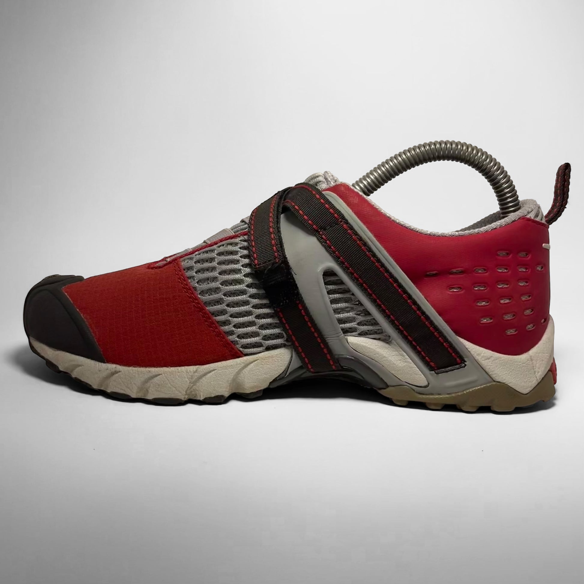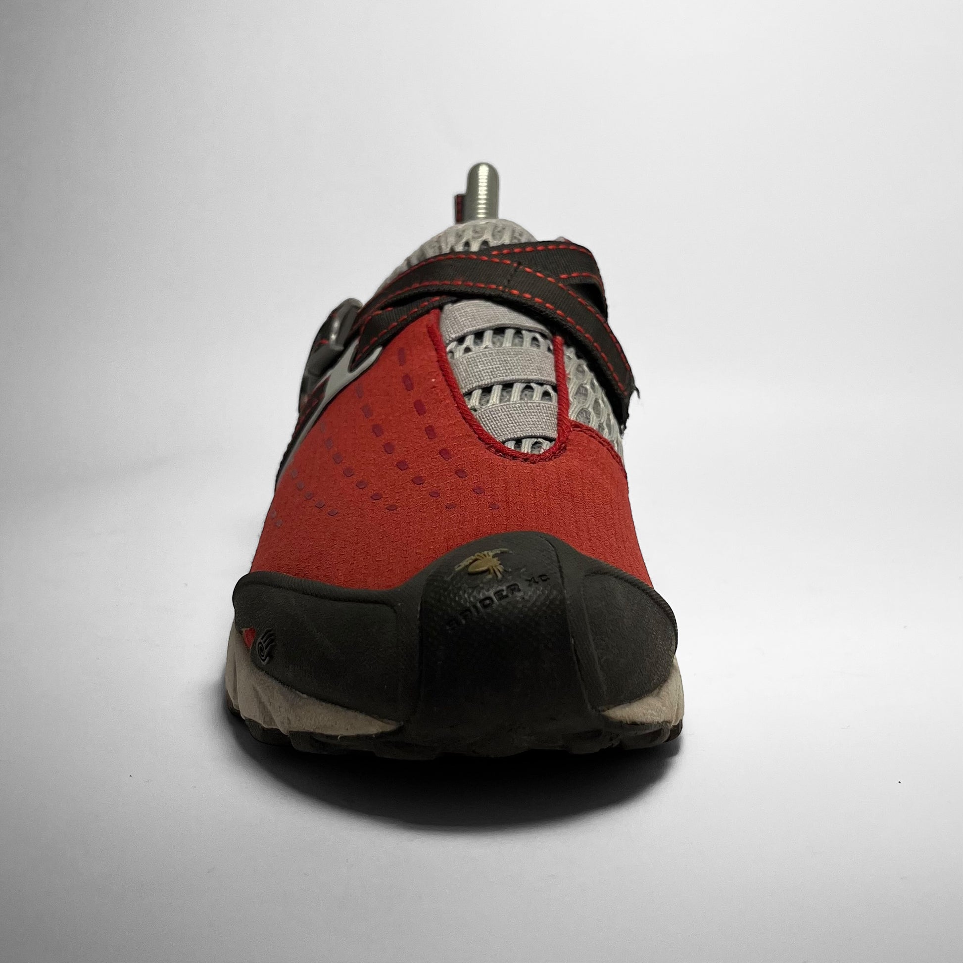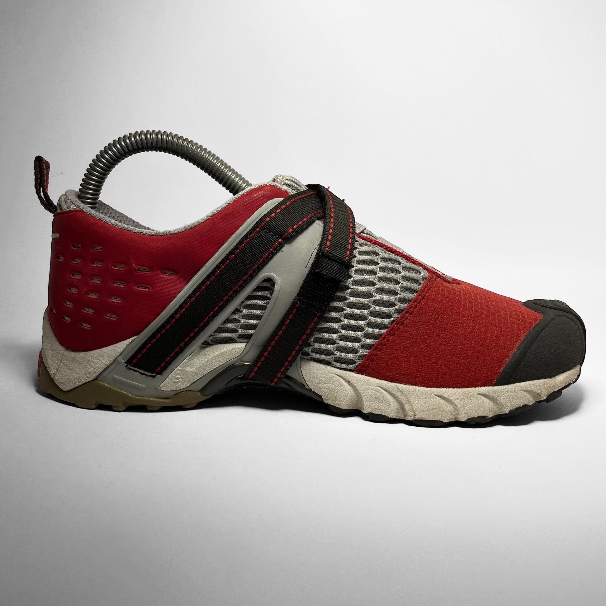 Slip-on model with mid-section wide pattern double layered grey mesh, soft checkered-pattern red upper including details, double wrapped black cotton woven strap with red stitching and press-closure, stretch material on the tongue, spider and script embossed branding on the front and Teva signature logo on the heel.