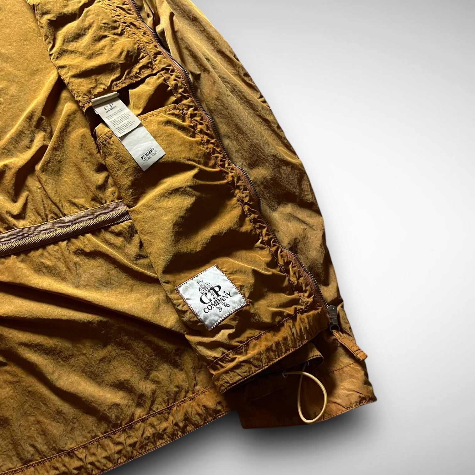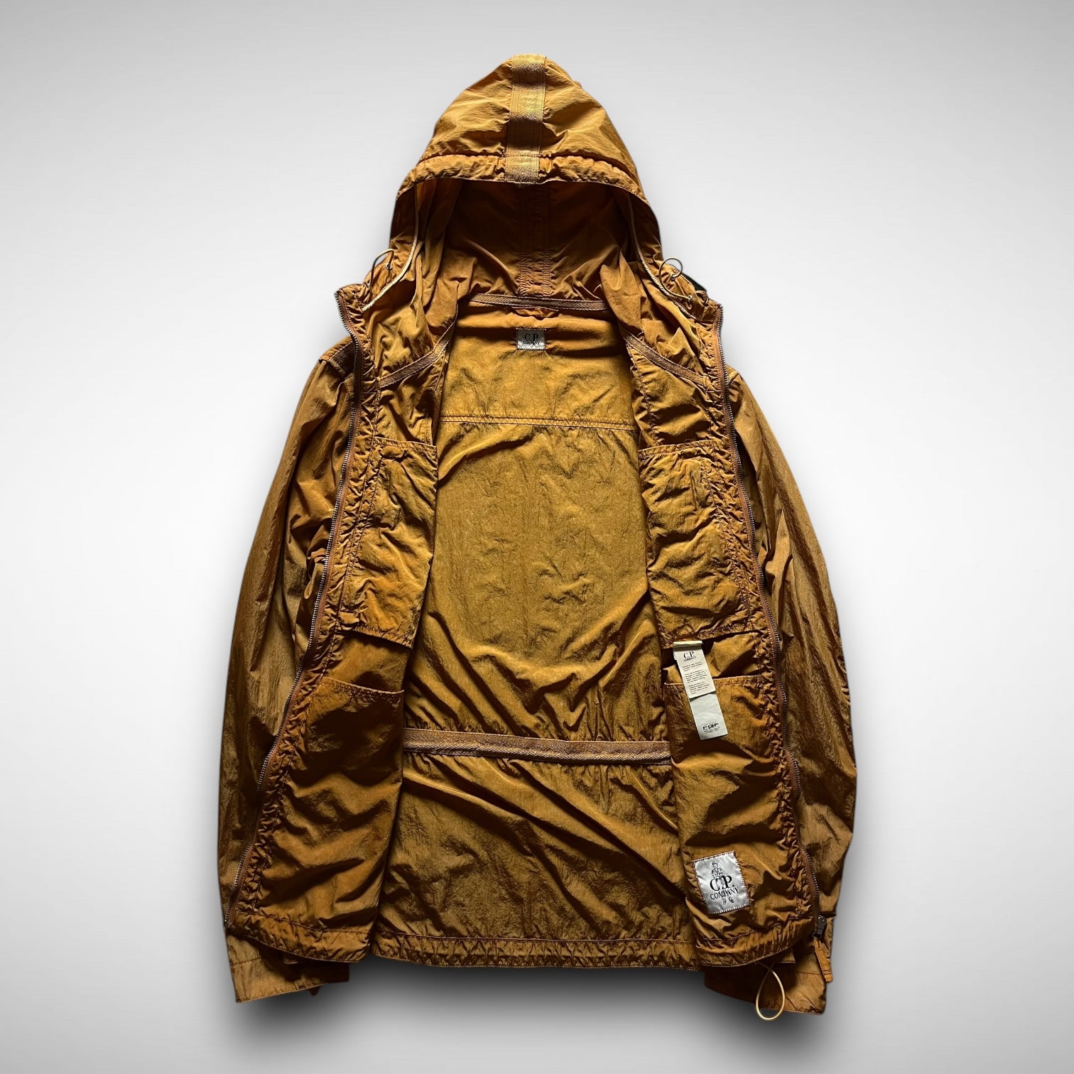 Crafted from lightweight garment-dyed crinkled nylon in a rich burnt ochre tone. Features vertical chest zip pockets, accented hood, shoulders and press-stud buttons with tightly woven cotton panels, and the adjustable hem and cuffs offer a customisable fit.