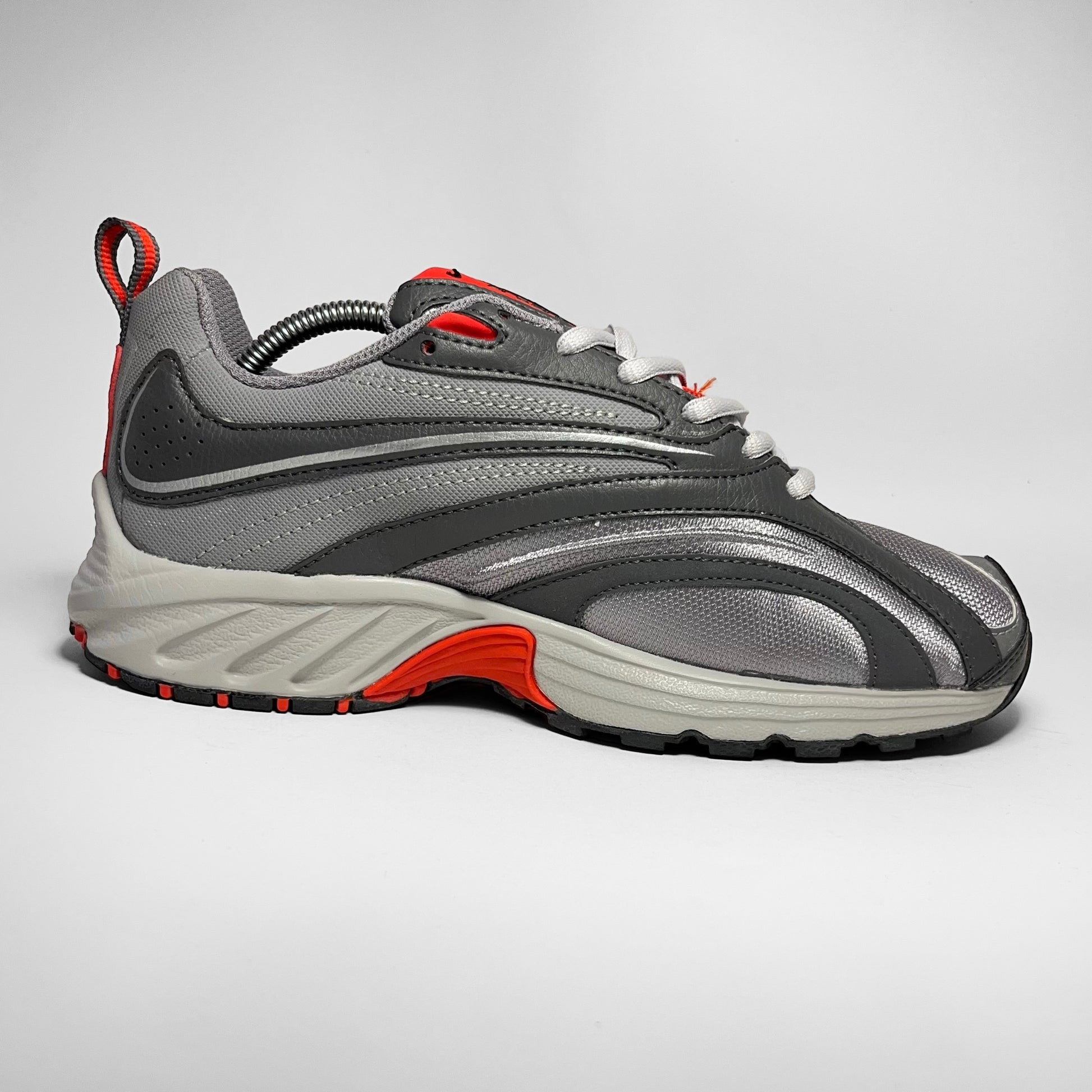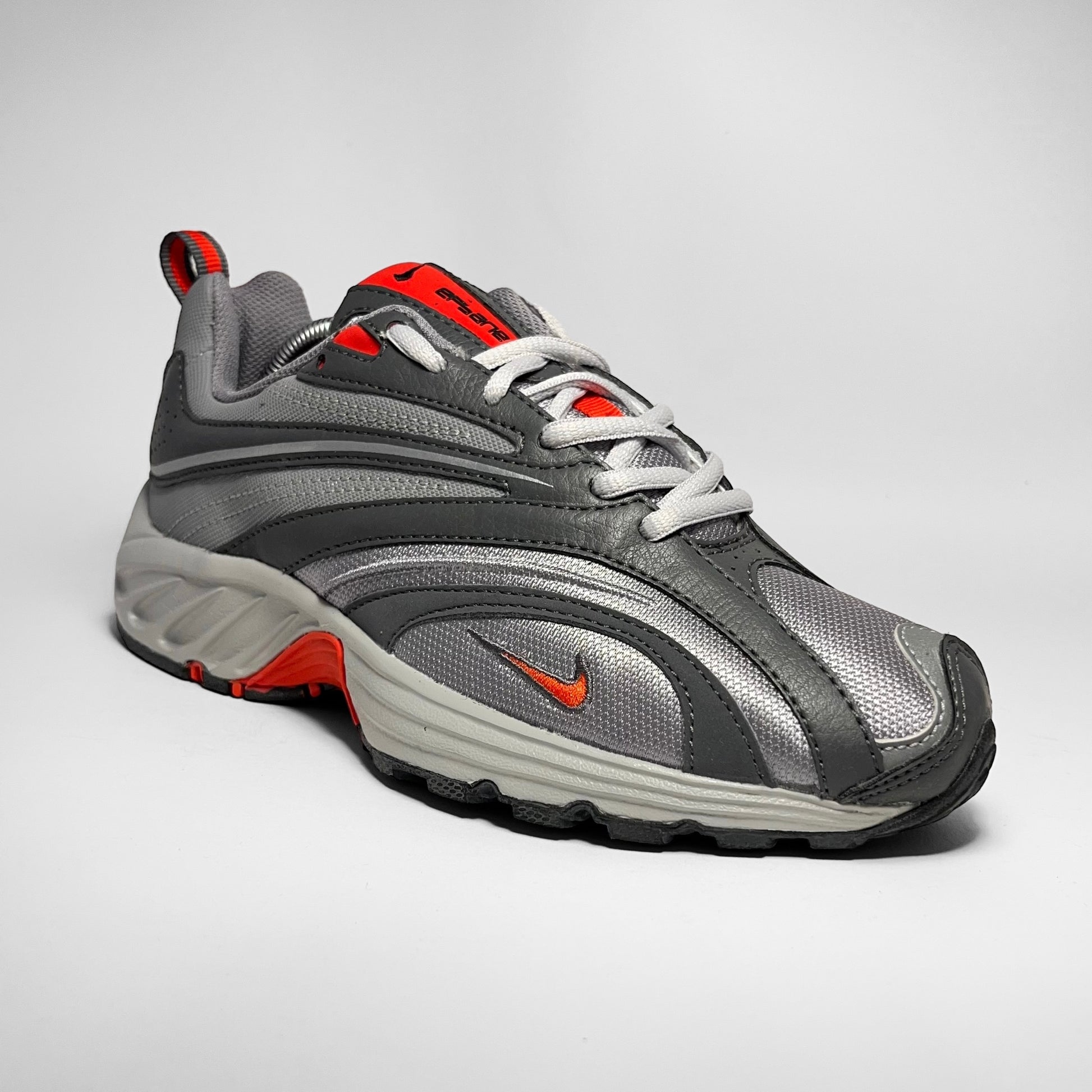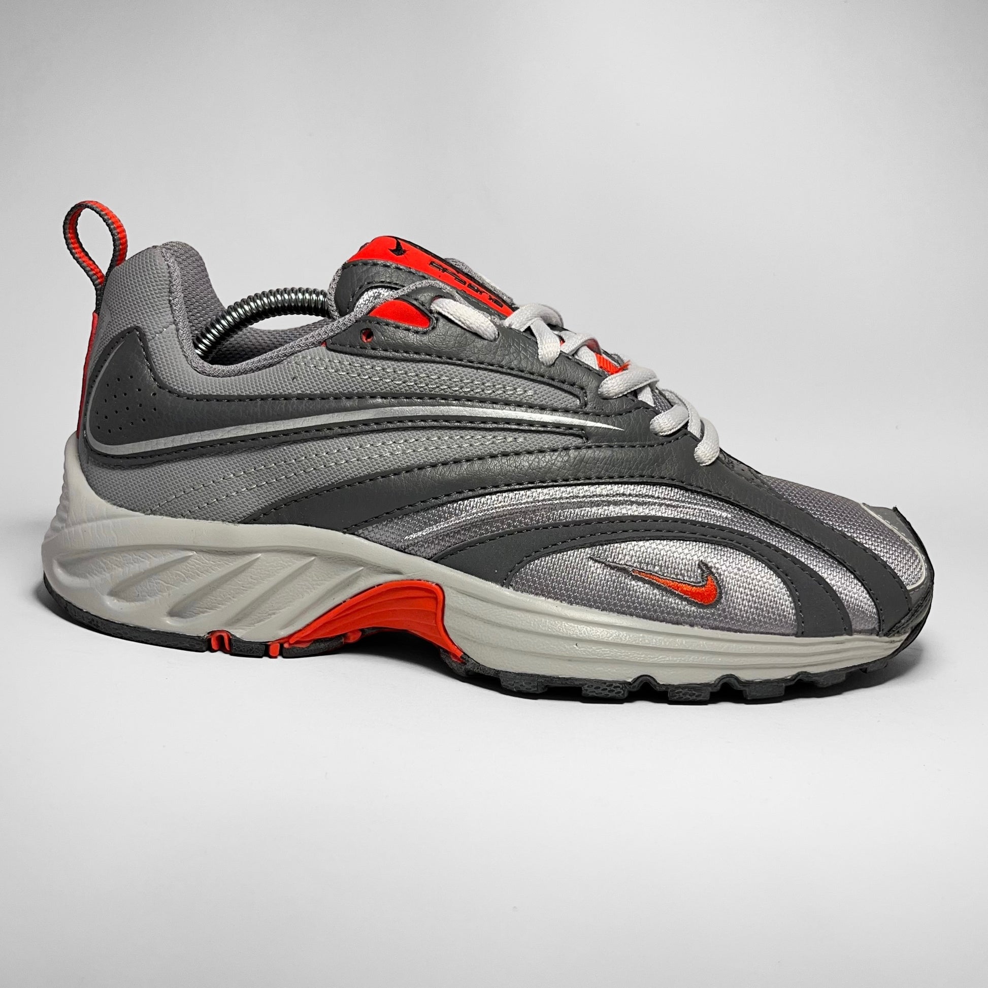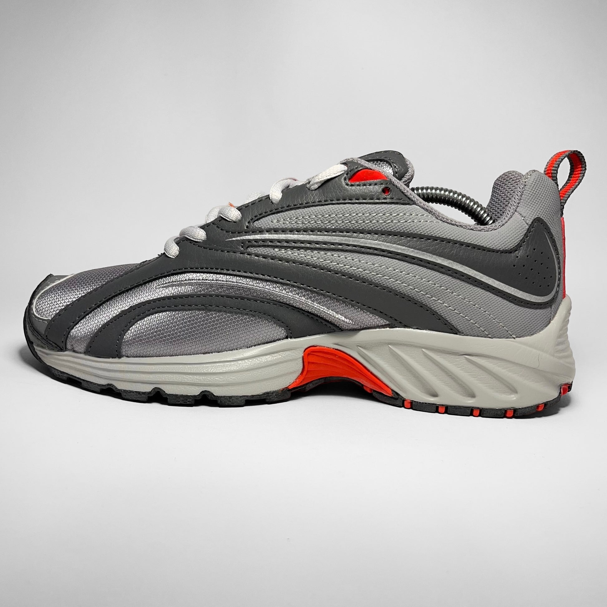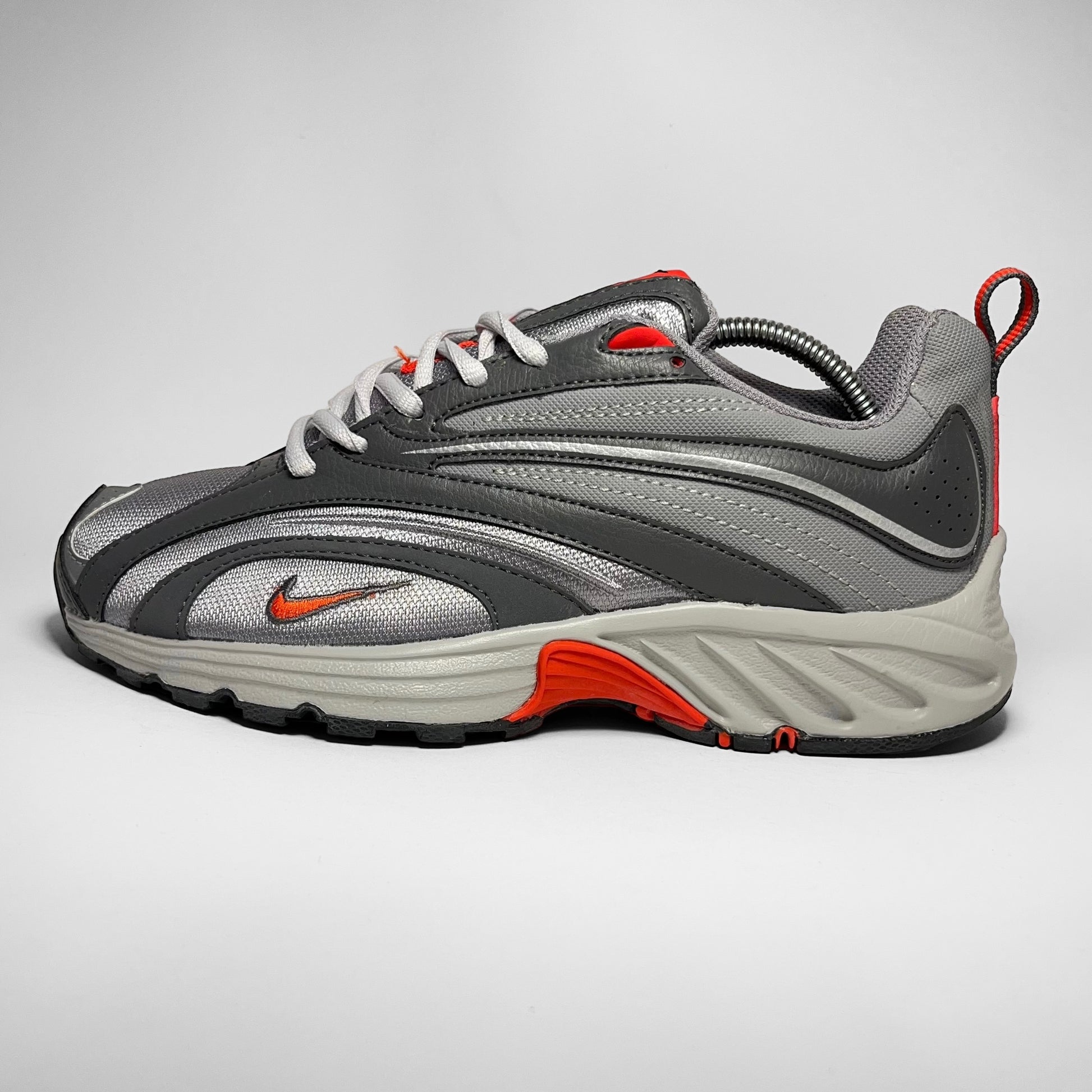 Unusual flowing shaped panels constructed out of leather, mesh and canvas with embroidery, print and perforated details in tones of grey, silver and orange branded panels, swoosh, heel-tab, tongue and outsole.