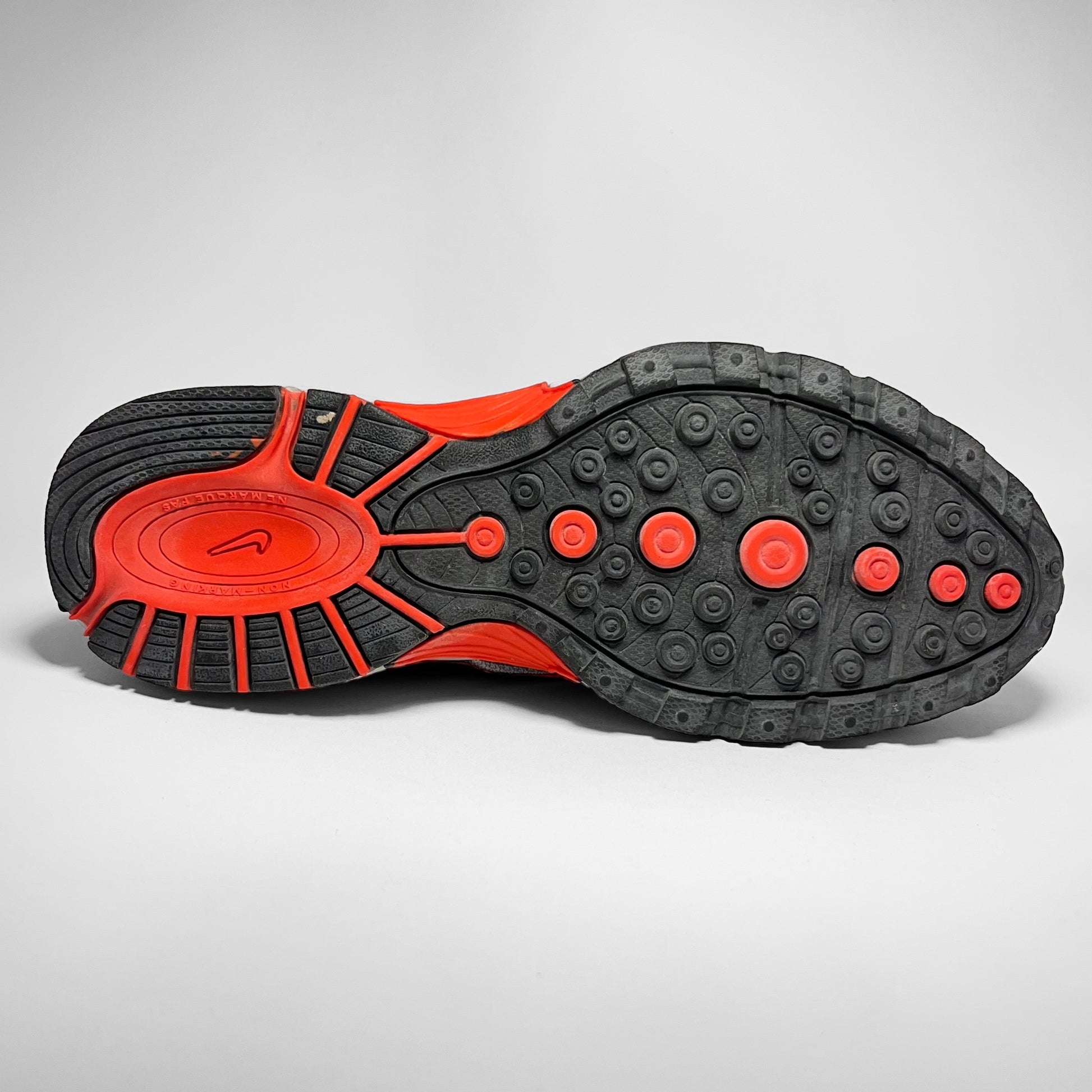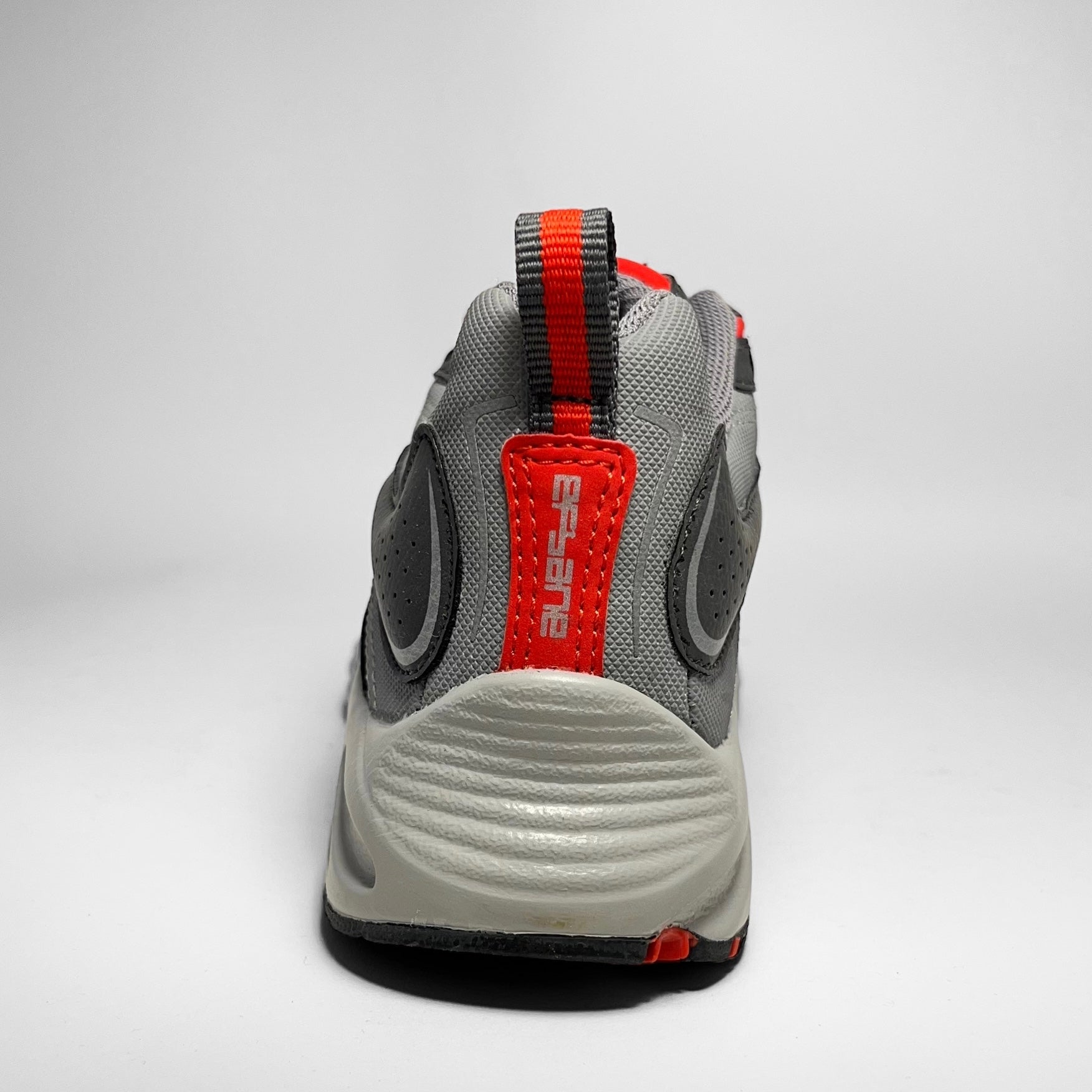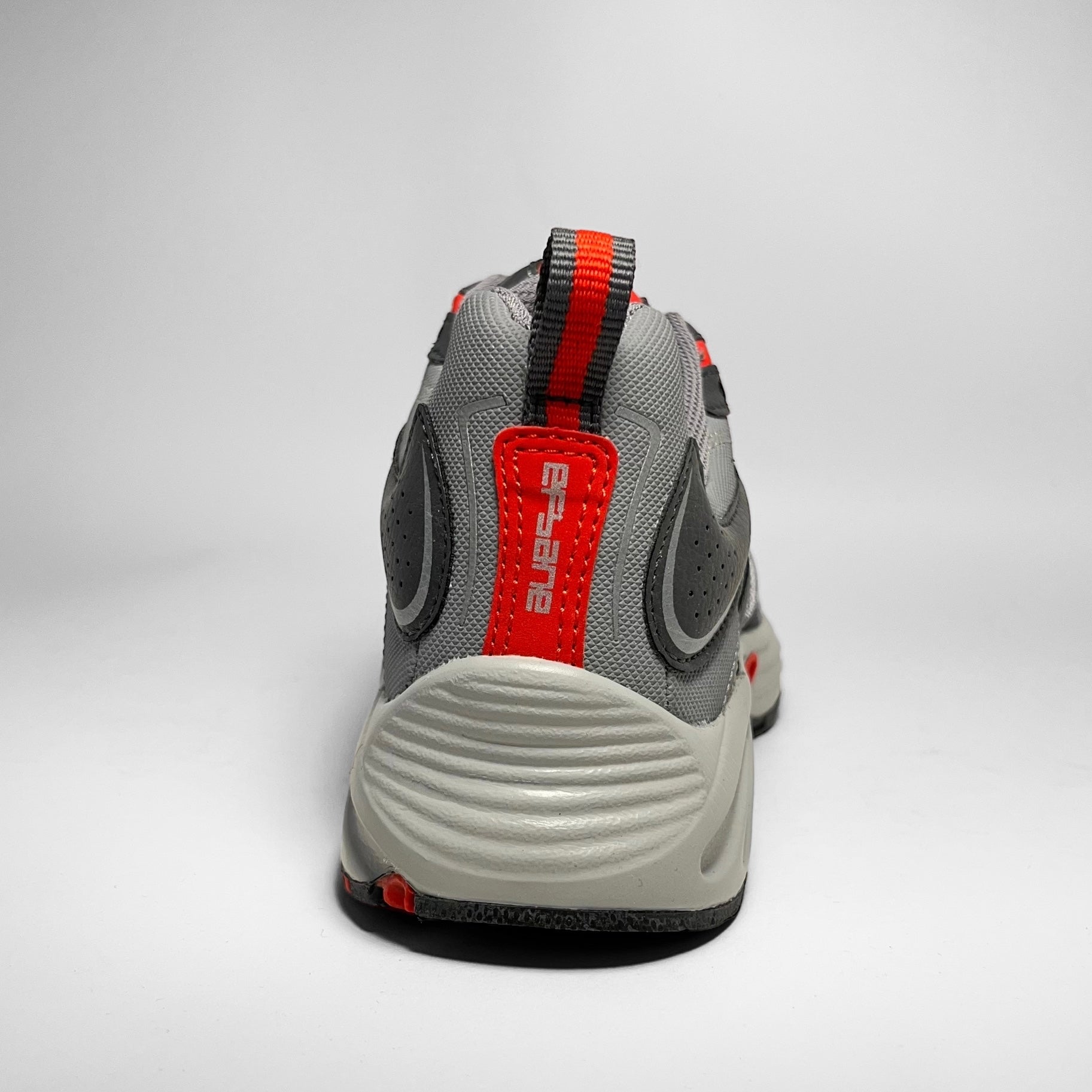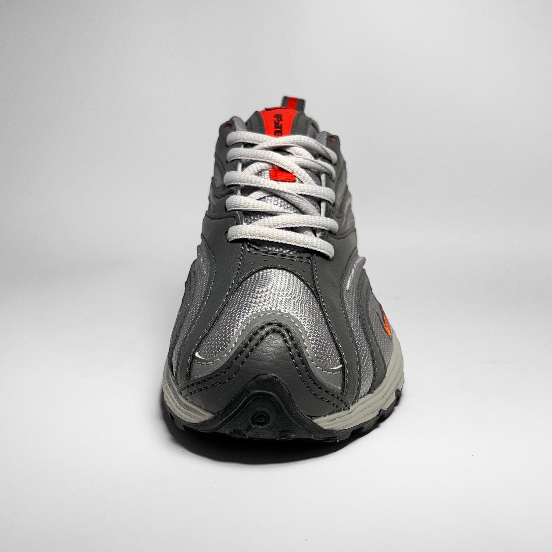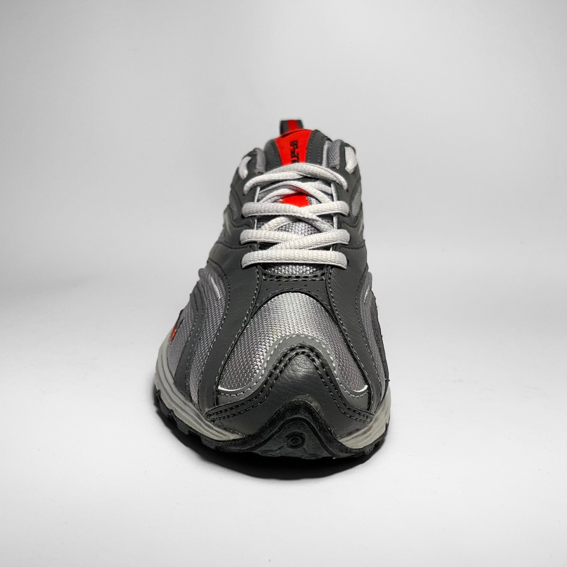 Unusual flowing shaped panels constructed out of leather, mesh and canvas with embroidery, print and perforated details in tones of grey, silver and orange branded panels, swoosh, heel-tab, tongue and outsole.