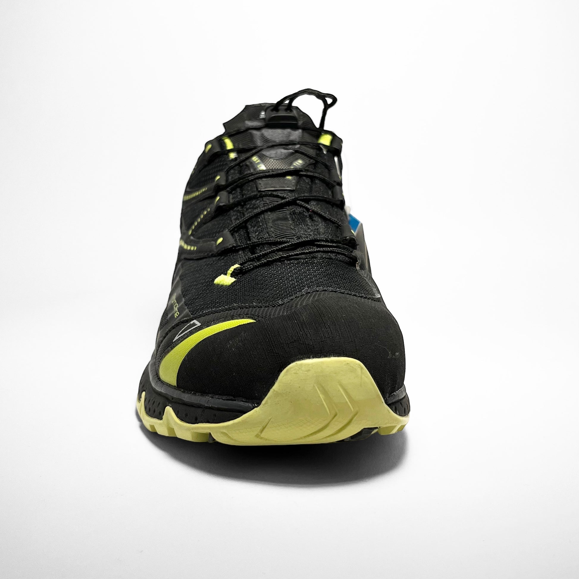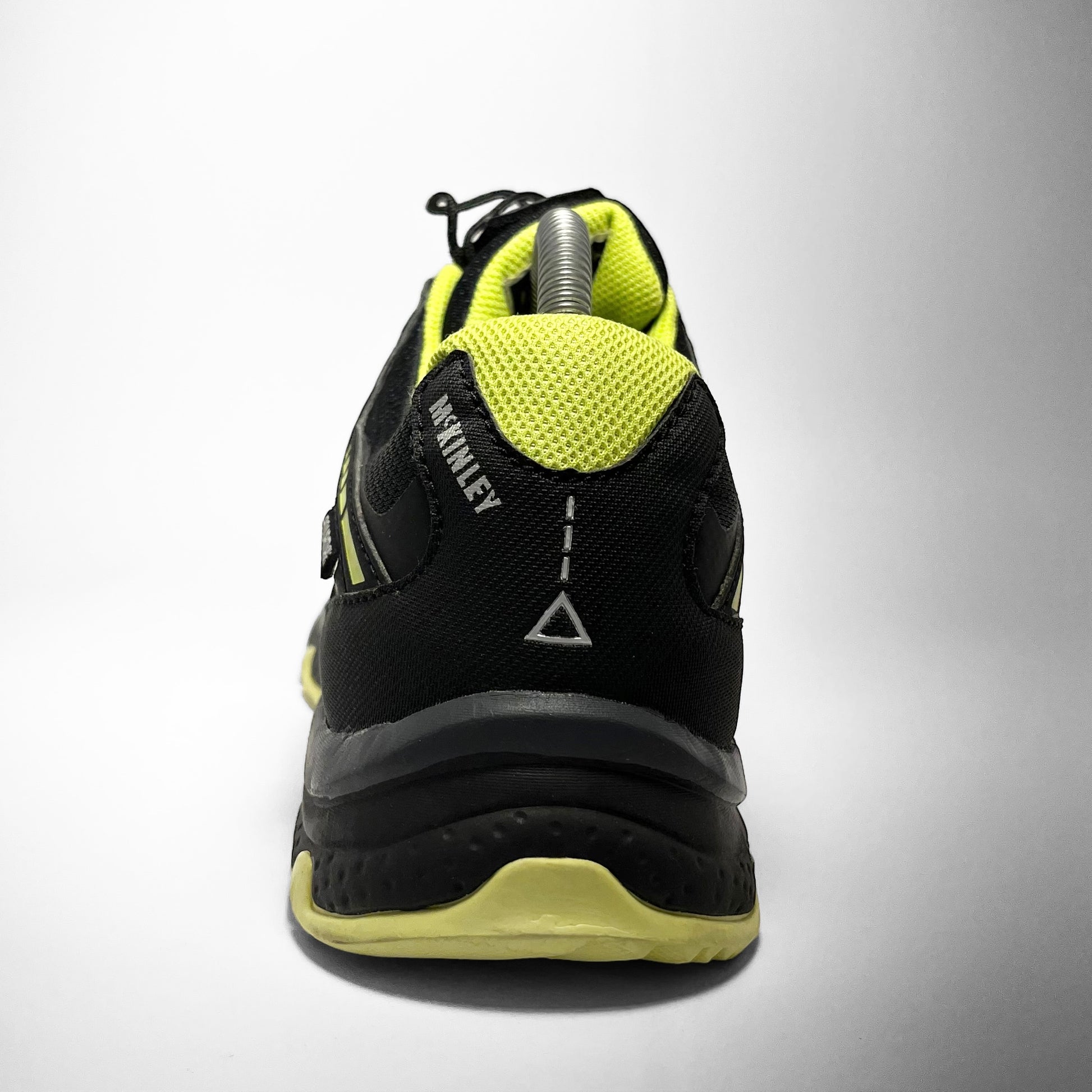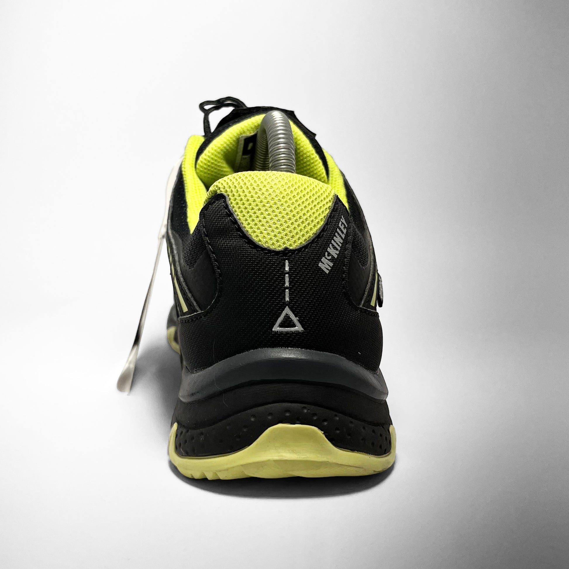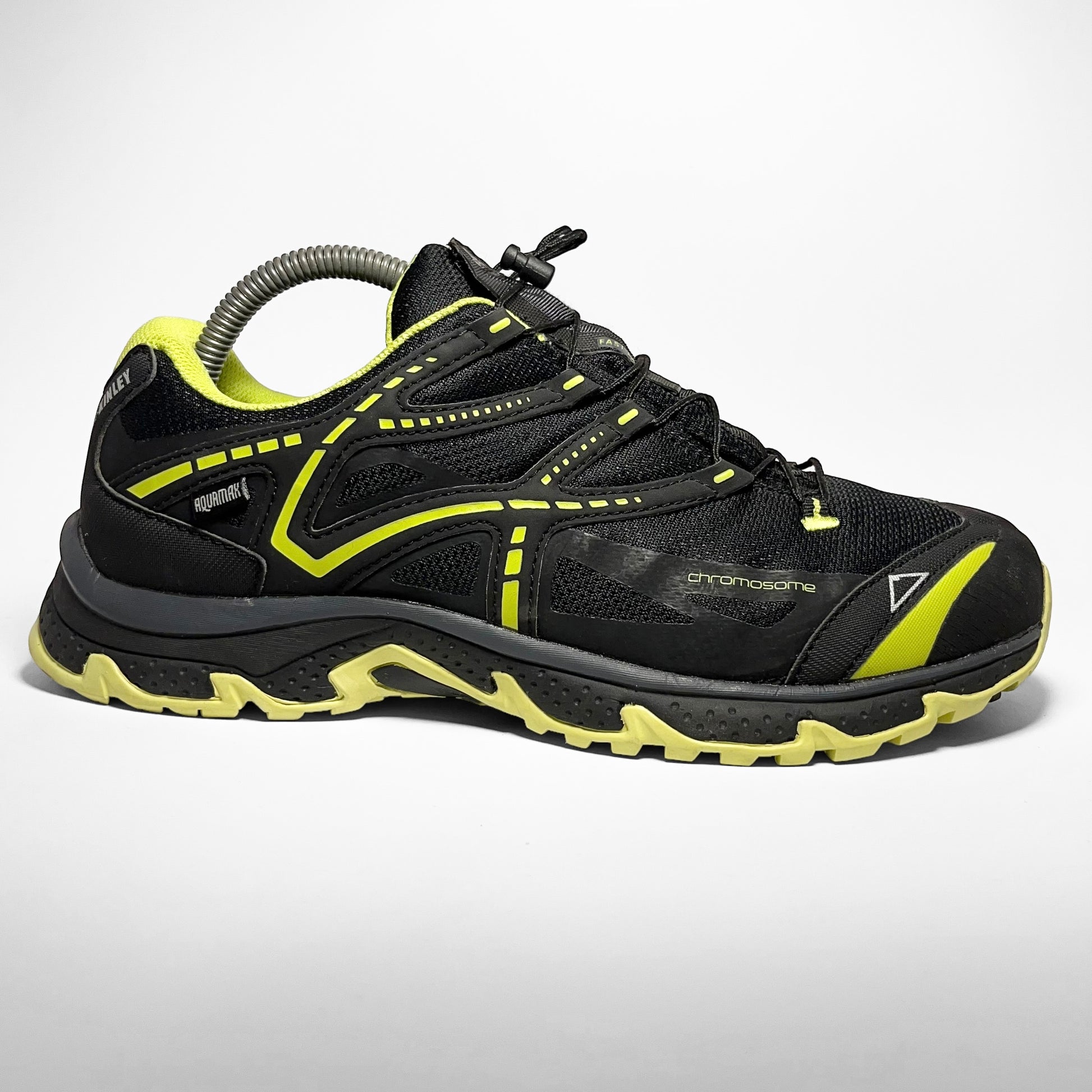 Waterproof black mesh and leather striking panels with Aquamax technology, lime details, double layered rubber mudguard.