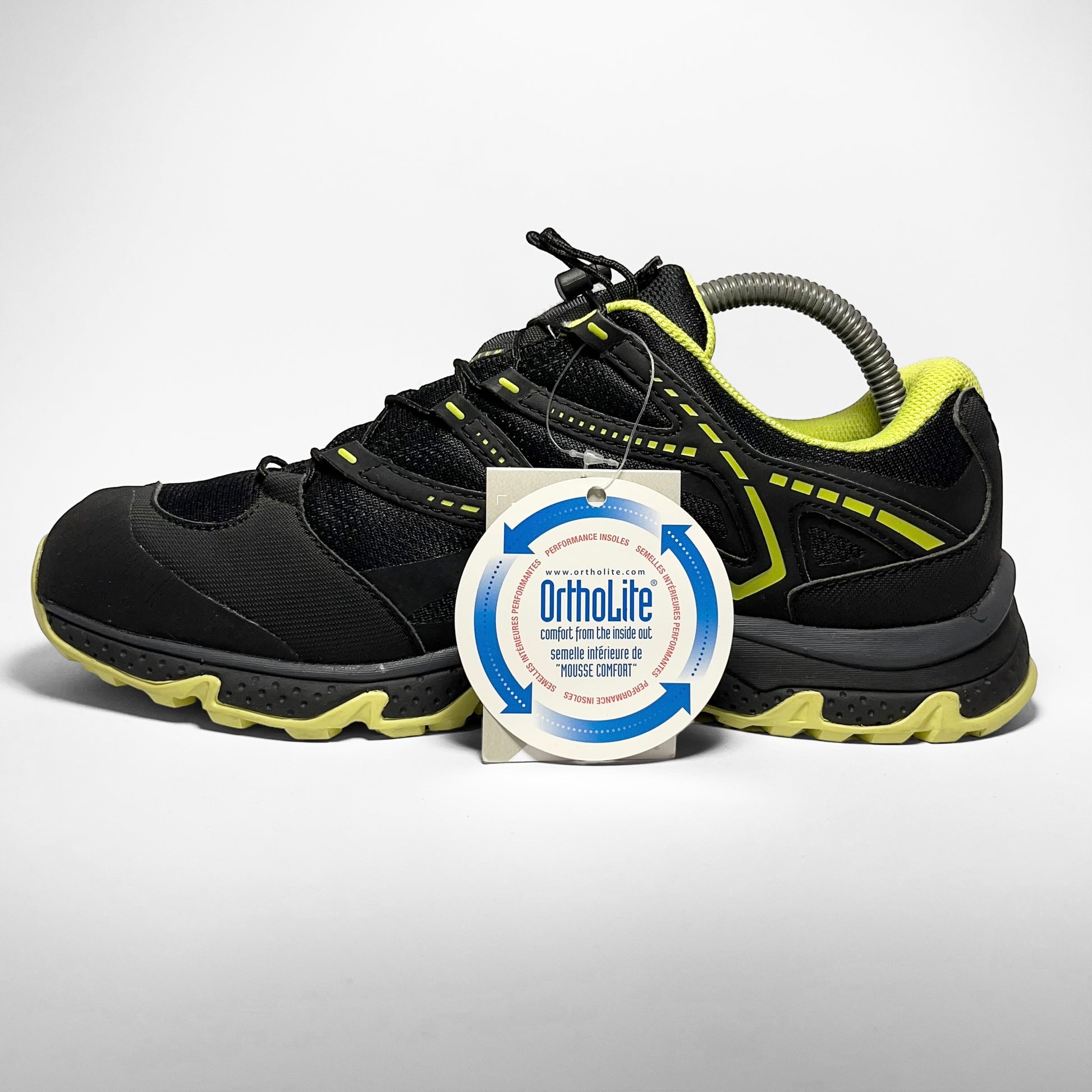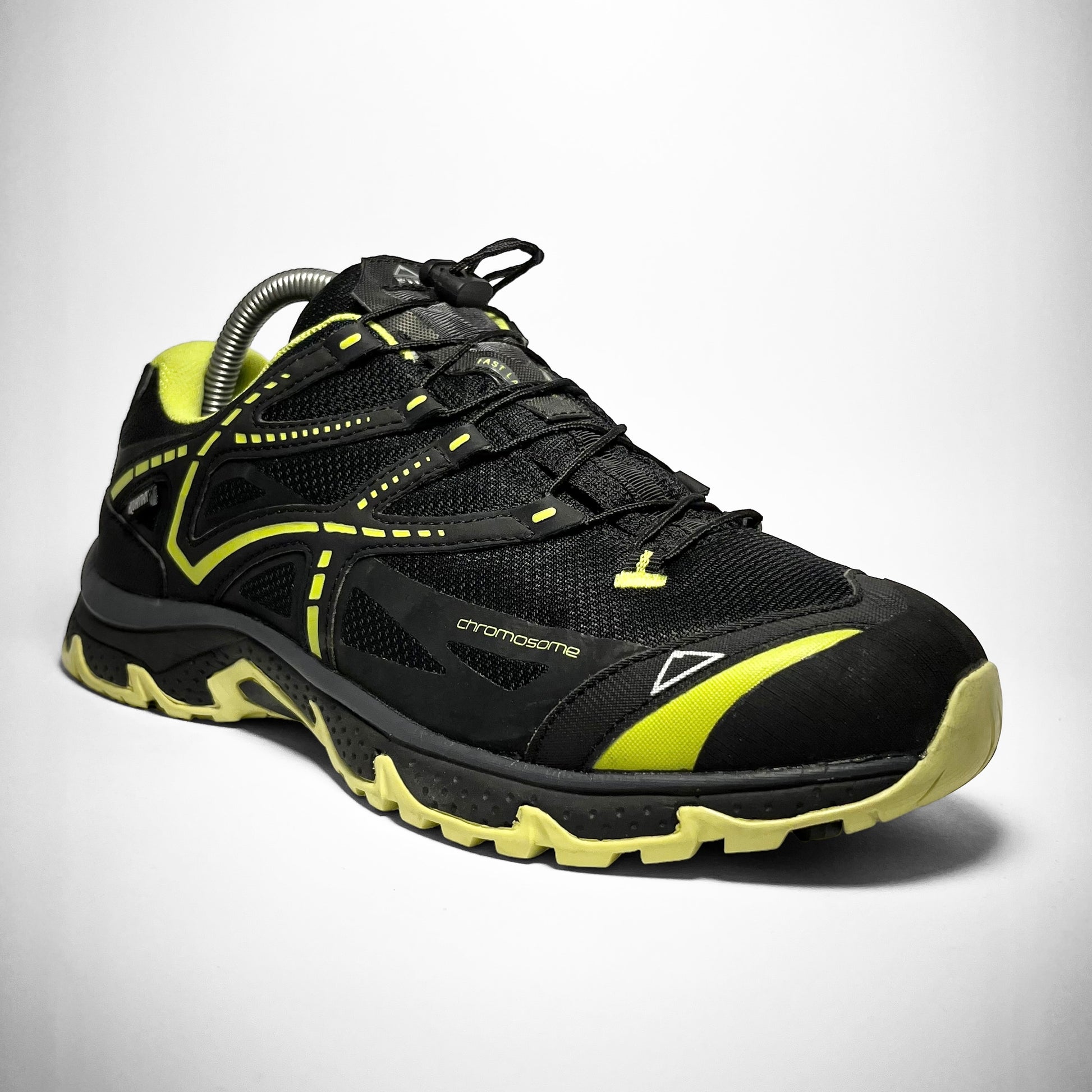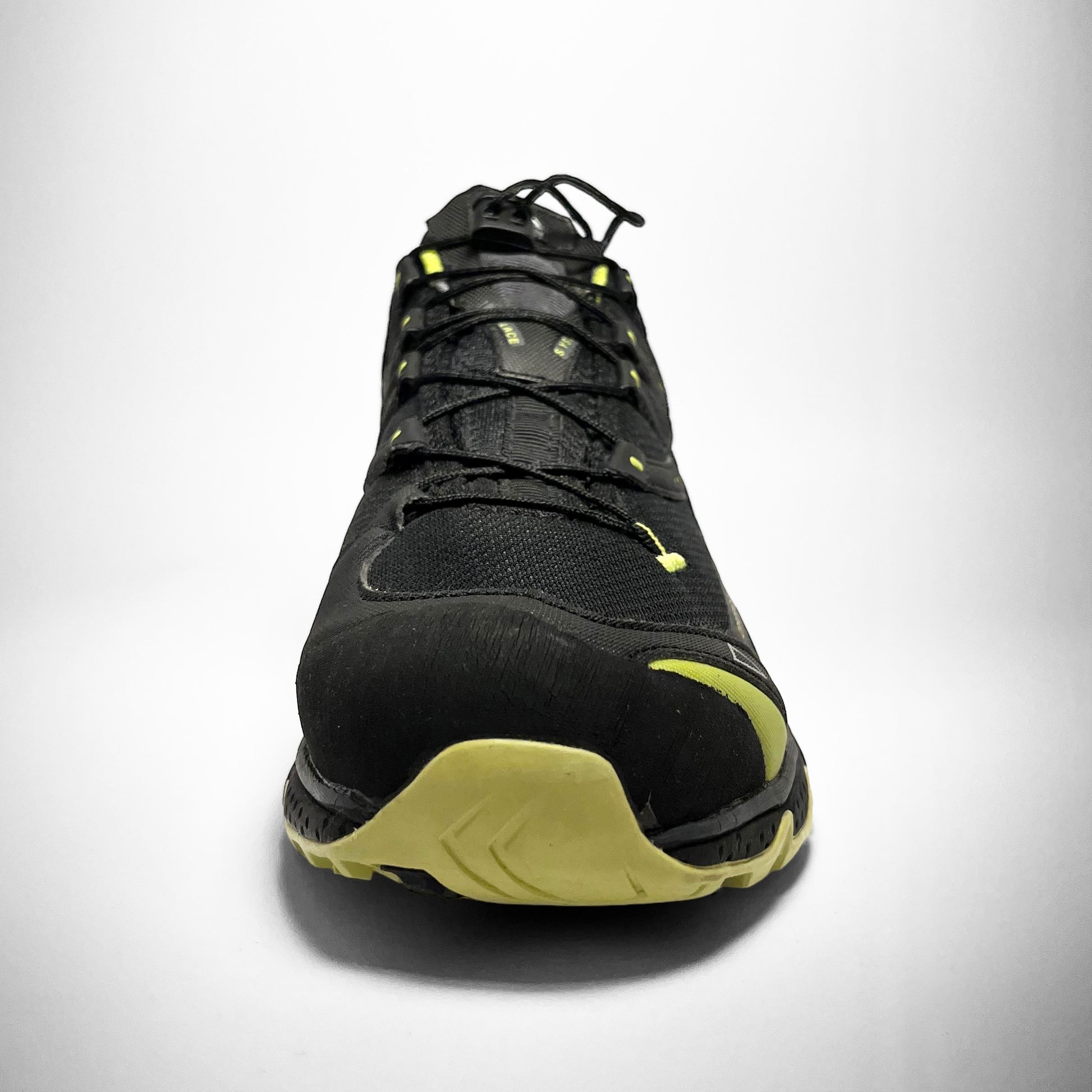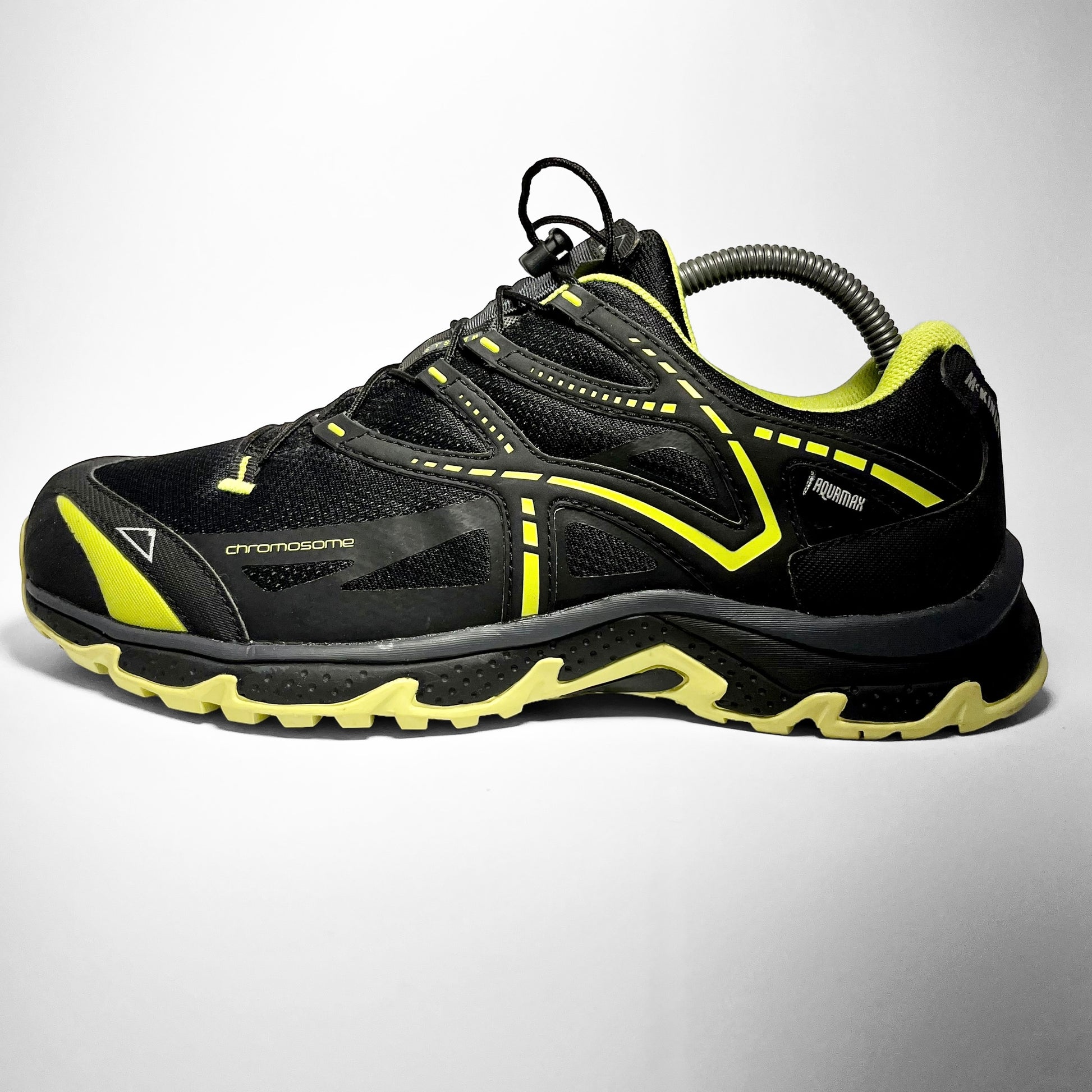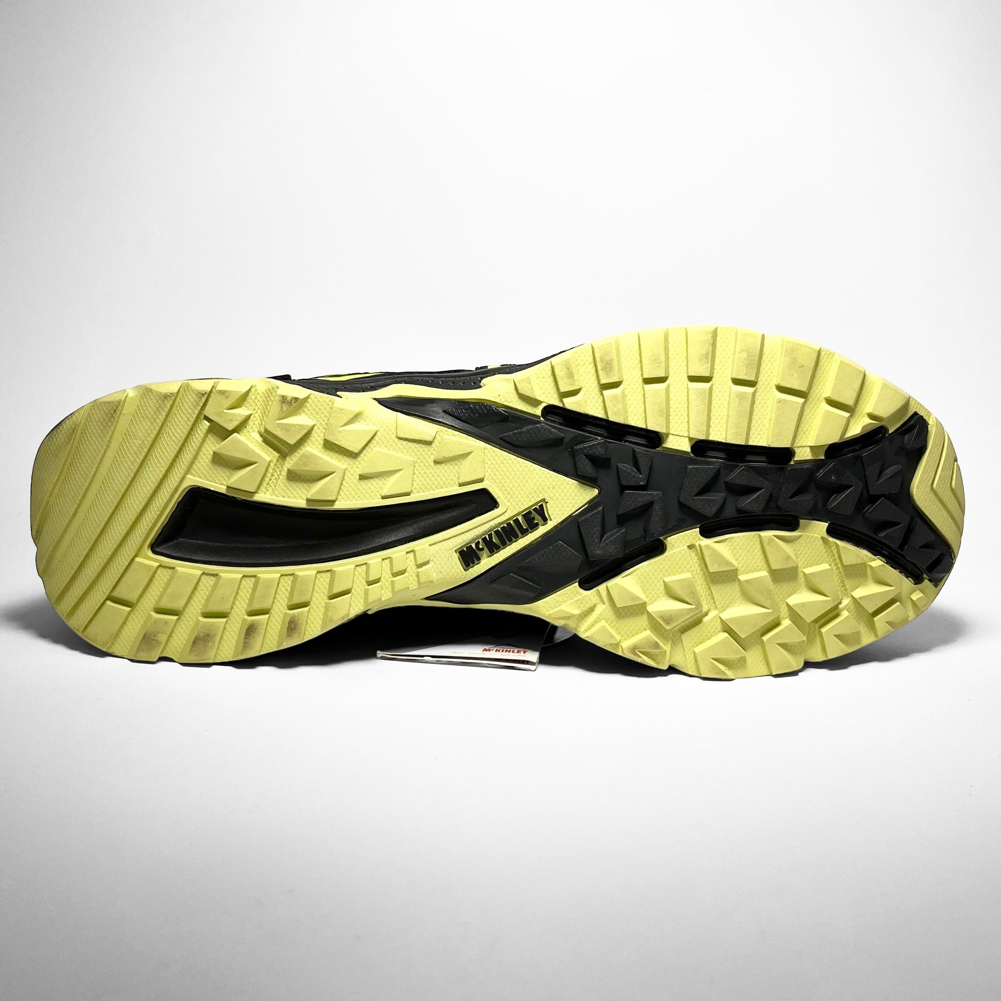 Waterproof black mesh and leather striking panels with Aquamax technology, lime details, double layered rubber mudguard.