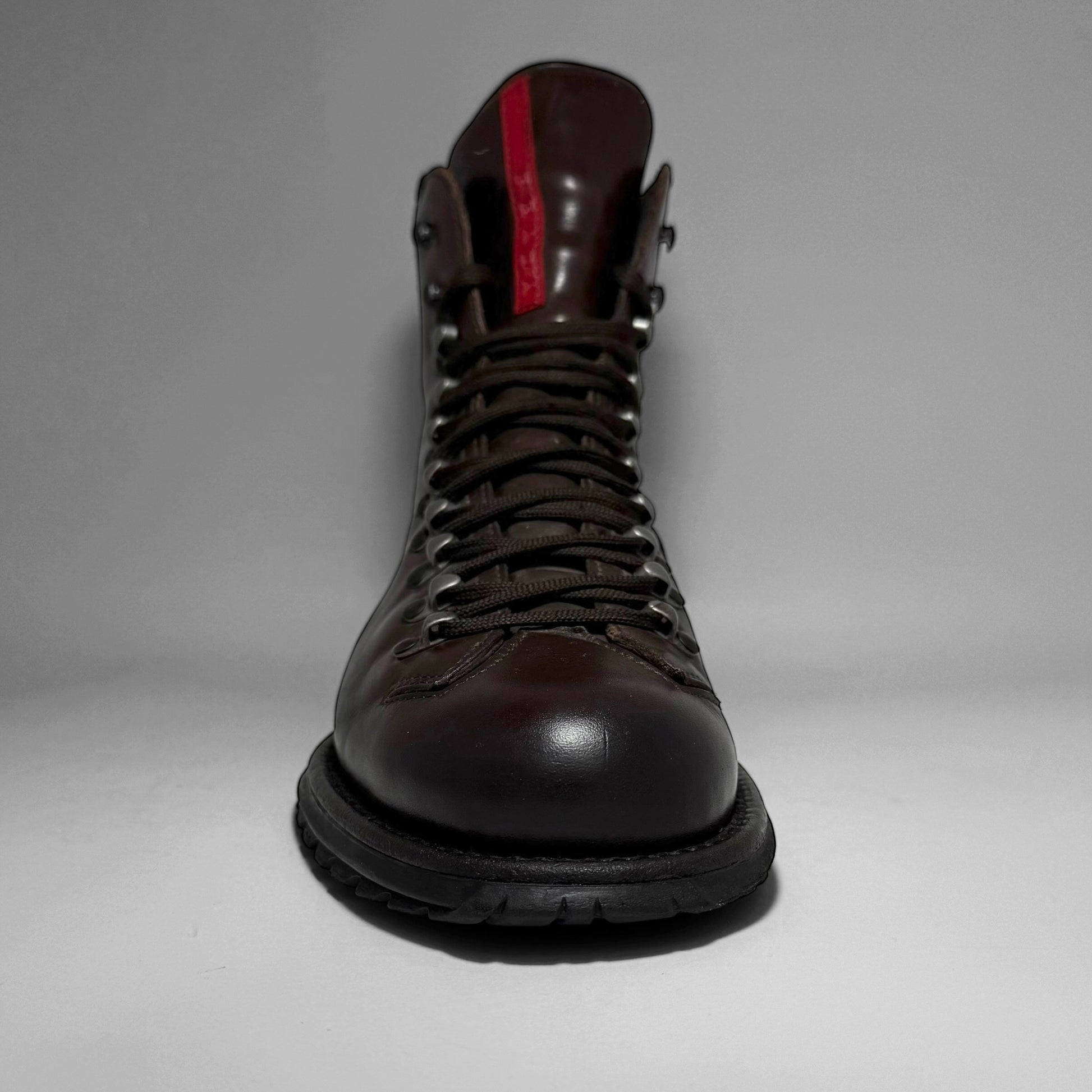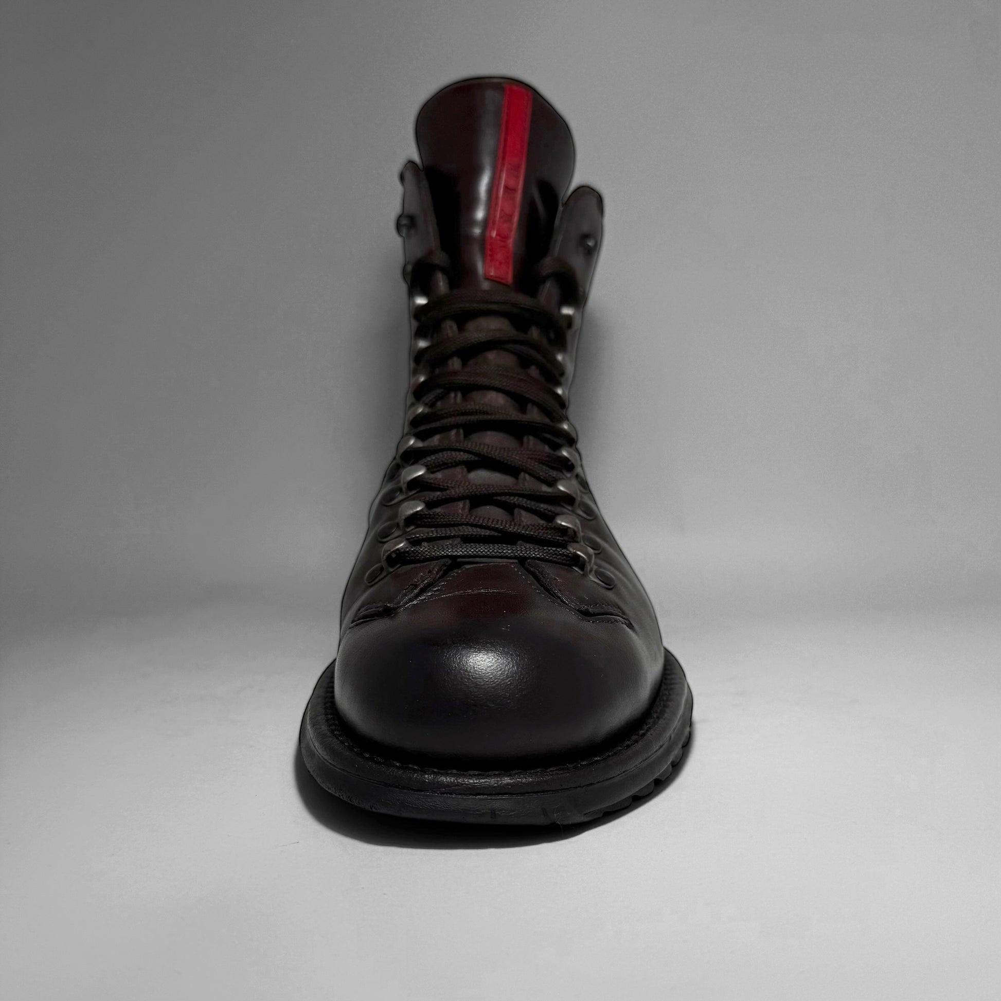 High-cut boots in dark brown leather with metal D-ring lace system, lugged rubber sole, and signature red Prada tab on the tongue and heel.
