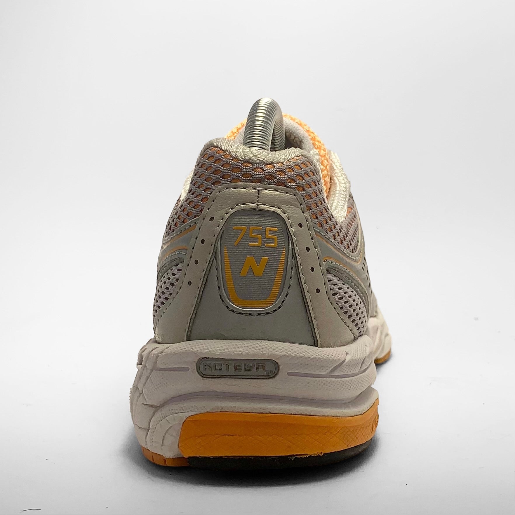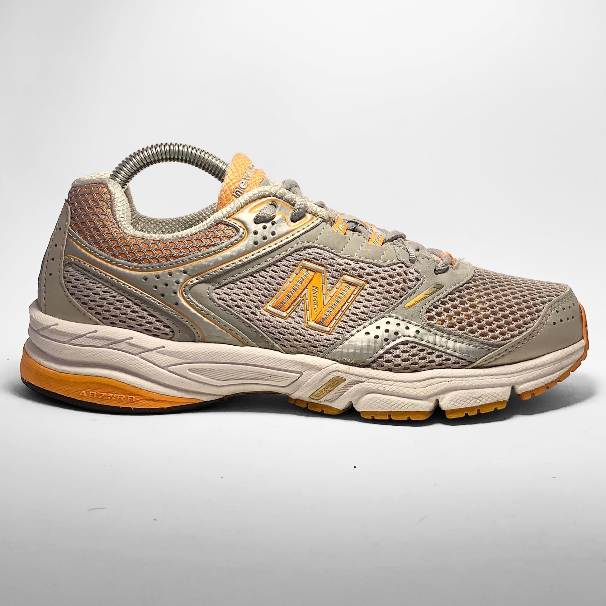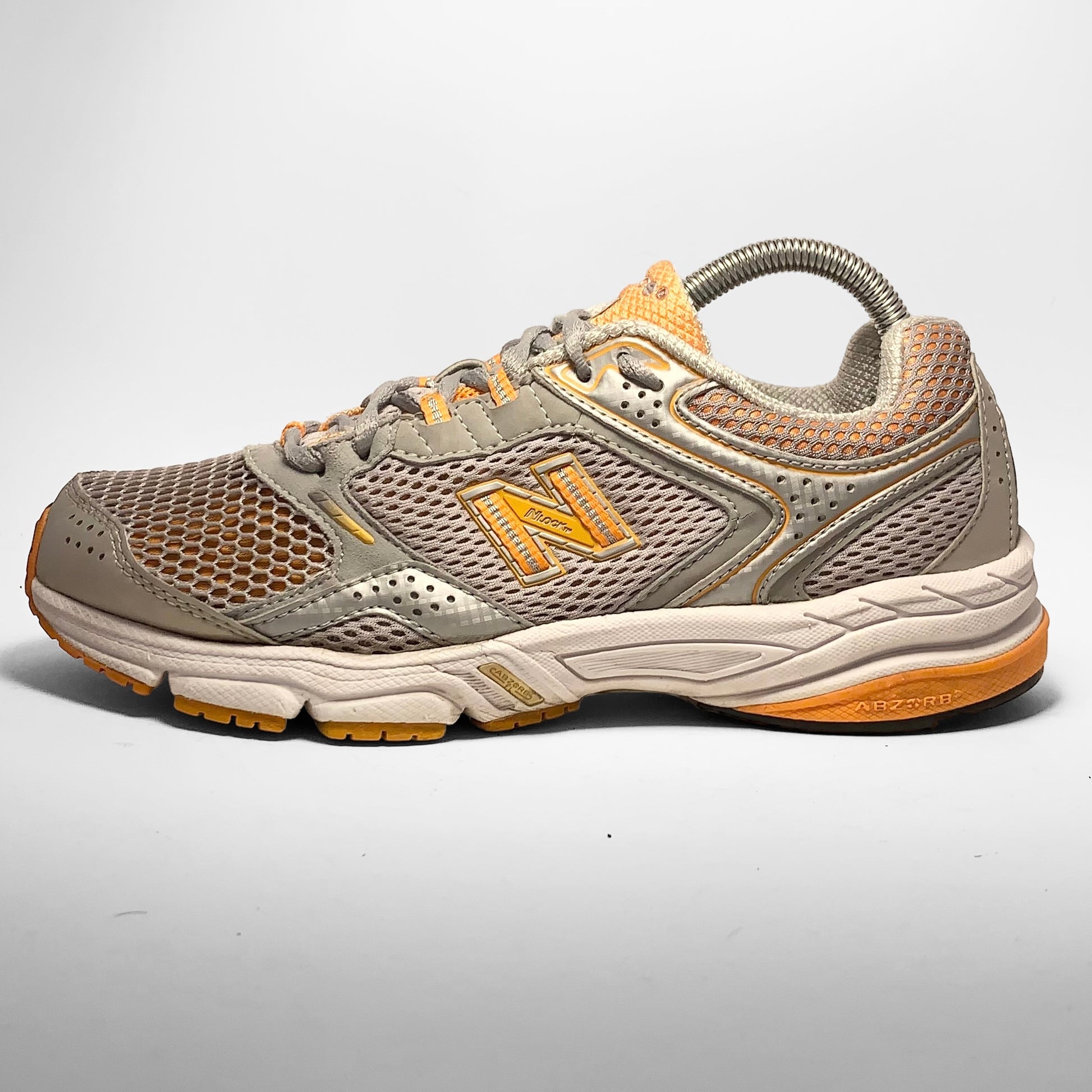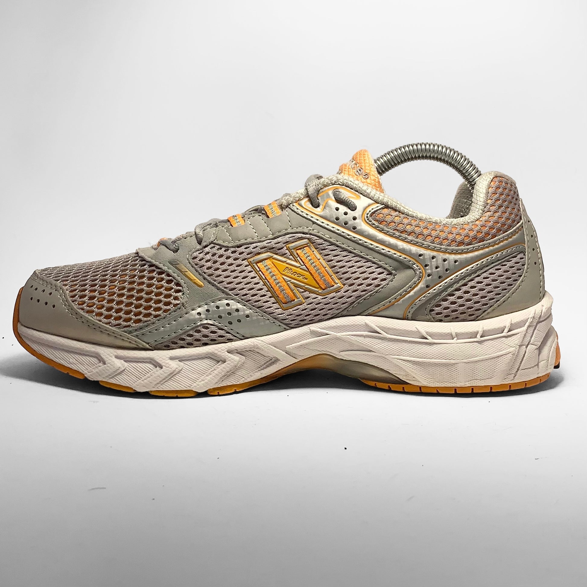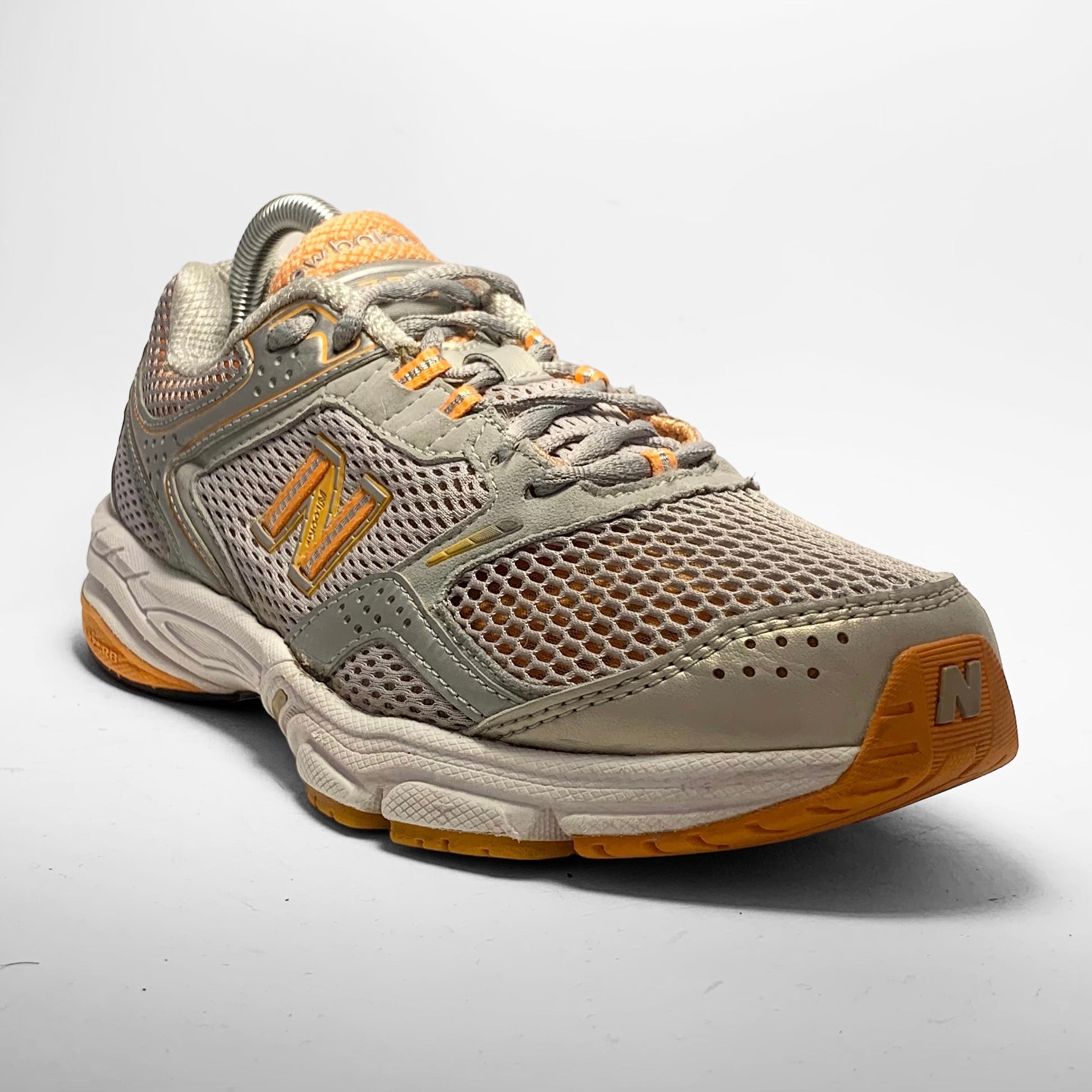 Grey mesh body in various patterns and the collar having an orange lower-layer, silver checkered print detailed panels as well as orange embossed lining and perforated vents throughout, grey suede panel on forefoot holding the lacing system in place with cotton woven orange and grey detailed straps and further orange and silver details such as tongue, branding on heel and top, outsole, mid-sole and N-lock cotton branded strap on the sides.